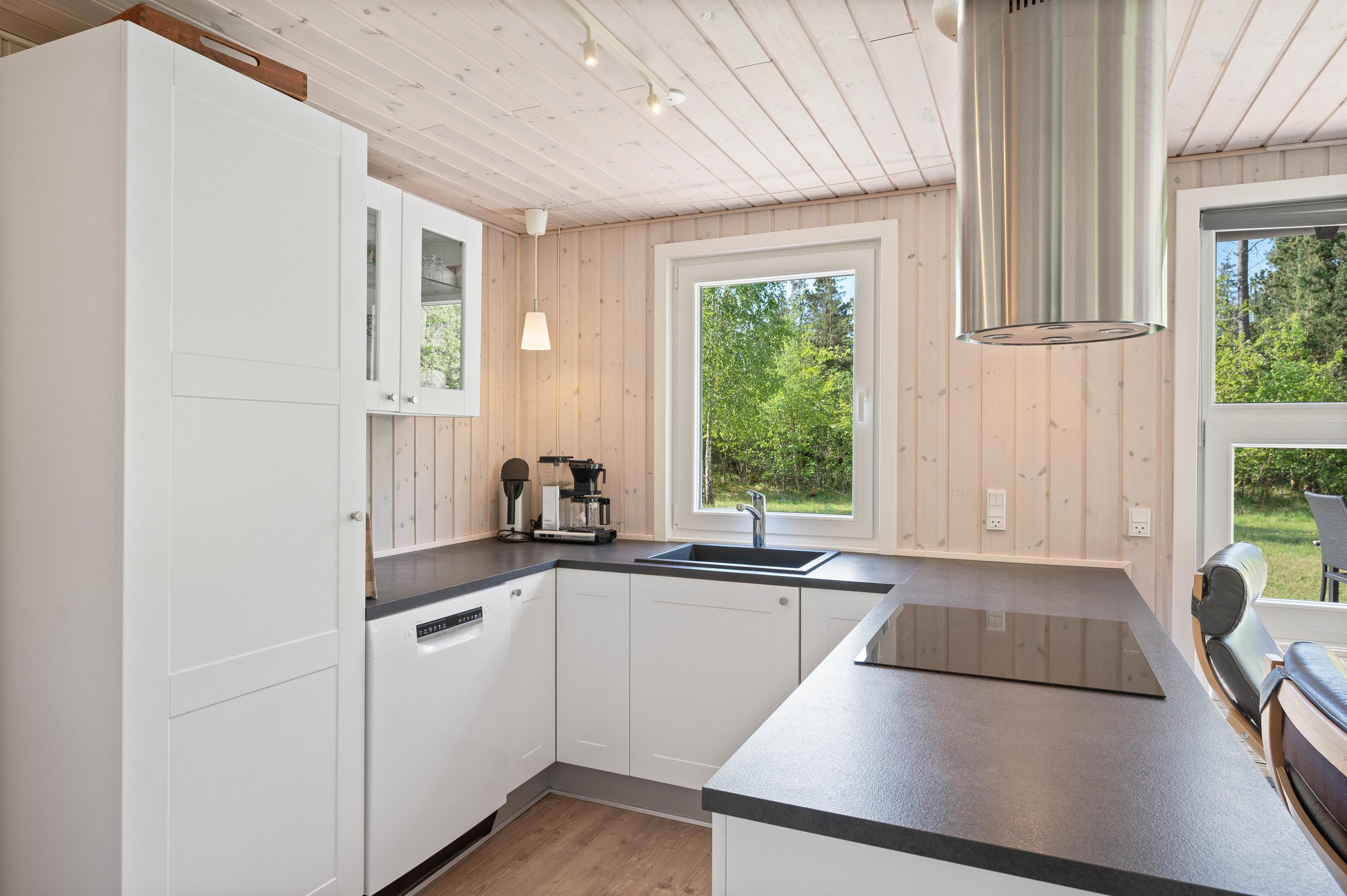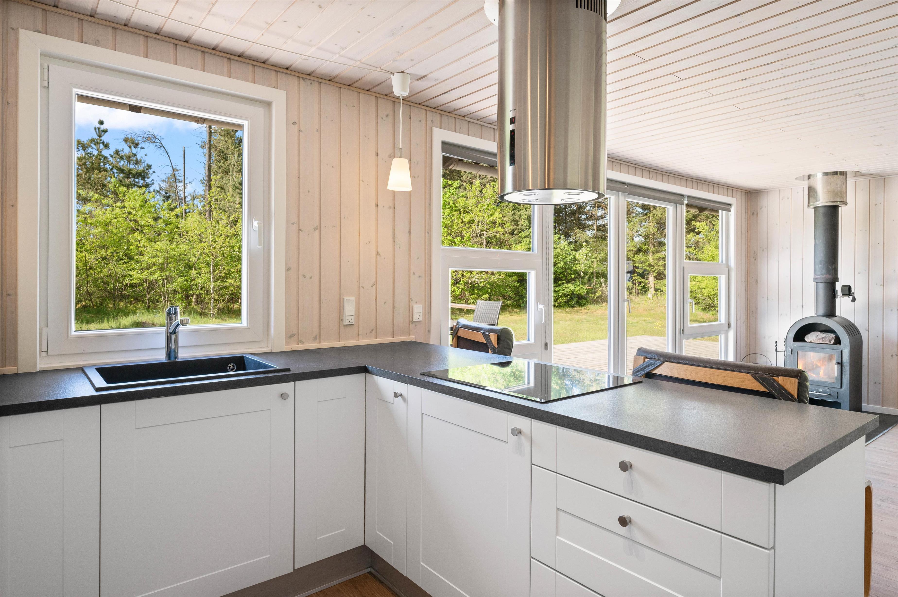 Køkkenet er super veludstyret og ligger i åben forbindelse til stuen og spiseafdelingen. Her kan I samles om madlavningen med et glas rødvin ved siden af, og selvfølgelig brændeovnens knitren i baggrunden.