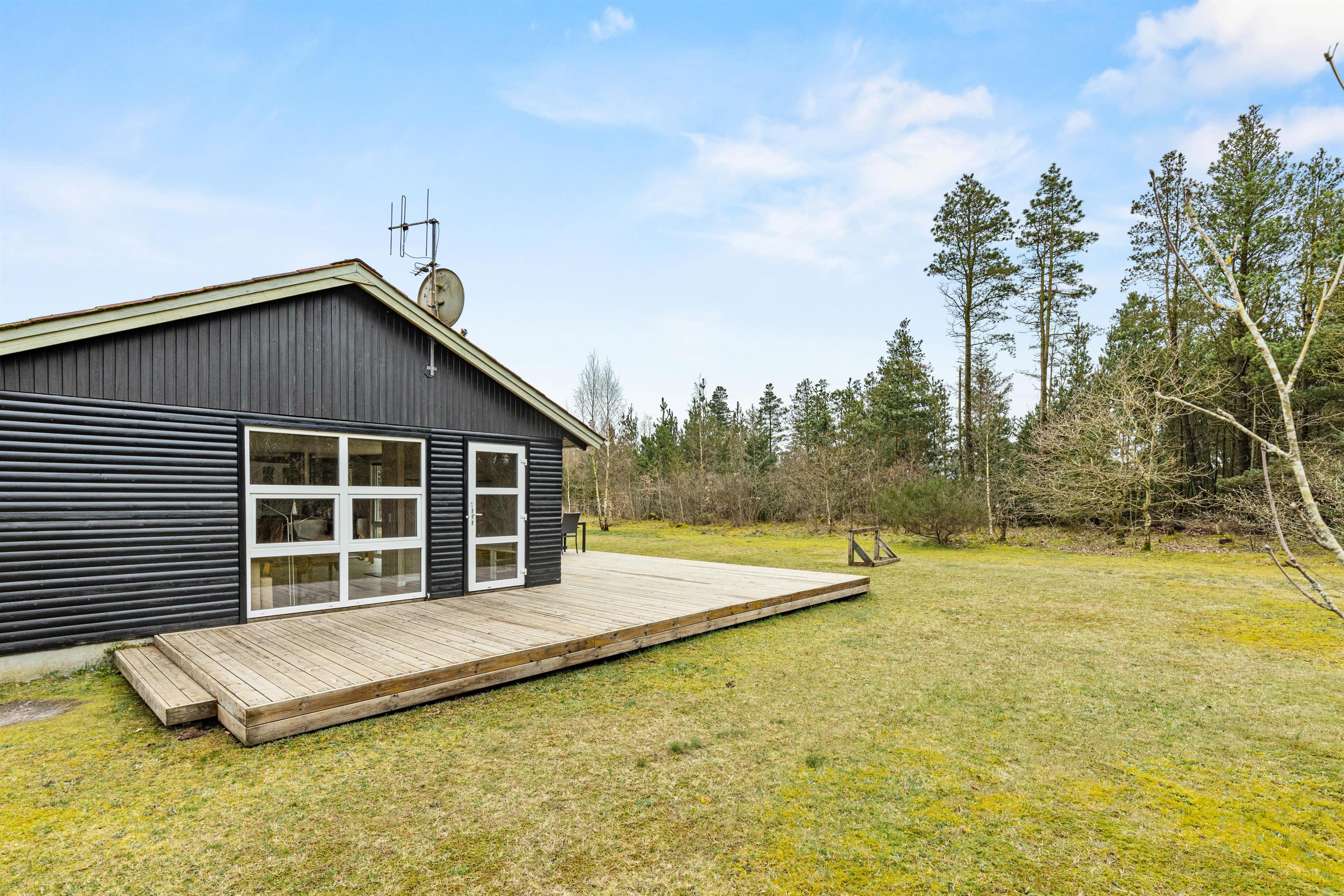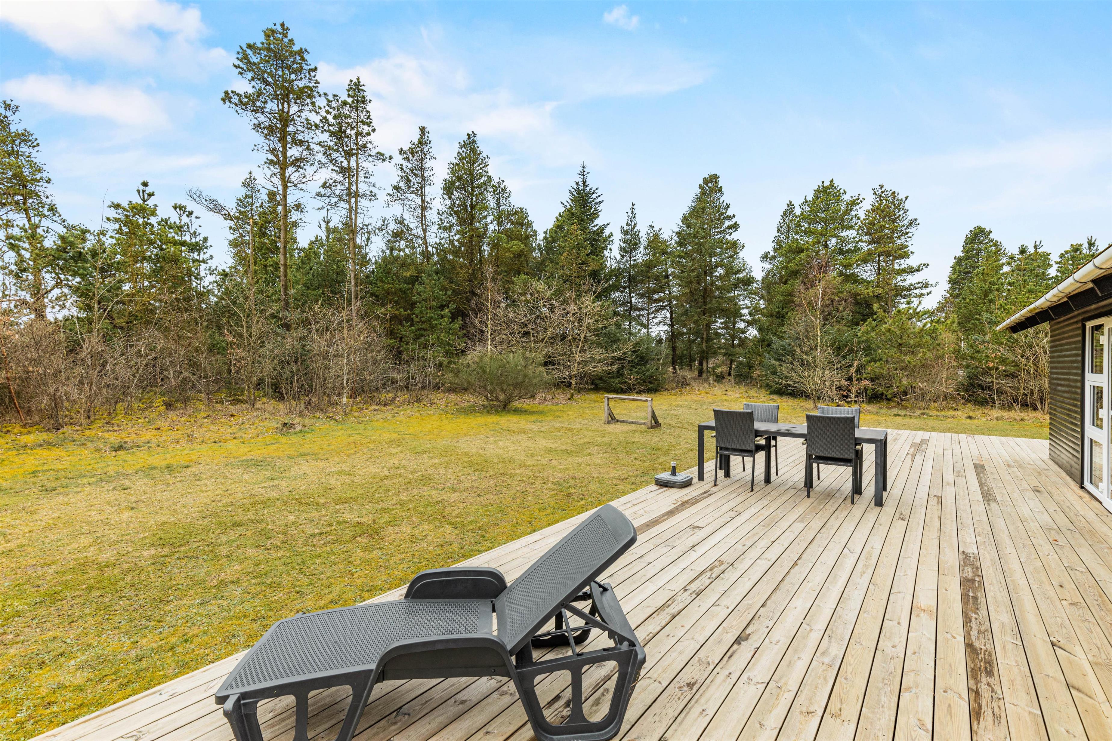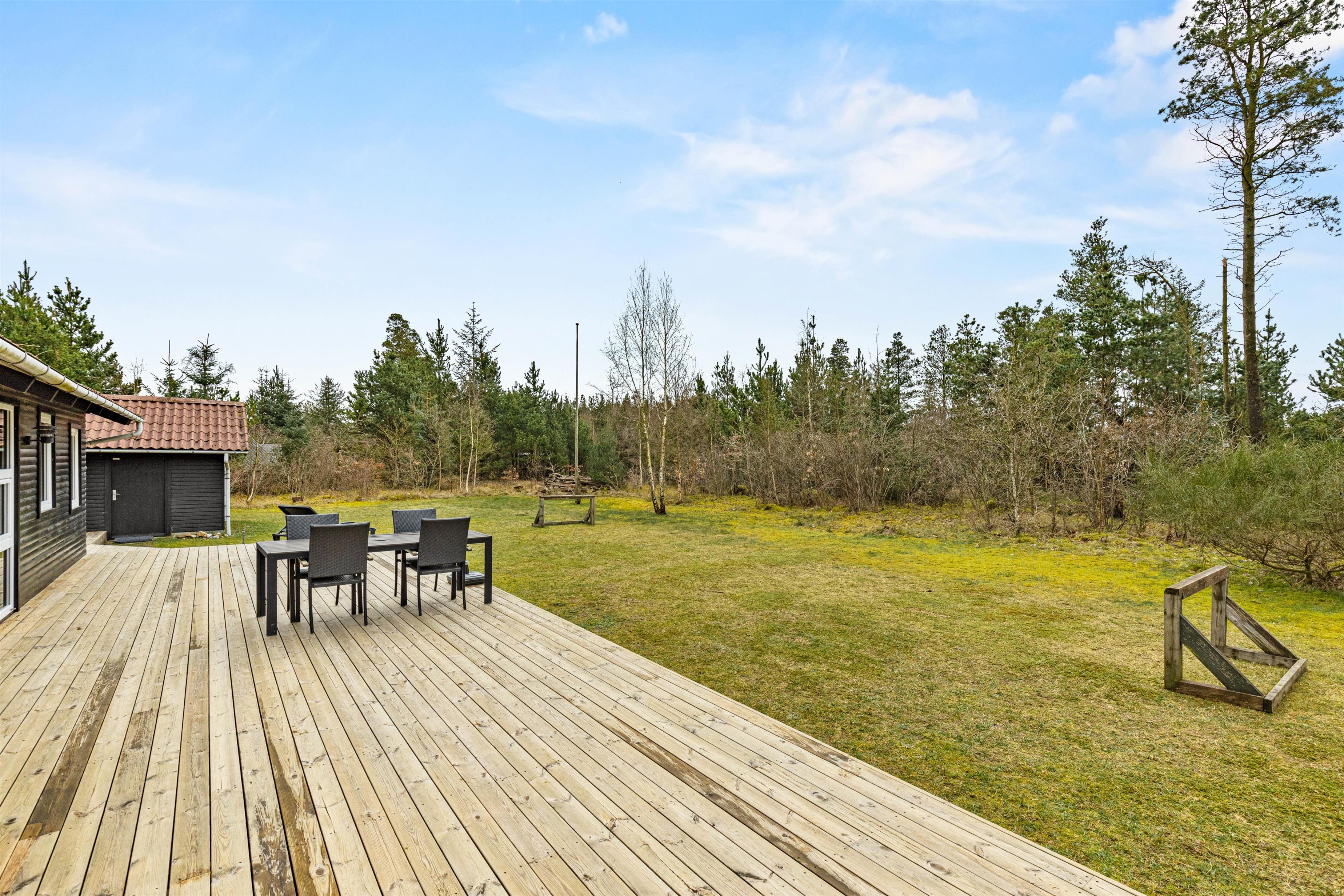 På Jens Thomsensvej 9 bor I dejligt uforstyrret omringet af skøn natur. Grunden er perfekt anlagt, så I altid har den fineste udsigt til skov og træer med læ og uforstyrrethed, men samtidigt har et dejligt lysindfald og en skøn solterrasse. Grunden er delvist indhegnet med et lille ”usynligt” trådhegn, så hunden ikke bare lige kan smutte på opdagelse. På den åbne terrasse er der god plads til at nyde det gode vejr, lige meget om I er med familien på tur, eller om I kun er 2 på en romantisk kæresteferie. Gode havemøbler og liggestole står alt sammen klar til jer, og grillen er klar til at blive tændt på de lune aftener.