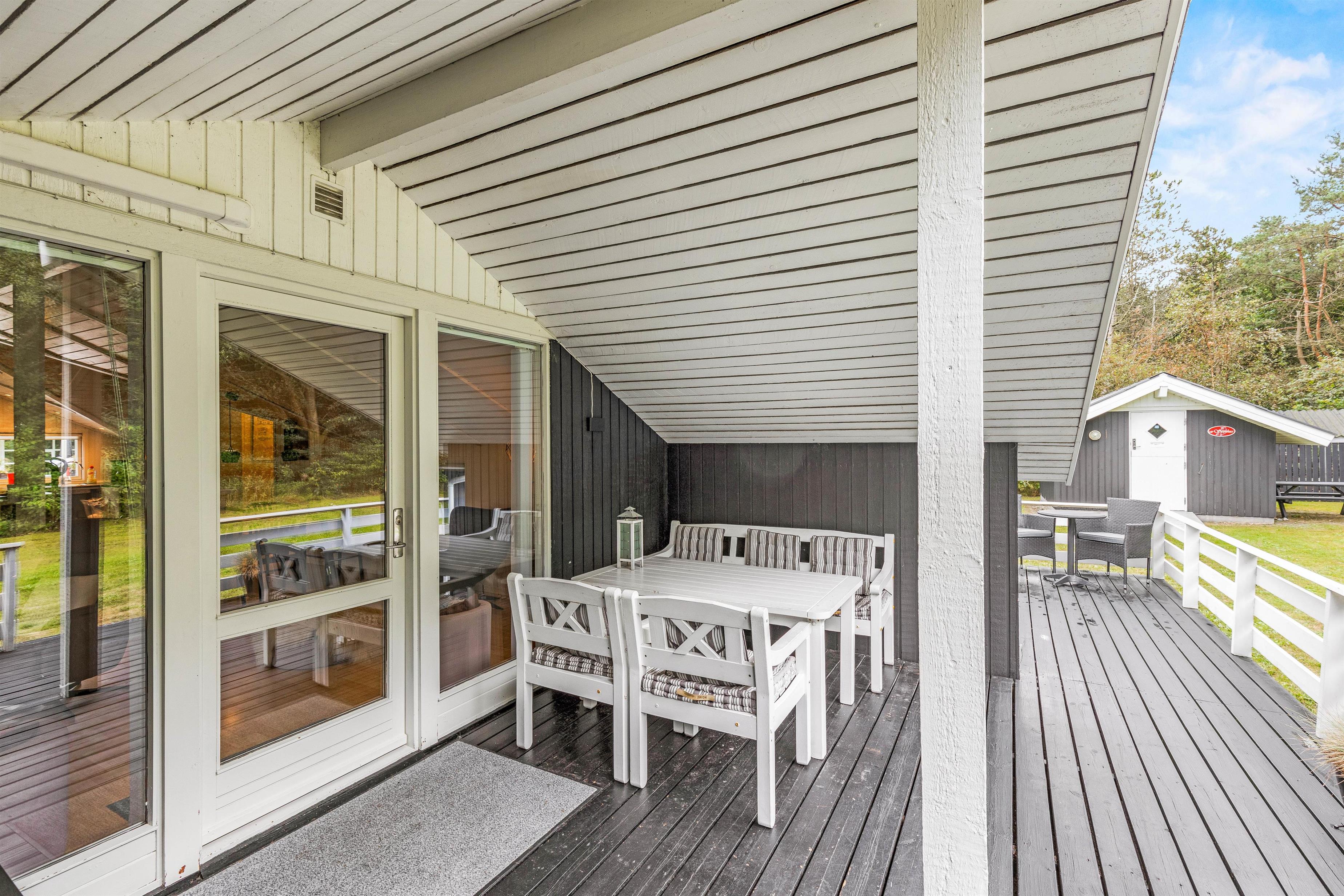 Fra stuen er der direkte udgang til den delvist overdækkede terrasse. Her kan I nyde dagens første kop kaffe men også finde sammen om aftenen og nyde lidt grillmad.