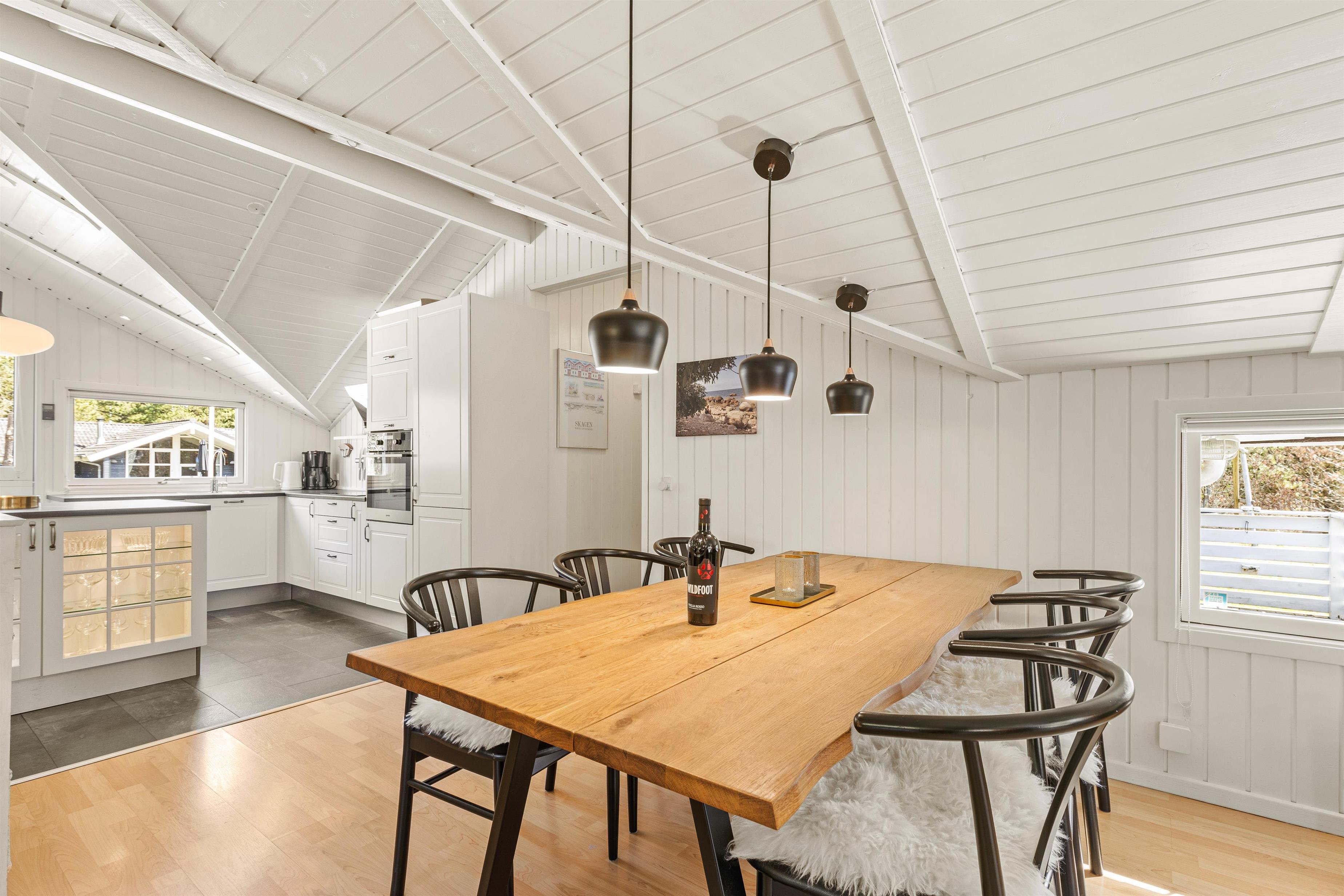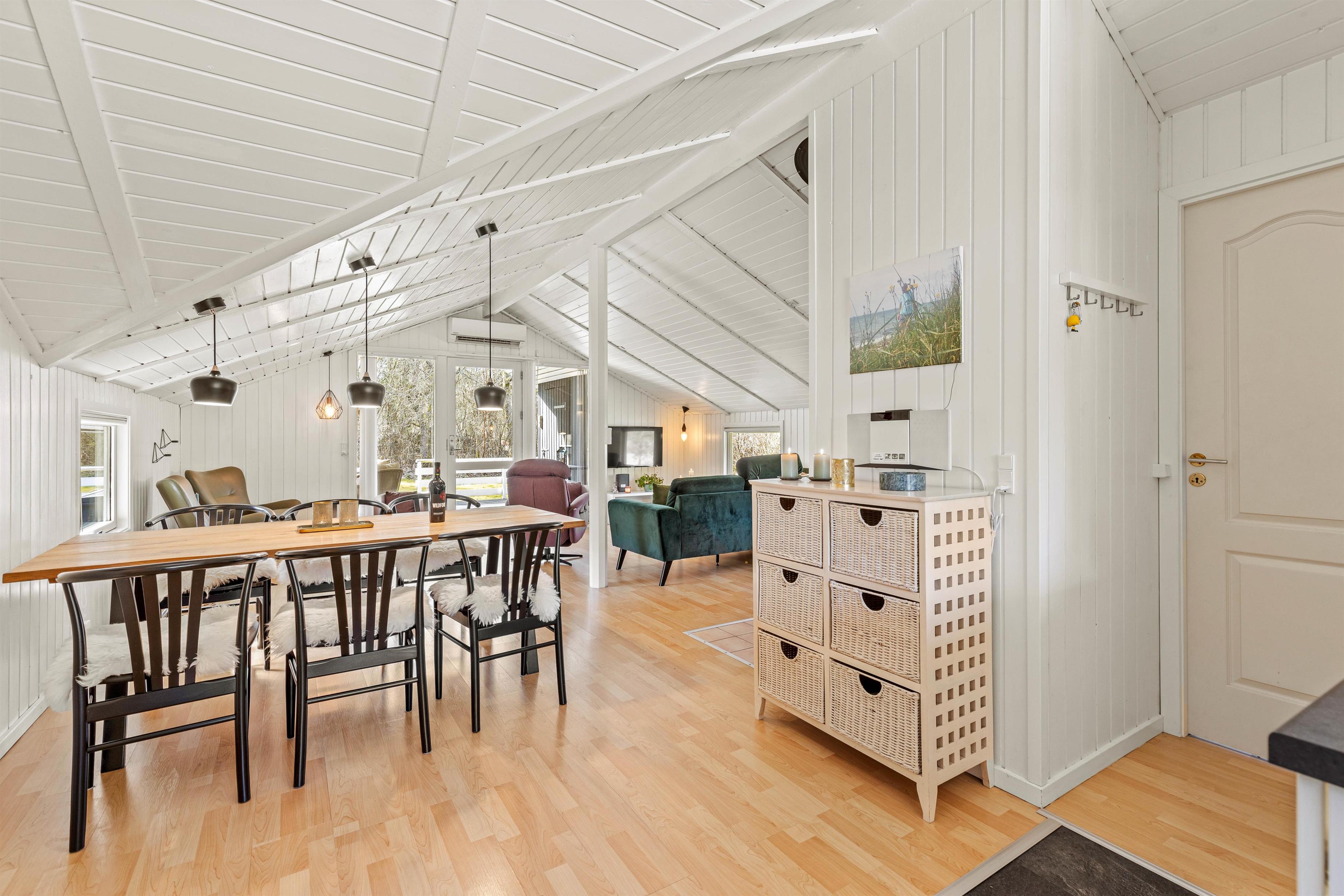 Den hyggeskabende brændeovn er nærmest et ”must” for den rigtige feriestemning i den koldere årstid. For energirigtig behageligt indeklima sørger varmepumpen naturligvis. Sommerhuset er udstyret med Chromecast, så I kan nyde jeres yndlingsfilm og -serier på ferien.