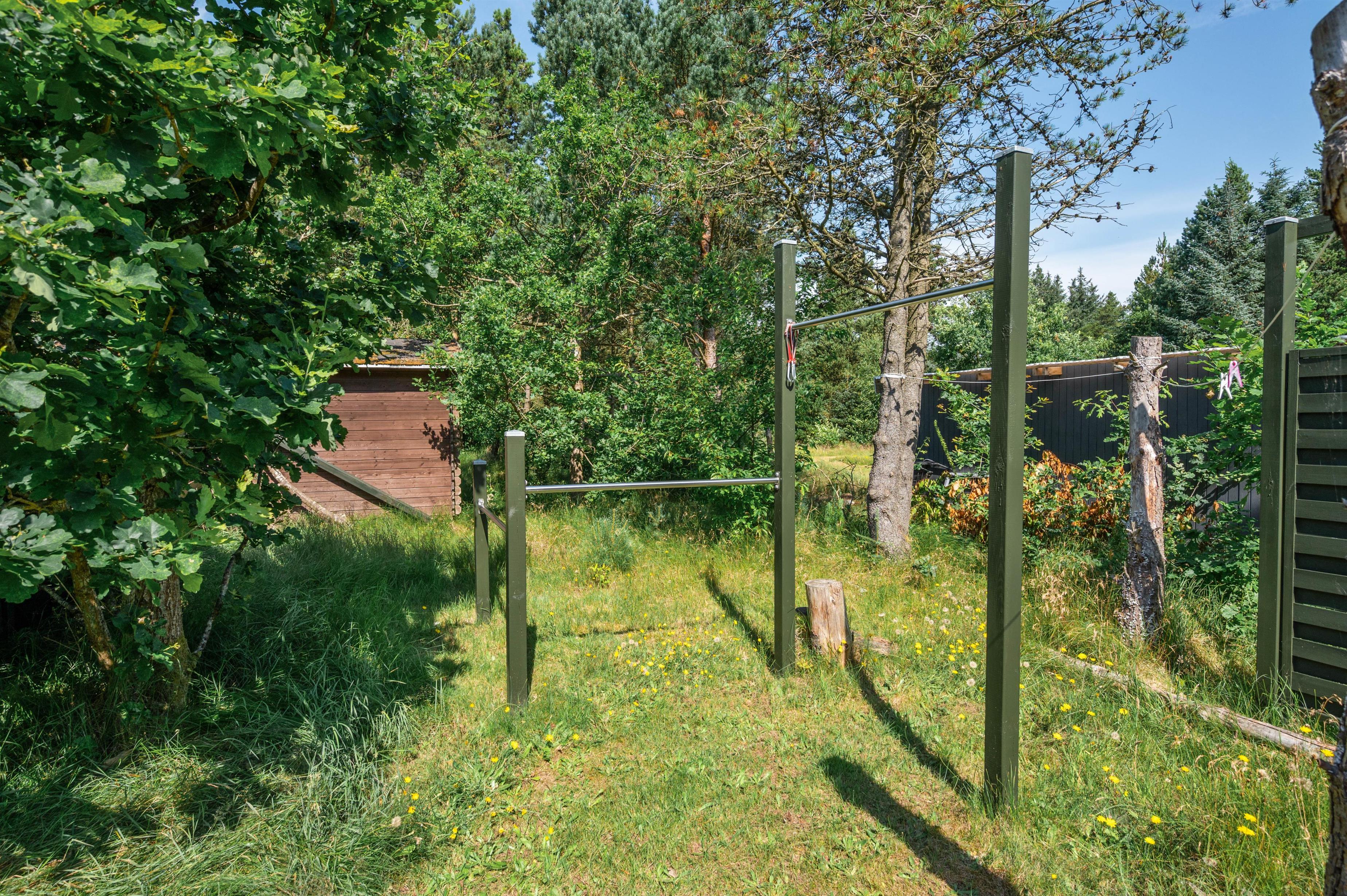 I sommerhuset er der lagt op til underholdende timer i swimmingpoolen og afslappende stunder i spa og sauna. Desuden byder sommerhuset på et dejligt udeområde, hvor I blandt andet har en beachvolleybane, mulighed for at prøve kræfter ved pull-up barren og efterfølgende slappe af i hængekøjen.