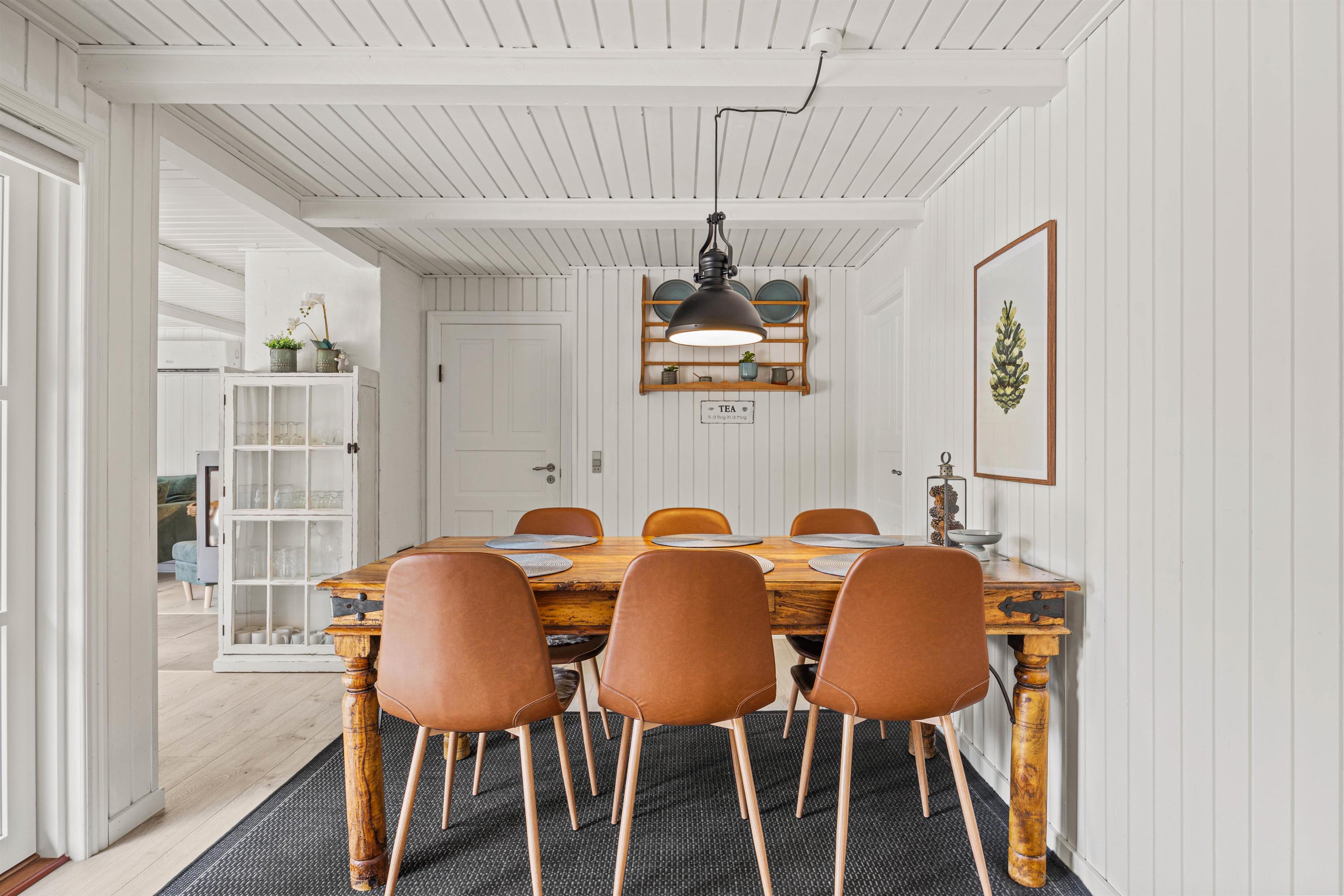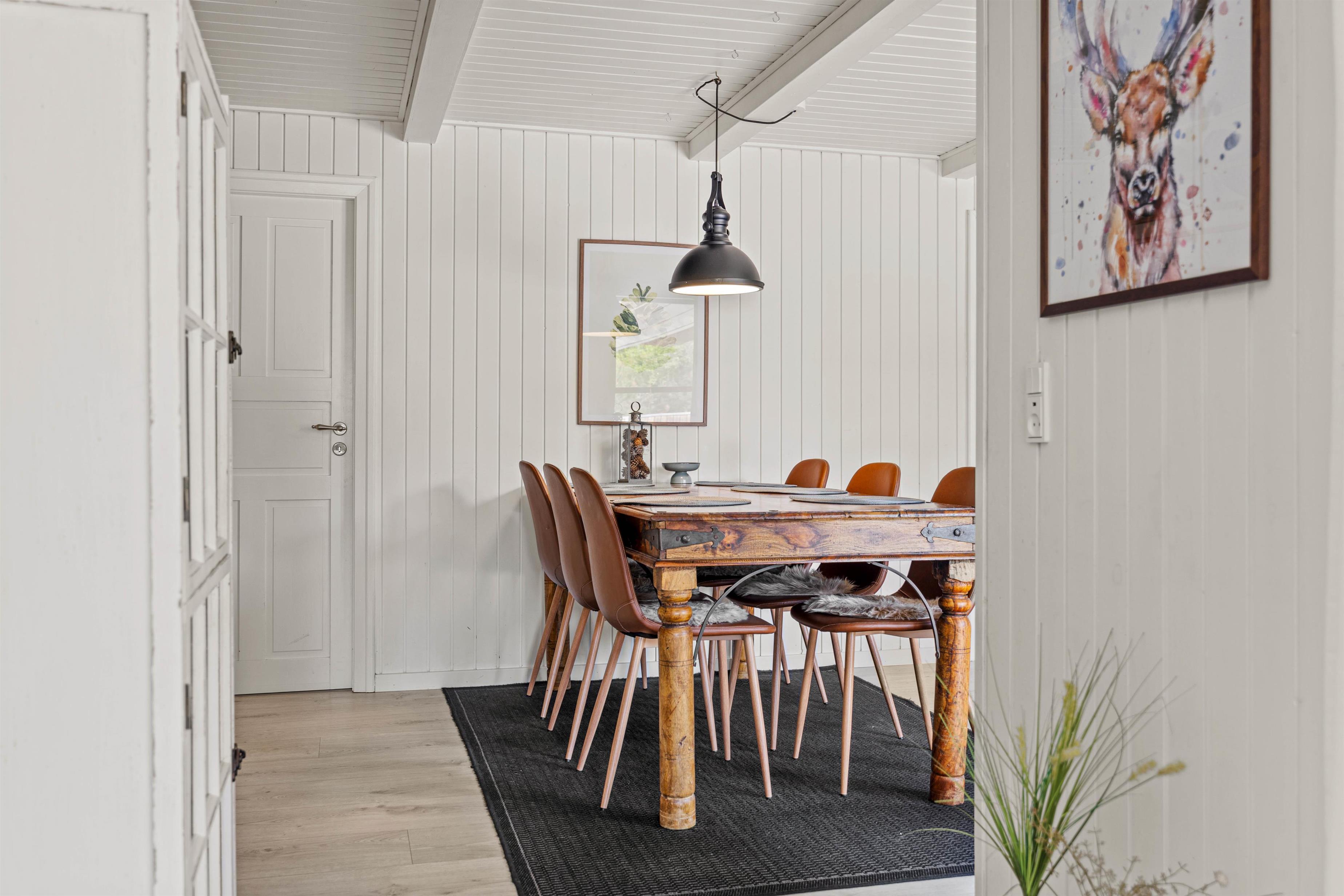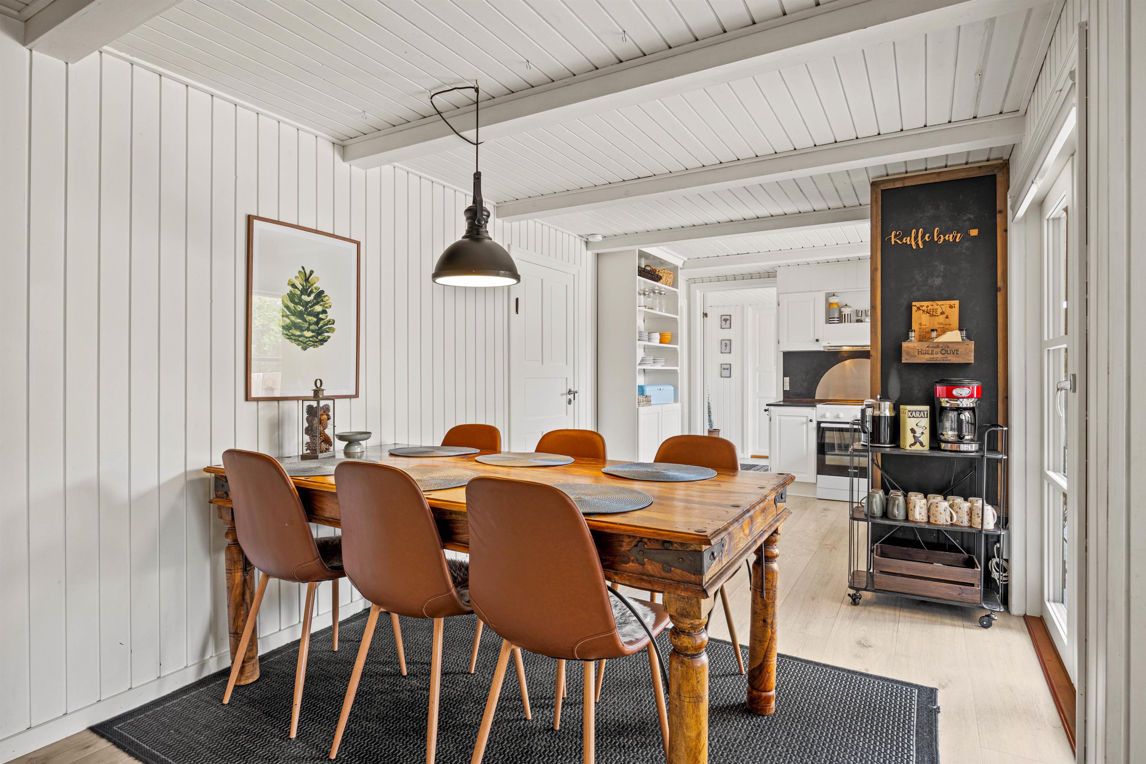 Det originale sommerhus i Houstrup emmer af ægte feriestemning både udvendigt og indvendigt. I det store opholdsrum er der god plads til hele familien, og på de sene aftener kan der spilles kort og ses film i timevis i det hyggelige sofahjørne, mens brændeovnens knitrende flammer fylder stuen med varme. Udover brændeovnen er der også en energivenlig varmepumpe i sommerhuset, der sørger for, at I har gode temperaturer på ferien.