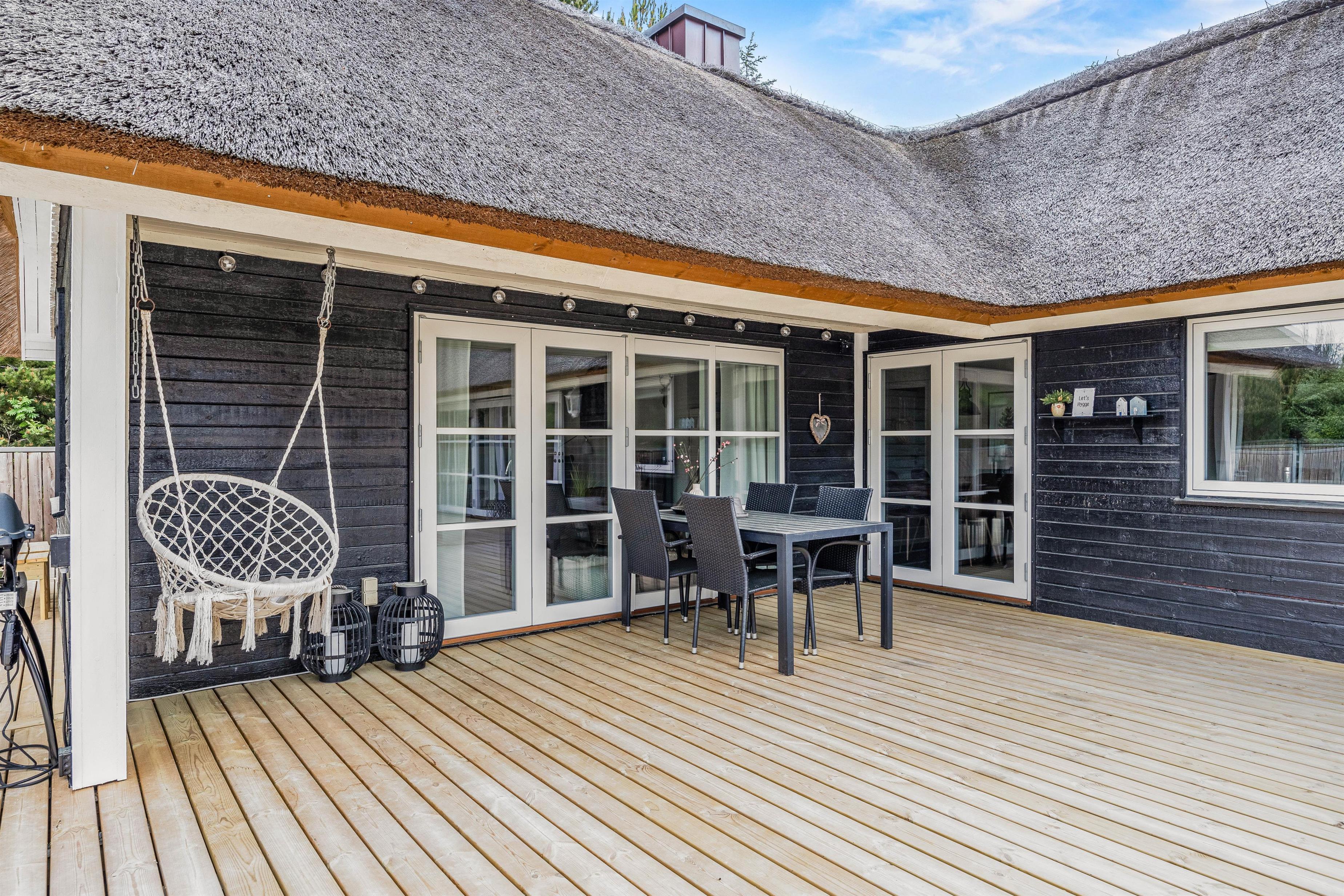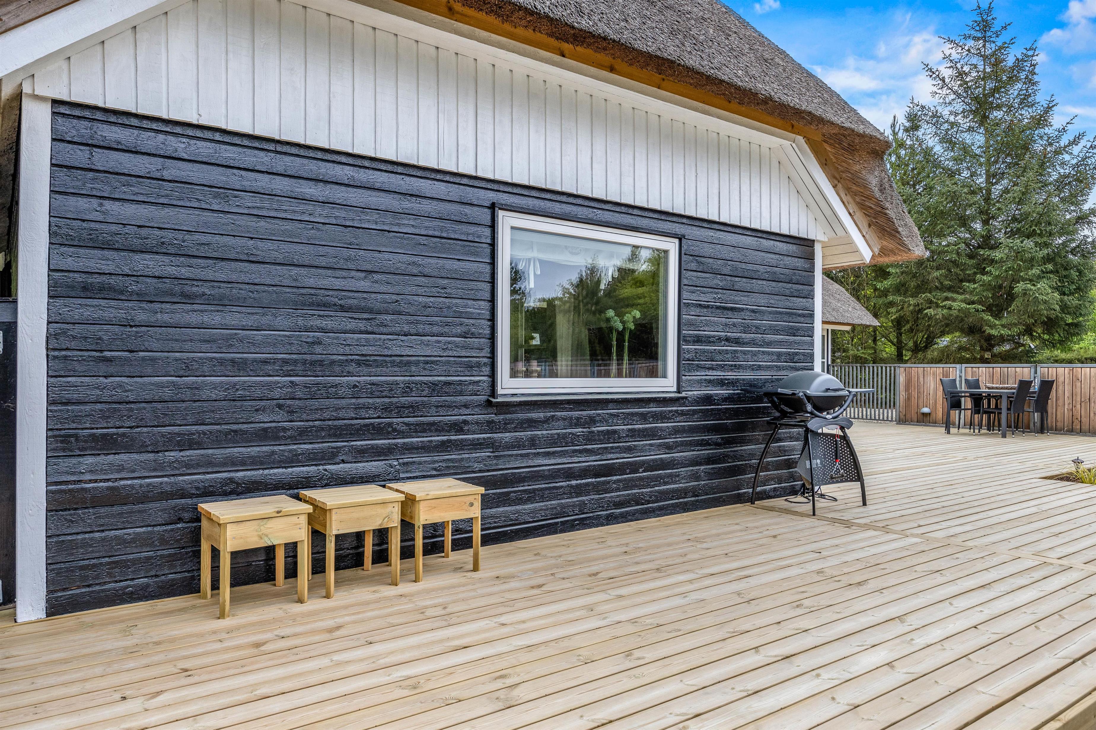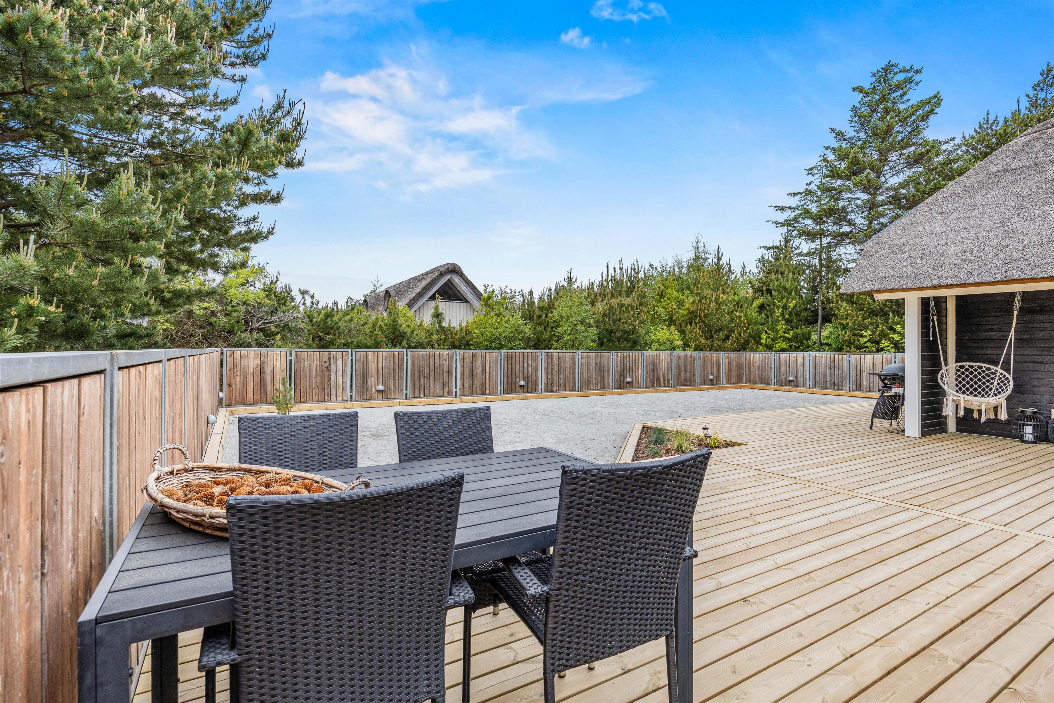 Foran huset finder I en stor, lukket terrasse, hvor både børnene og hunden kan få lov at lege uden opsyn, mens I soler jer på de varme feriedage. Om aftenen kan der grilles på den elektriske grill og spises god mad, og skulle vejret skifte, er en del af terrassen overdækket, så I stadig kan nyde naturen udenfor med et par tæpper og en kop varm kakao rundt om havebordet.