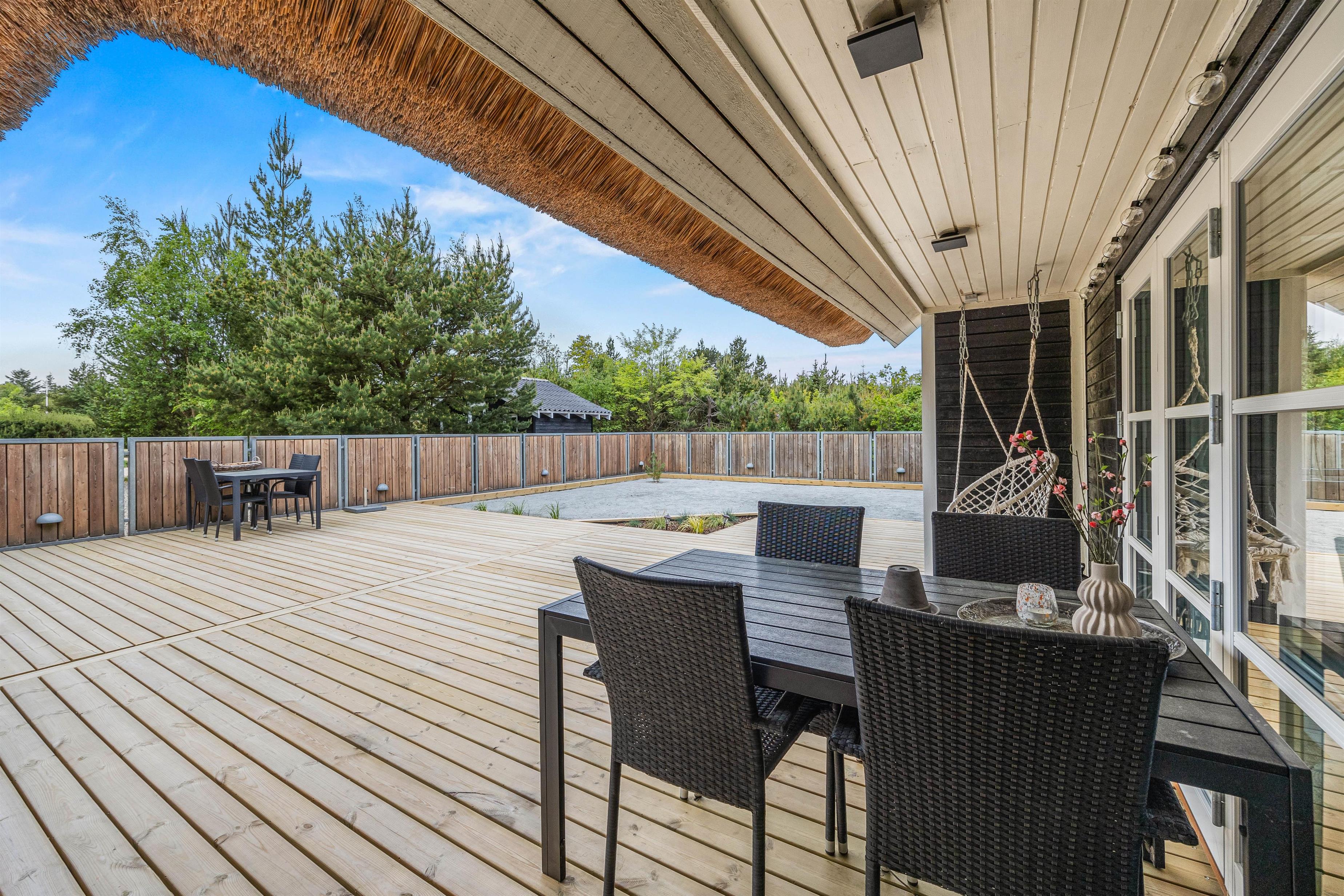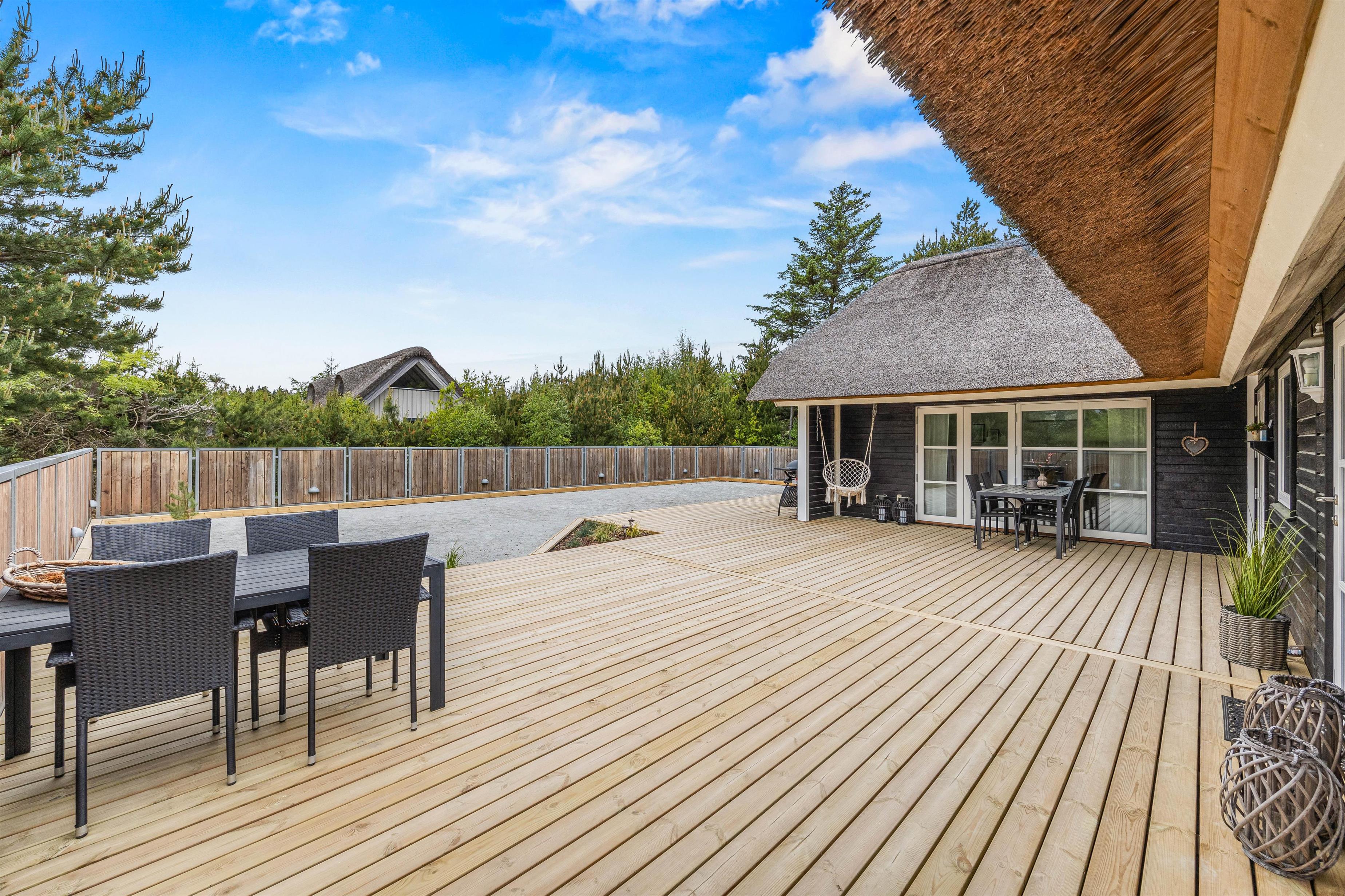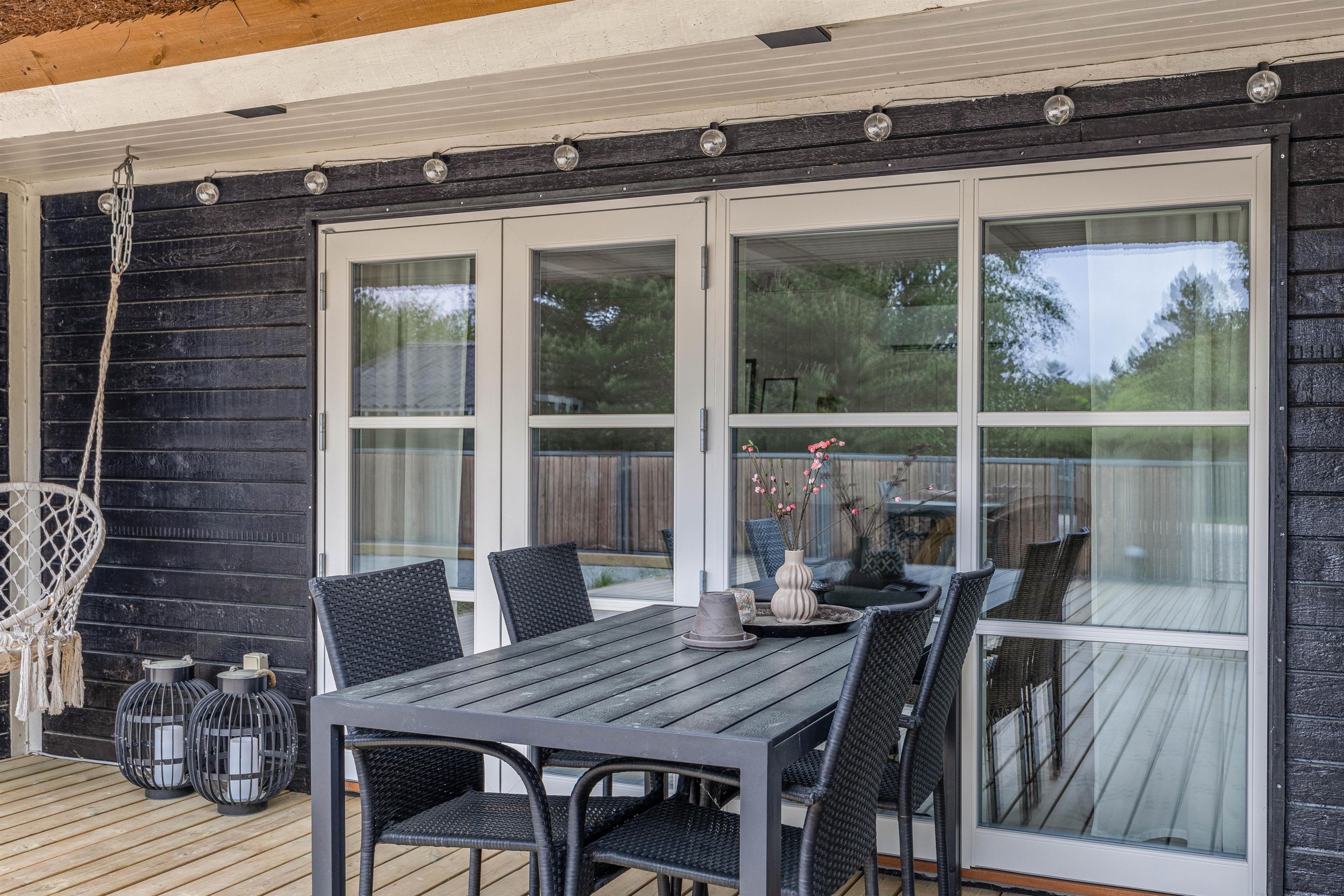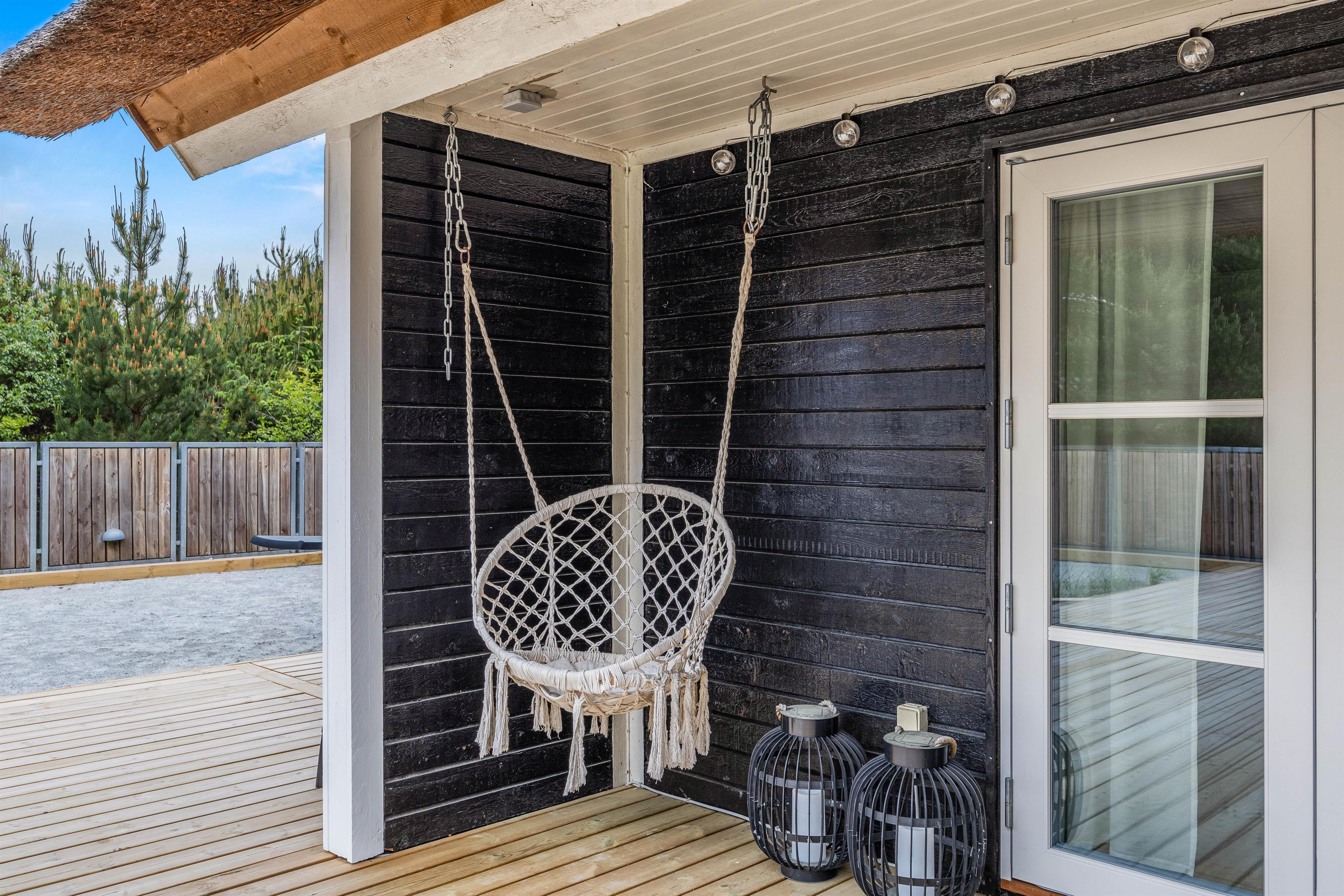 Foran huset finder I en stor, lukket terrasse, hvor både børnene og hunden kan få lov at lege uden opsyn, mens I soler jer på de varme feriedage. Om aftenen kan der grilles på den elektriske grill og spises god mad, og skulle vejret skifte, er en del af terrassen overdækket, så I stadig kan nyde naturen udenfor med et par tæpper og en kop varm kakao rundt om havebordet.