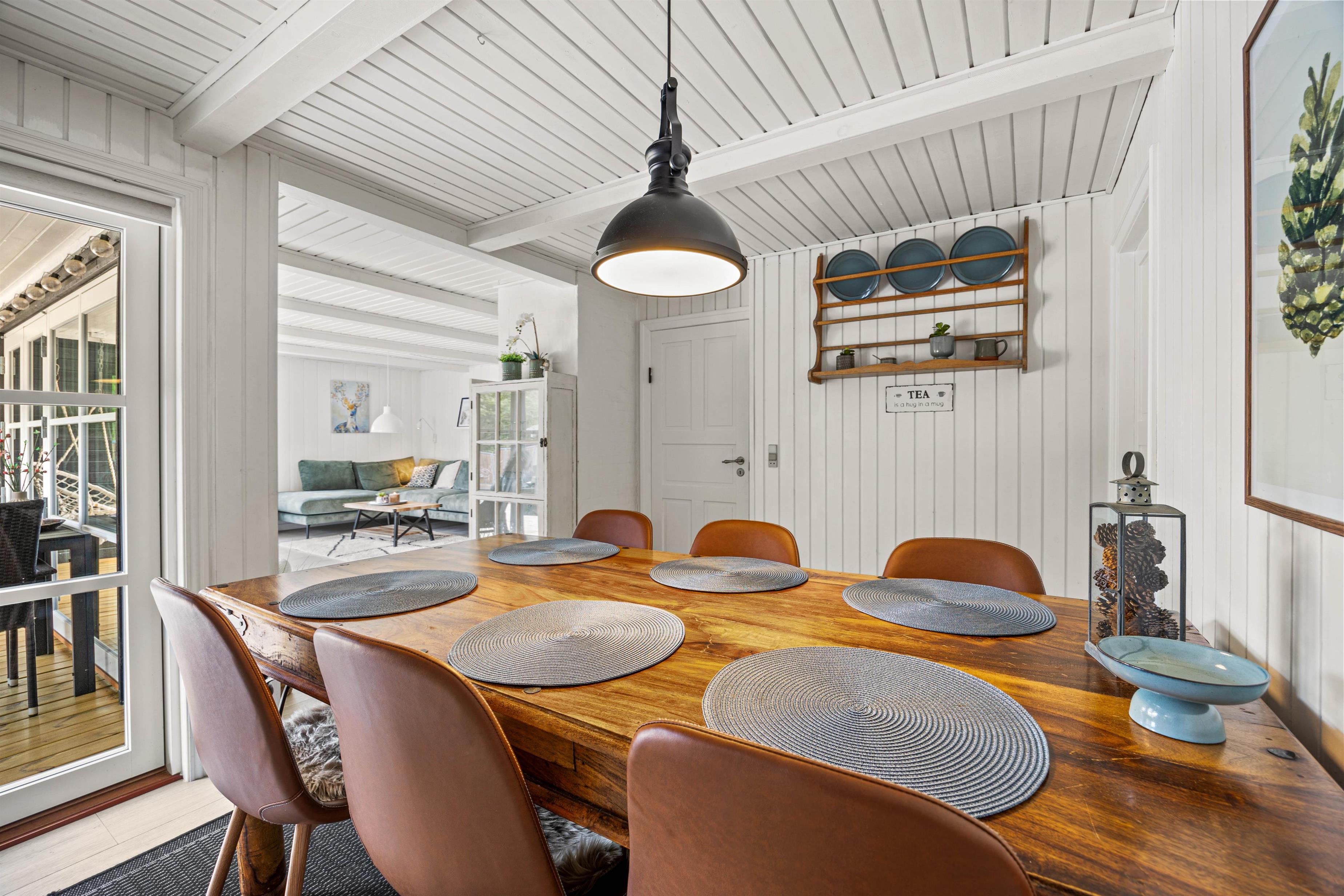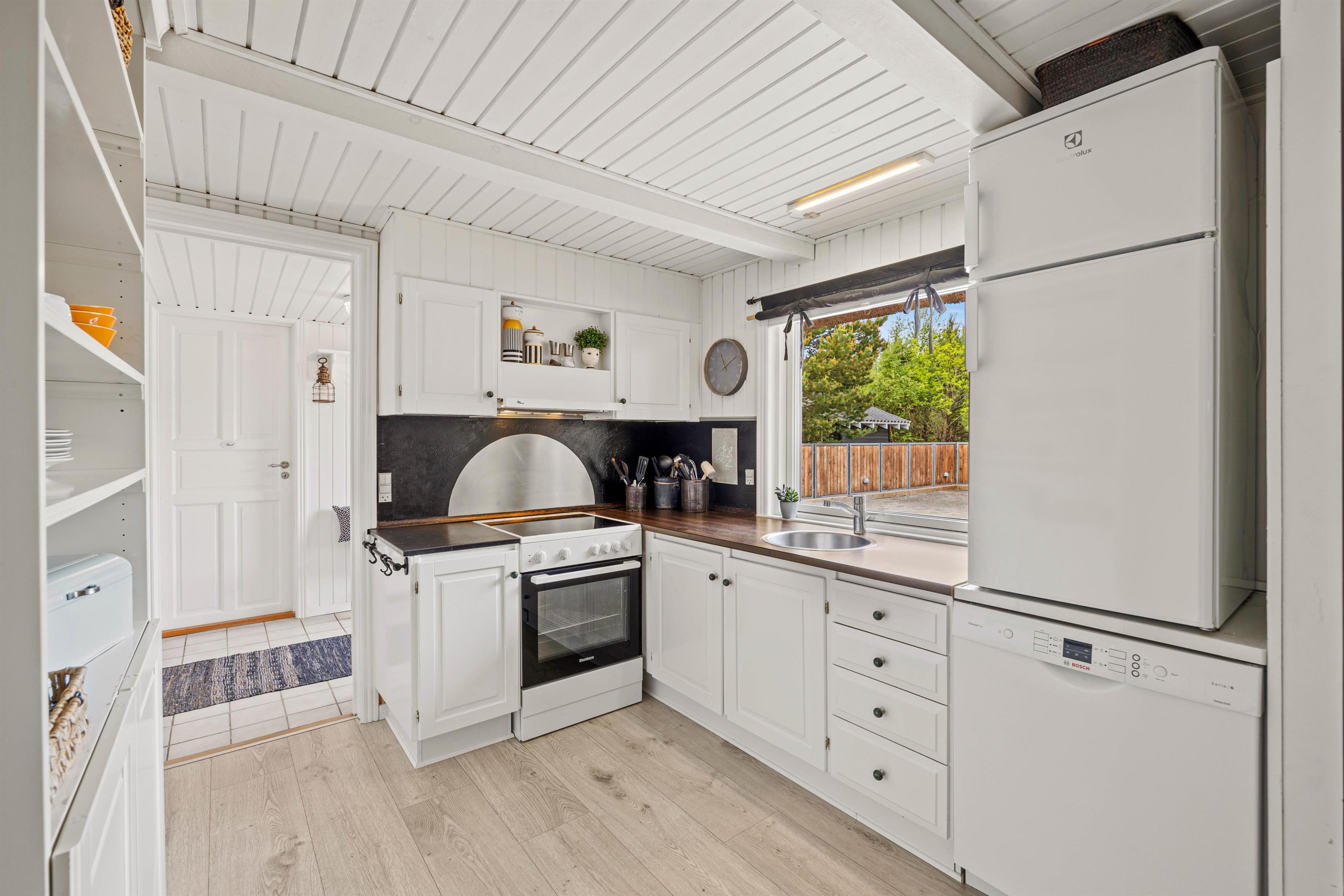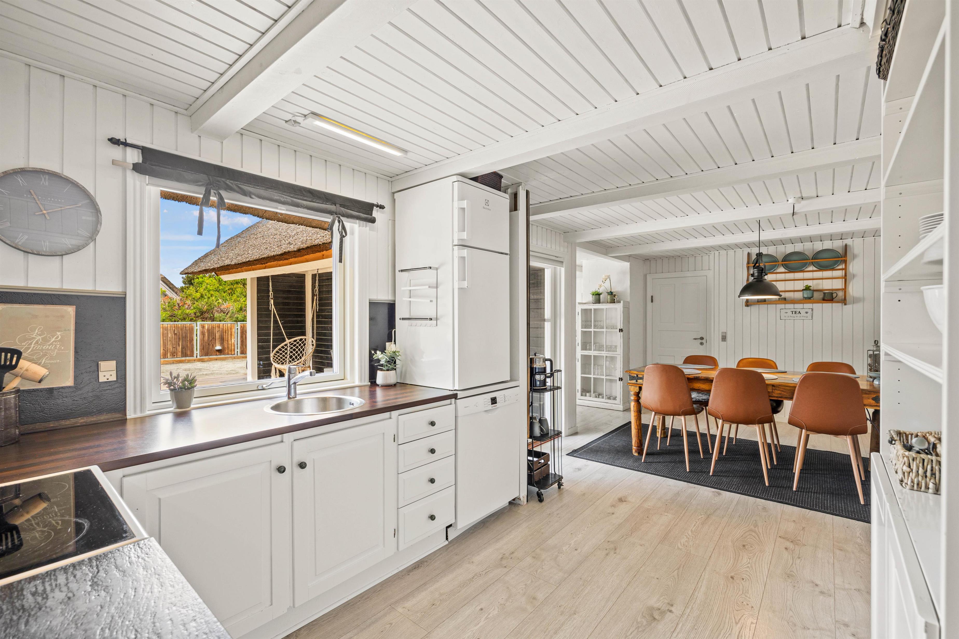Ved siden af stuen finder I det åbne køkken, der er veludstyret med både opvaskemaskine og mikroovn. Huset råder også over en vaskemaskine og en tørretumbler, så der er taget hånd om de huslige pligter for jer.