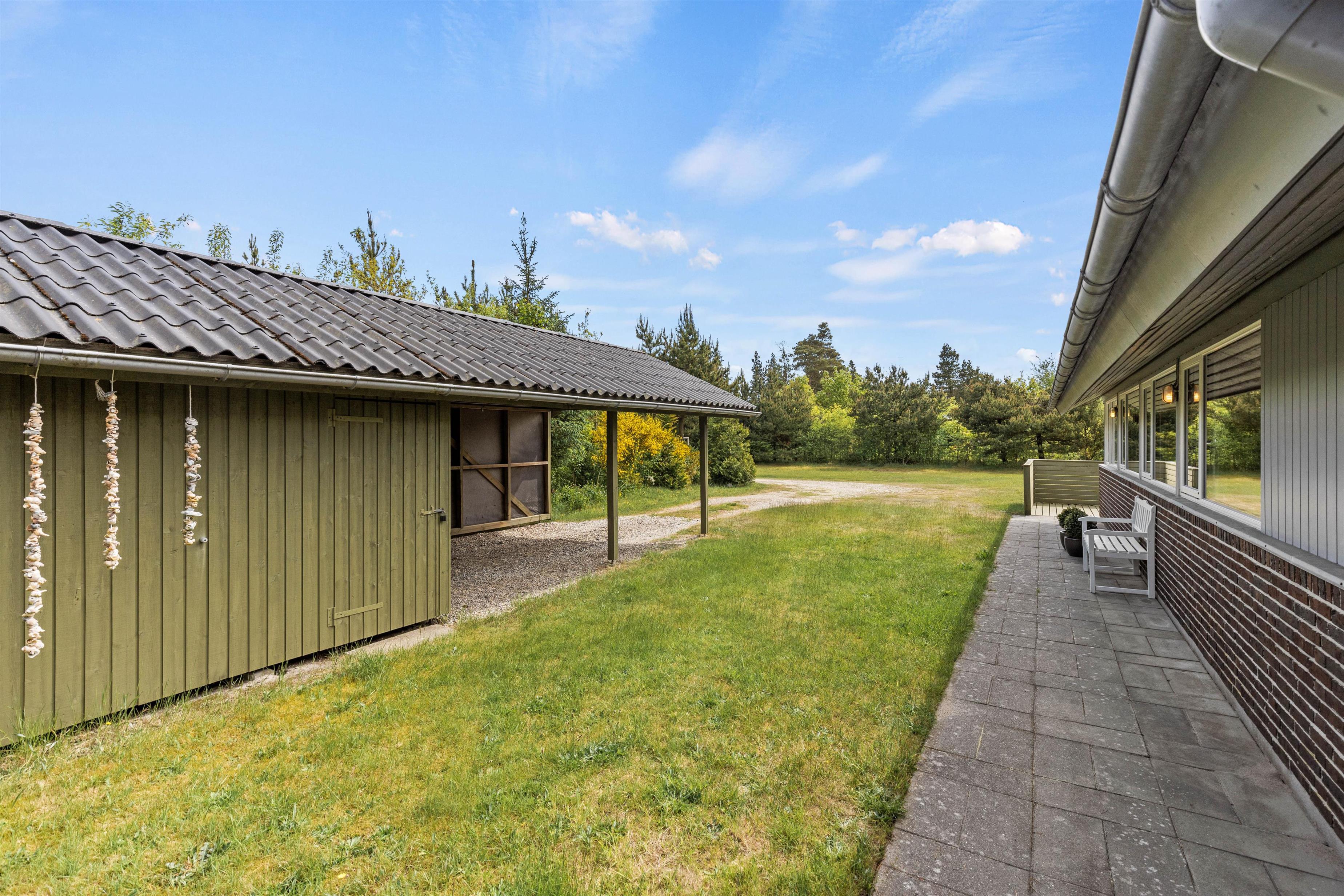 Husets beliggenhed er helt unik, omringet af høje træer og med Houstrups skov lige ved siden af, hvor I kan gå på opdagelse og udforske de naturskønne omgivelser. Også stranden ligger kun få minutters kørsel væk, og den er et besøg værd i al slags vejr. Tag en dukkert i varmen, gå en tur langs vandkanten eller se de store bølger boltre sig i stormvejret.