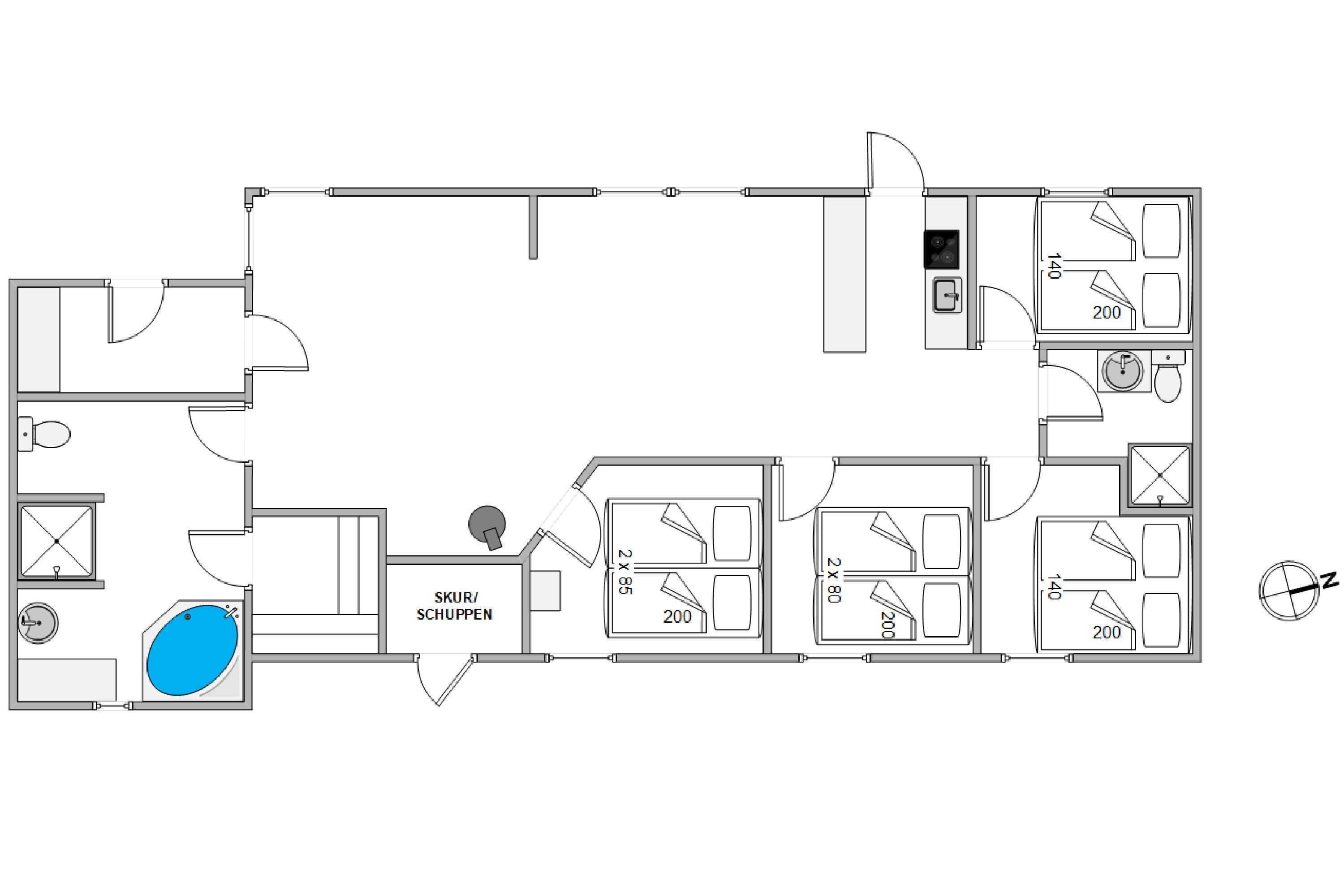 Efter en lang dag kan I finde ro og velvære i saunaen eller i tømmespaen og lade dagens oplevelser synke ind. De 8 sovepladser er praktisk fordelt på 4 rummelige soveværelser, perfekt til afslapning efter dagens oplevelser. Derudover finde I 2 skønne badeværelser, begge med gulvvarme, som tilføjer ekstra luksus og gør morgenerne lidt mere behagelige.