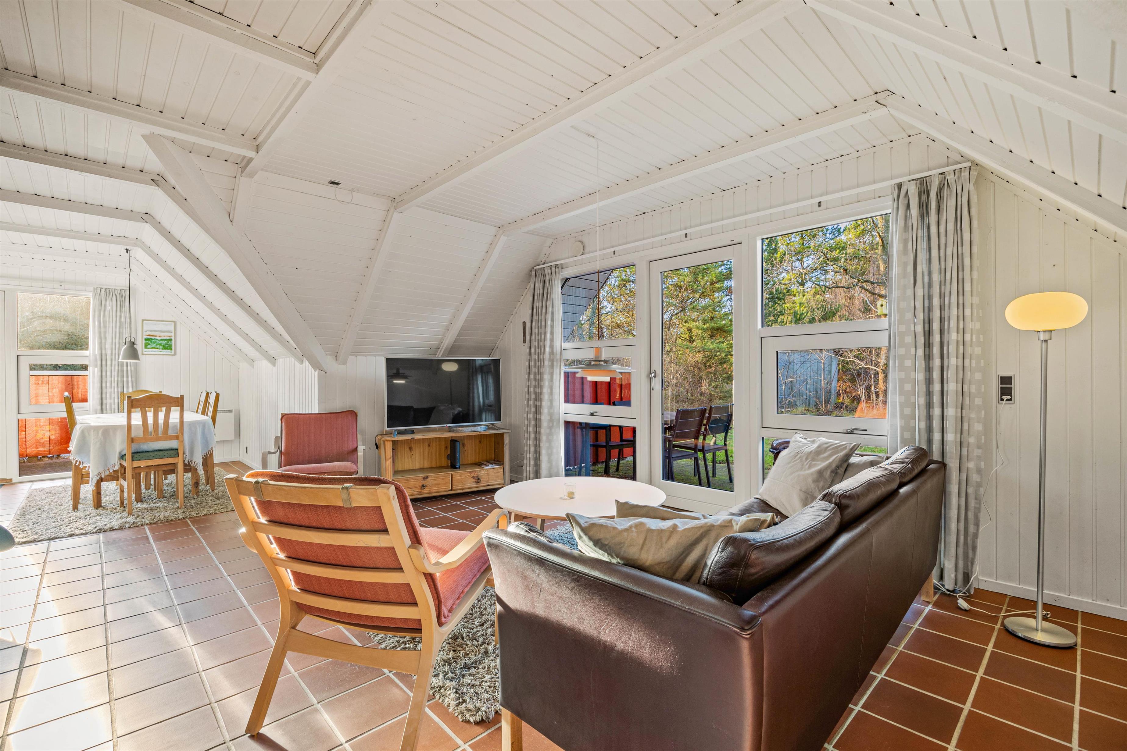 Her kan I streame jeres yndlingsfilm og serier via sommerhusets Chromecast. I hjørnet står en brændeovn, som tilføjer en dejlig sommerhusstemning til rummet.
