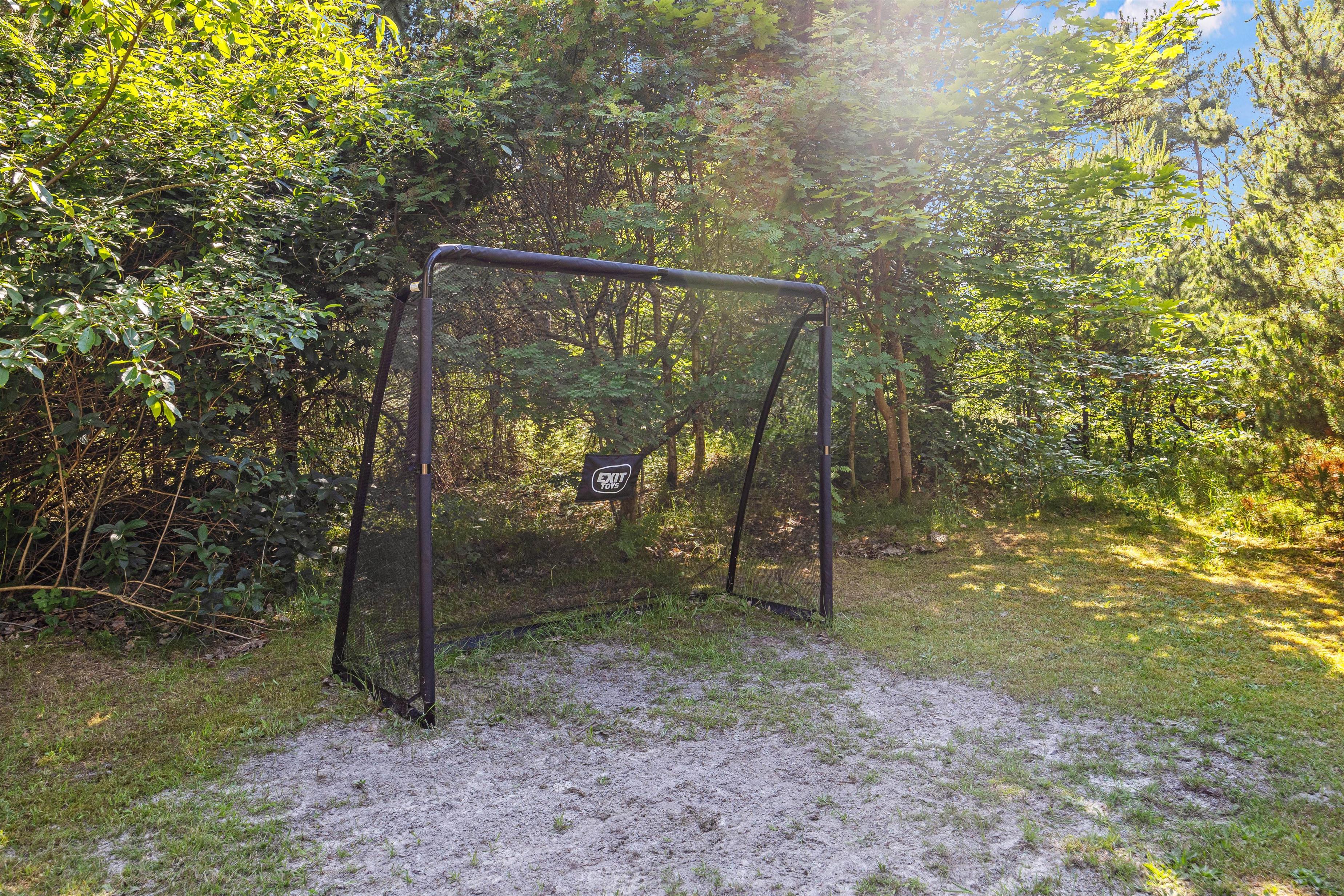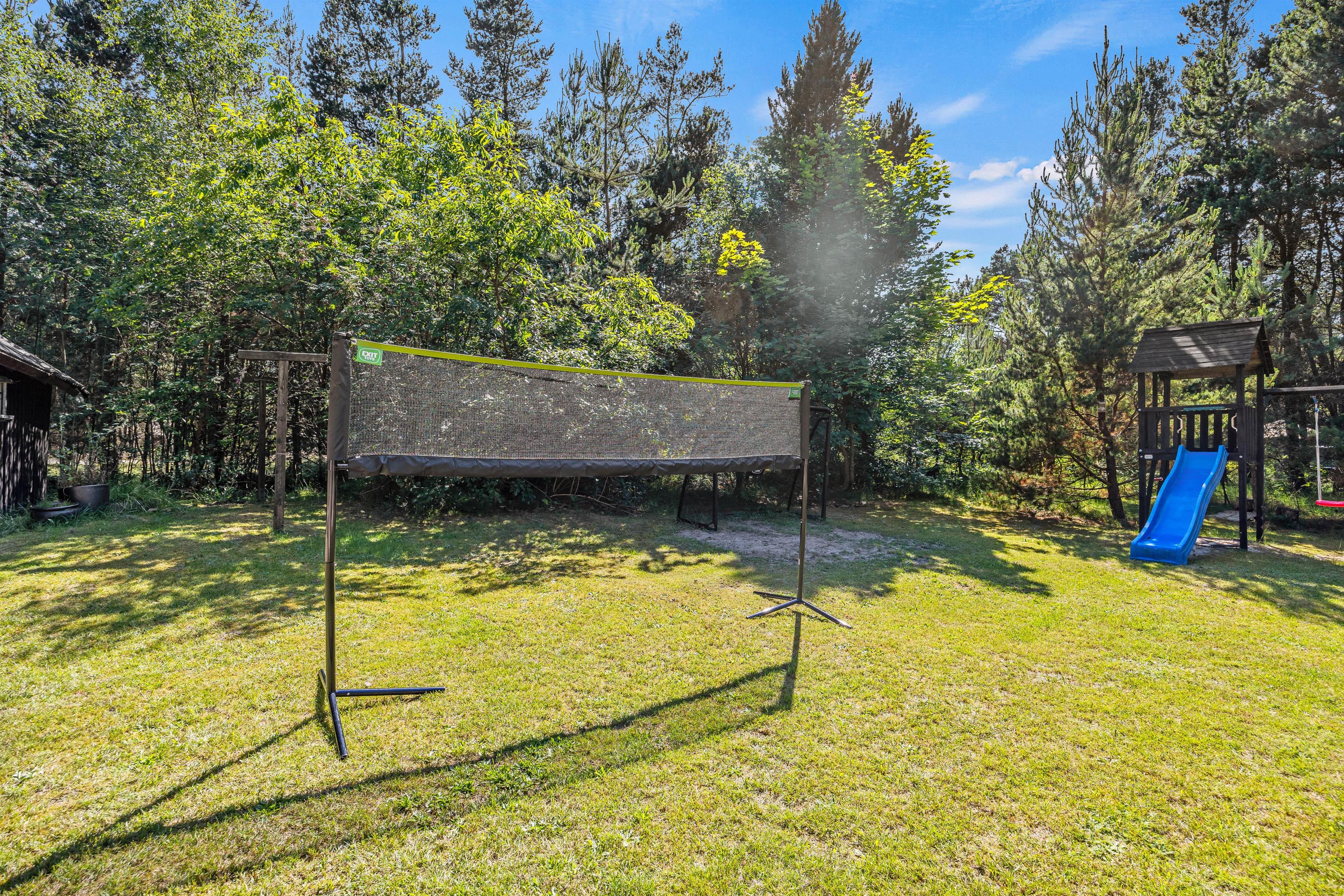 På den velholdte græsplæne er der masser af plads til leg og boldspil, og til glæde for de yngste familiemedlemmer er der også et legetårn med både gynger og rutsjebane på grunden. Her er hele familien godt underholdt på en fredfyldt solskinsdag.