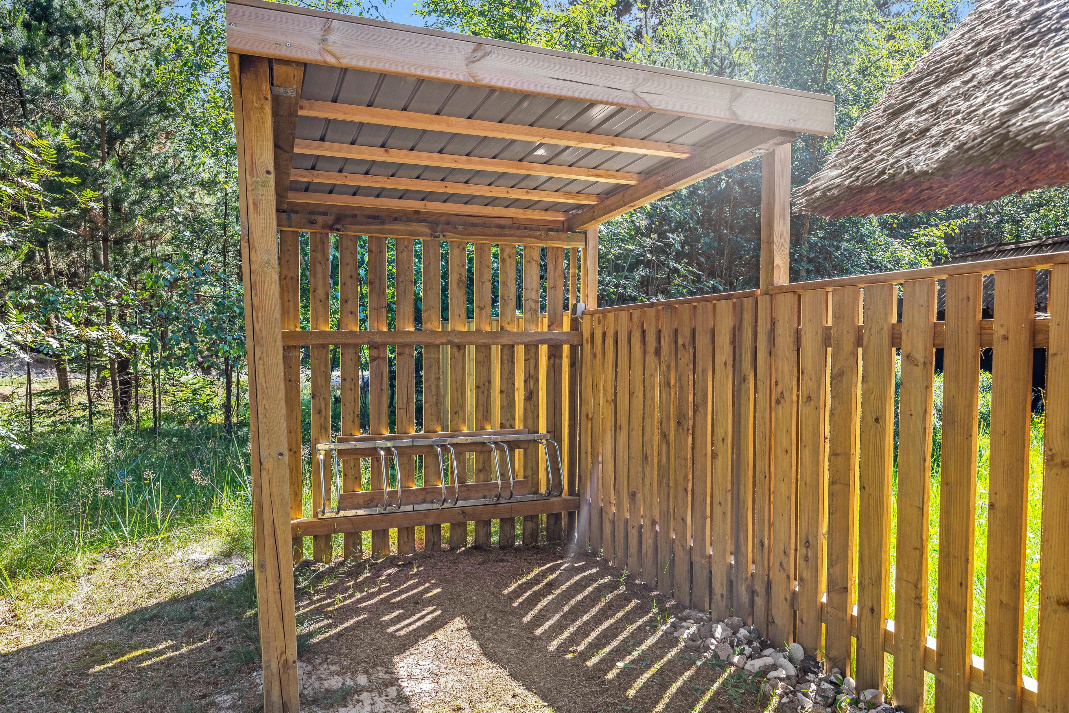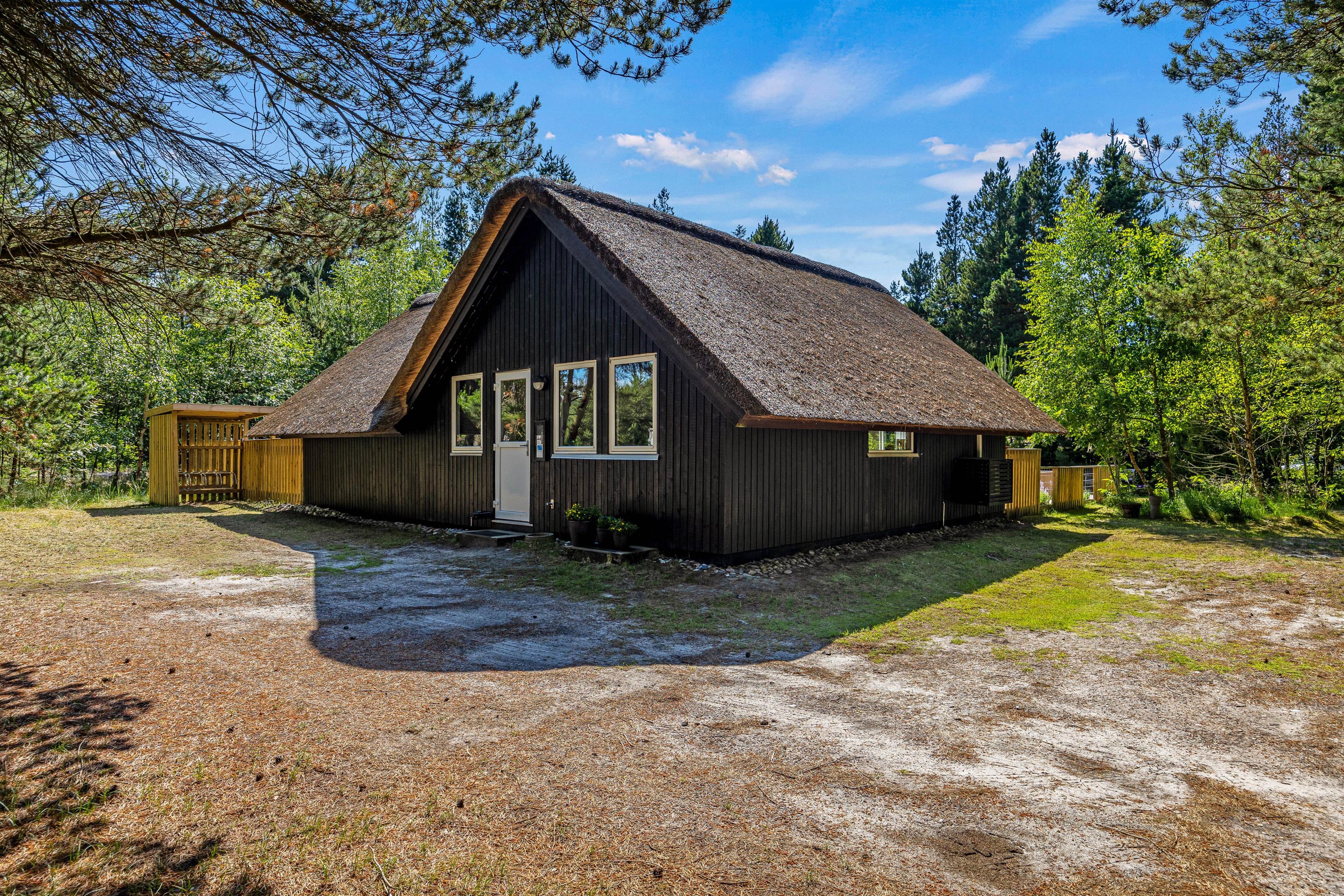 Fra alrummet er der udgang til feriehusets store træterrasse. Her finder I altid en læfyldt plads takket være den delvise afskærmning og overdækning. Hele den store plænegrund er omgivet af høje træer, så I har god ro til at nyde solen fra liggestolene eller spise en grillmiddag udenfor på en lun sommeraften.