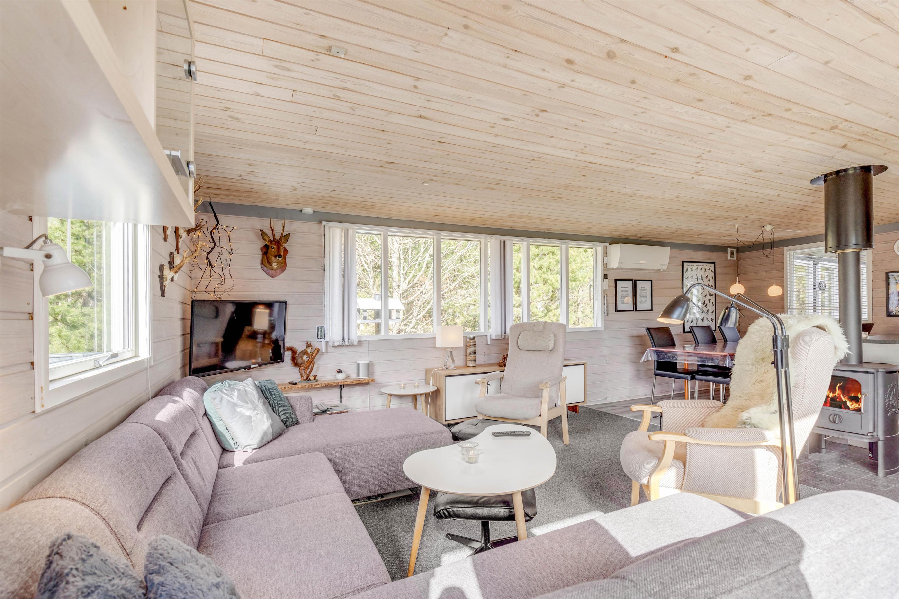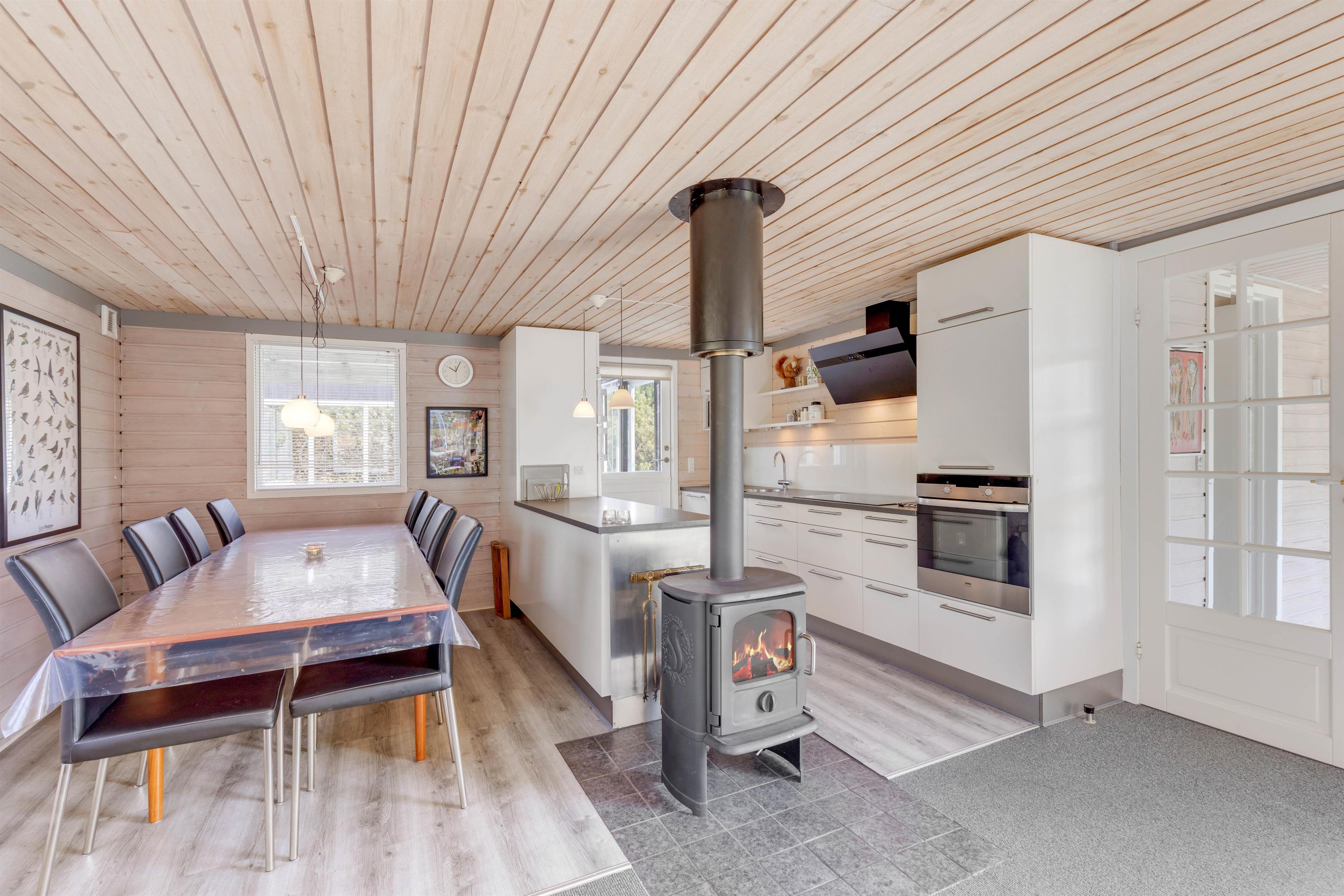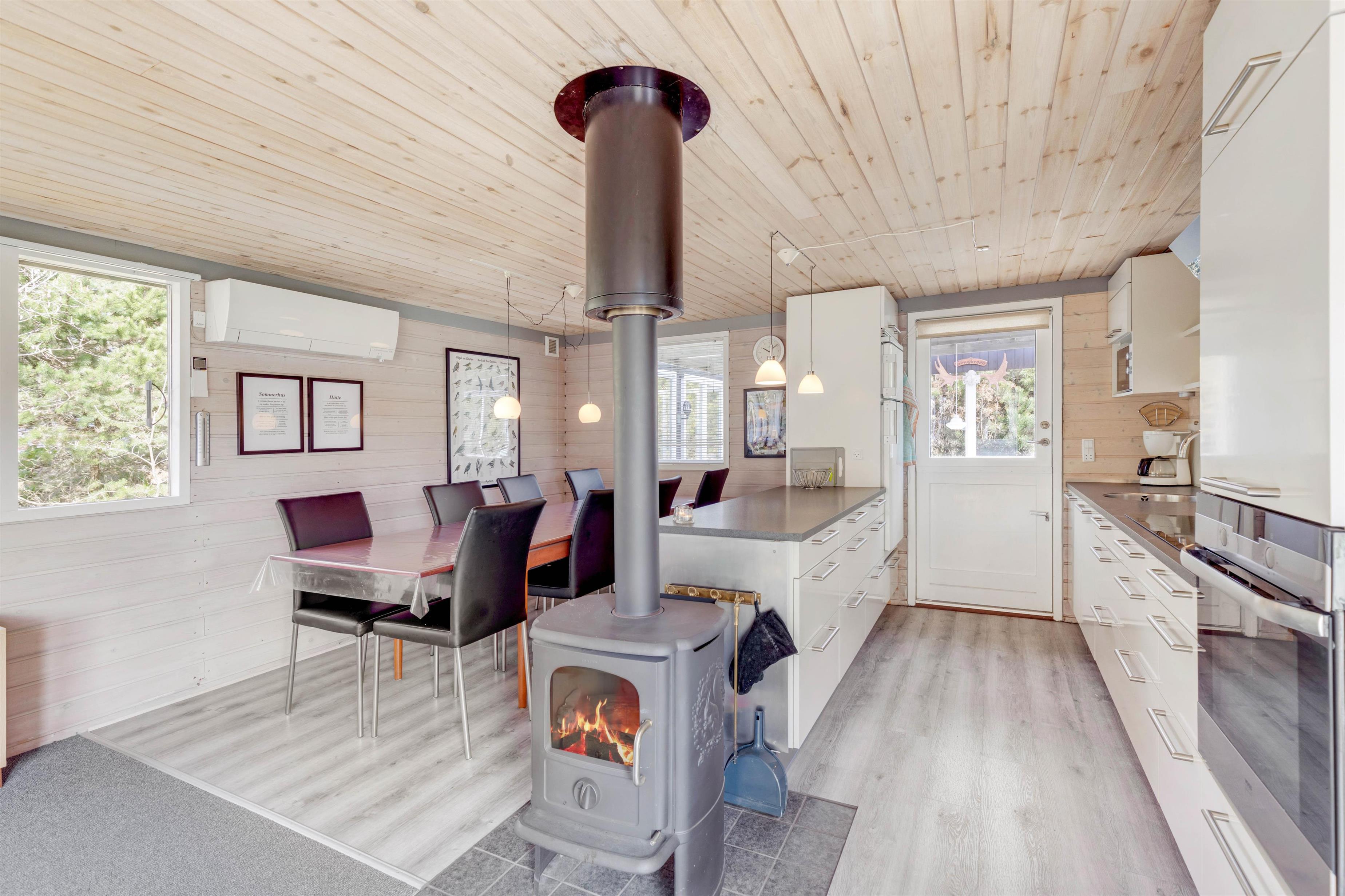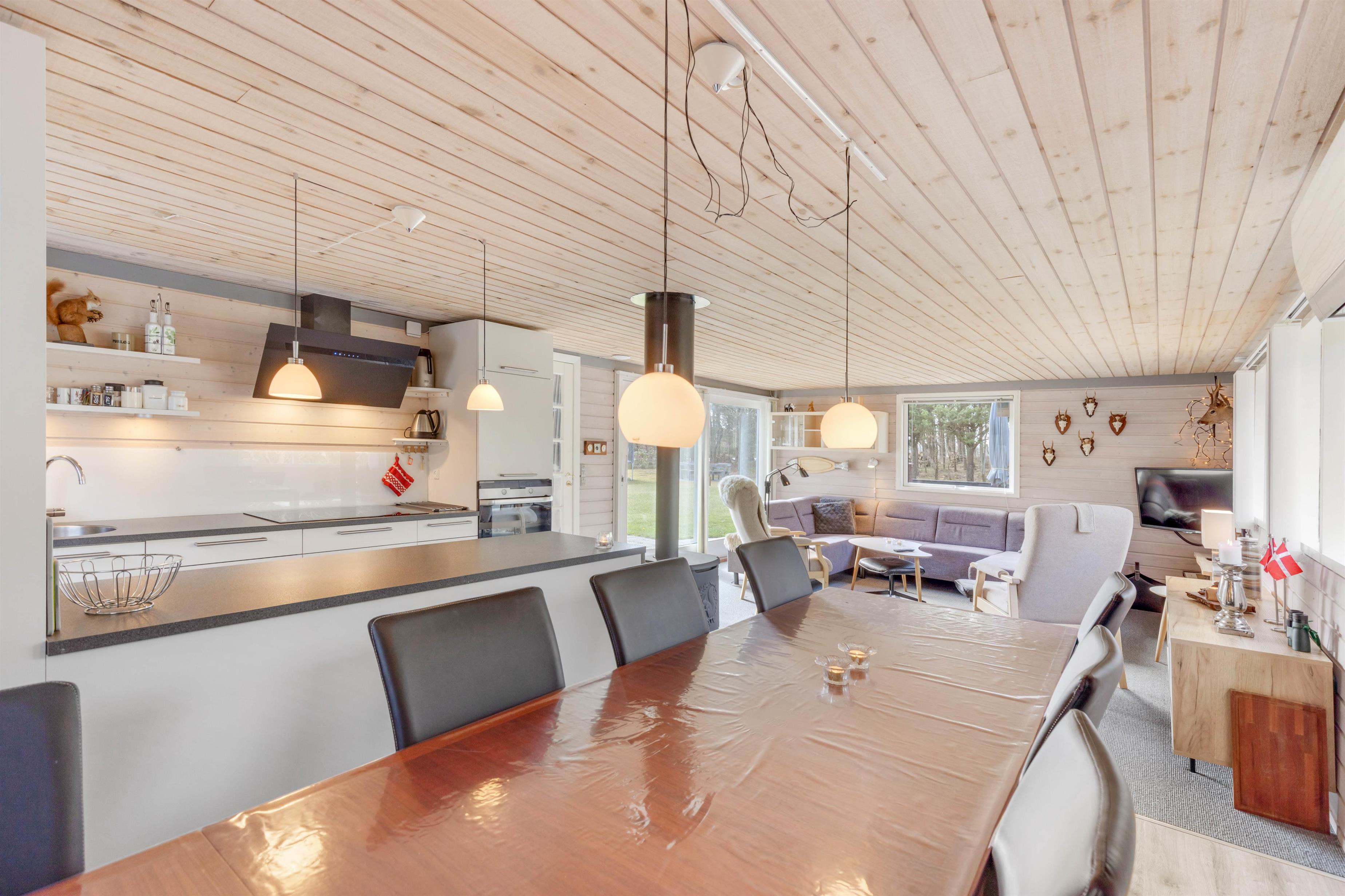 Feriestemningen er perfekt i dette feriehus med det typiske åbne køkken, en hyggespredende brændeovn og en dejlig stor hjørnesofa med plads til hele familien. Køkkenet er veludstyret og med opvaskemaskine, så der er god tid til andre familieaktiviteter. Tag fx en aftentur ved stranden med hunden og nyd efterfølgende en øl eller et krus varm kakao og et spil kort foran den knitrende brændeovn.
