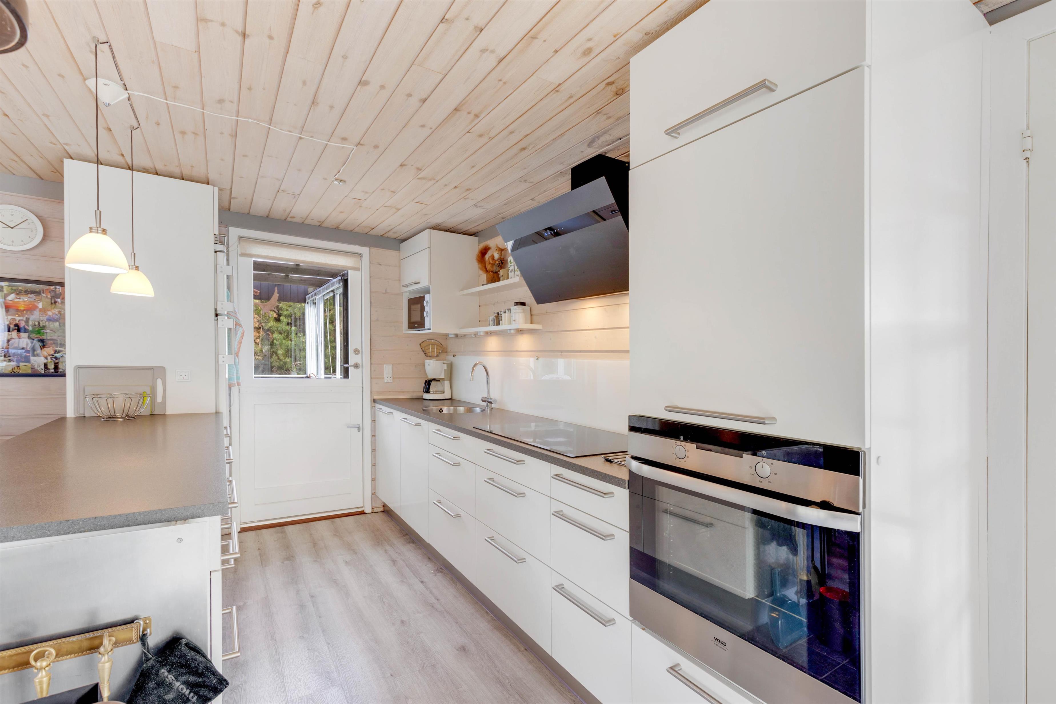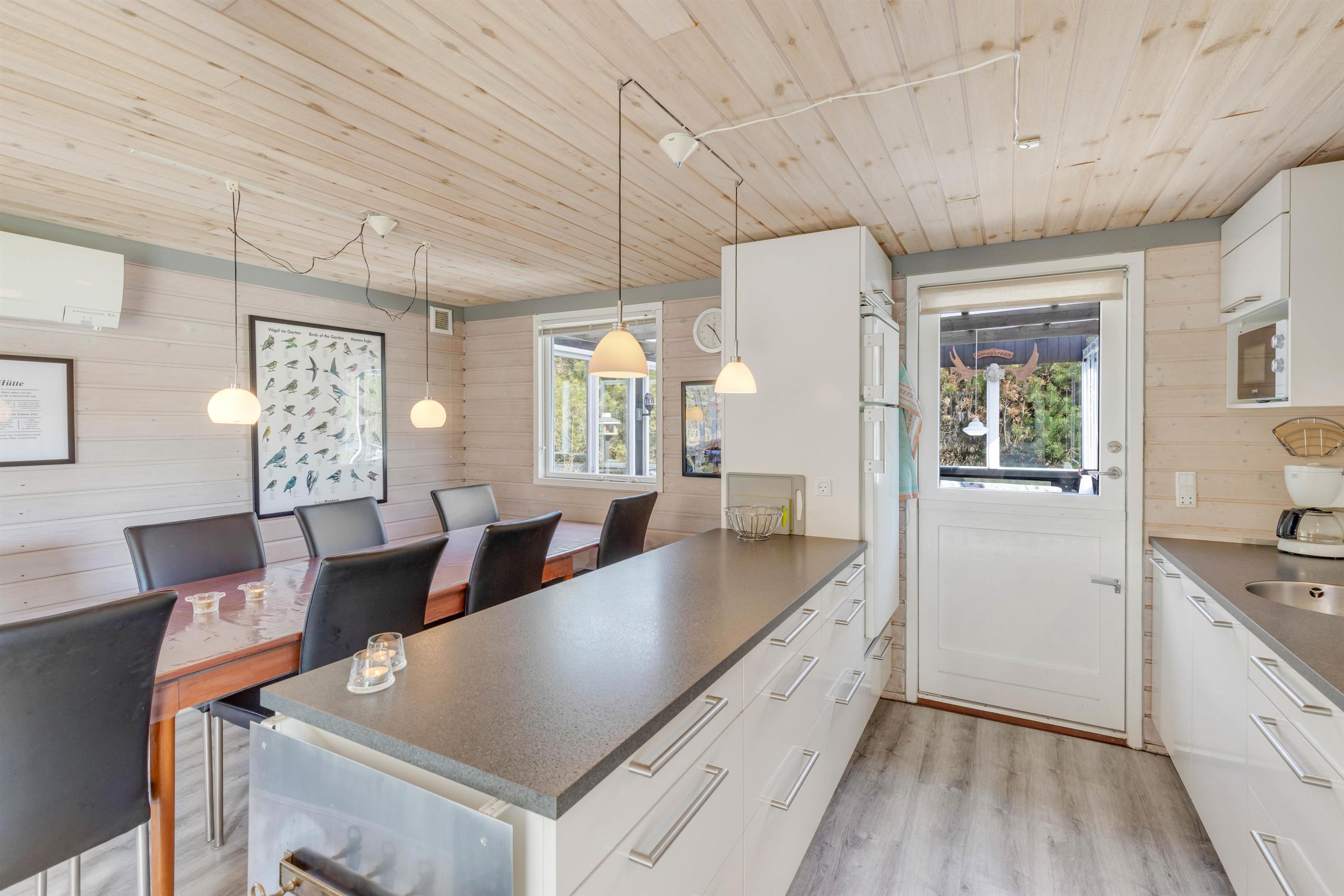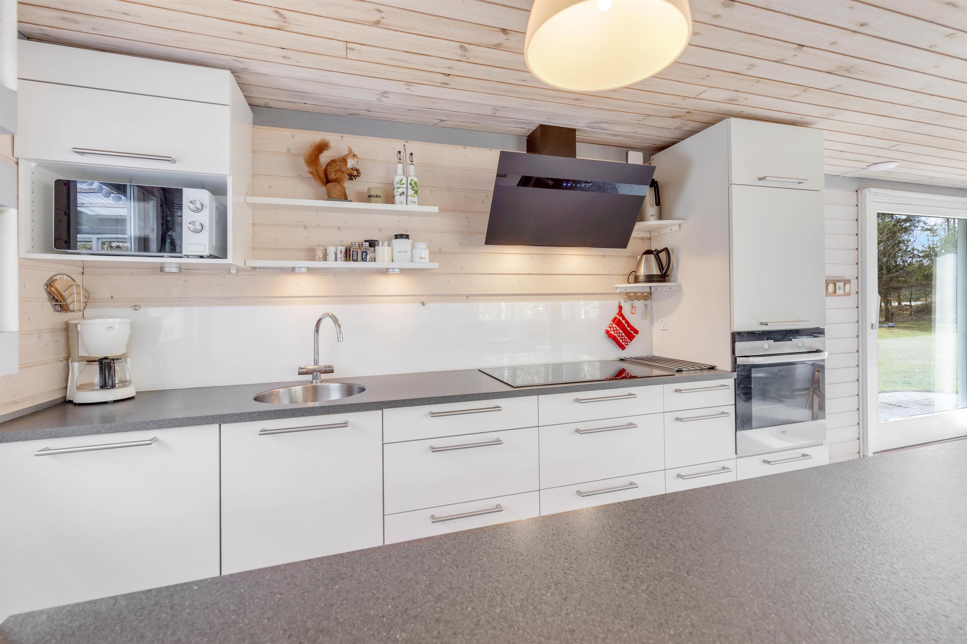 Feriestemningen er perfekt i dette feriehus med det typiske åbne køkken, en hyggespredende brændeovn og en dejlig stor hjørnesofa med plads til hele familien. Køkkenet er veludstyret og med opvaskemaskine, så der er god tid til andre familieaktiviteter. Tag fx en aftentur ved stranden med hunden og nyd efterfølgende en øl eller et krus varm kakao og et spil kort foran den knitrende brændeovn.