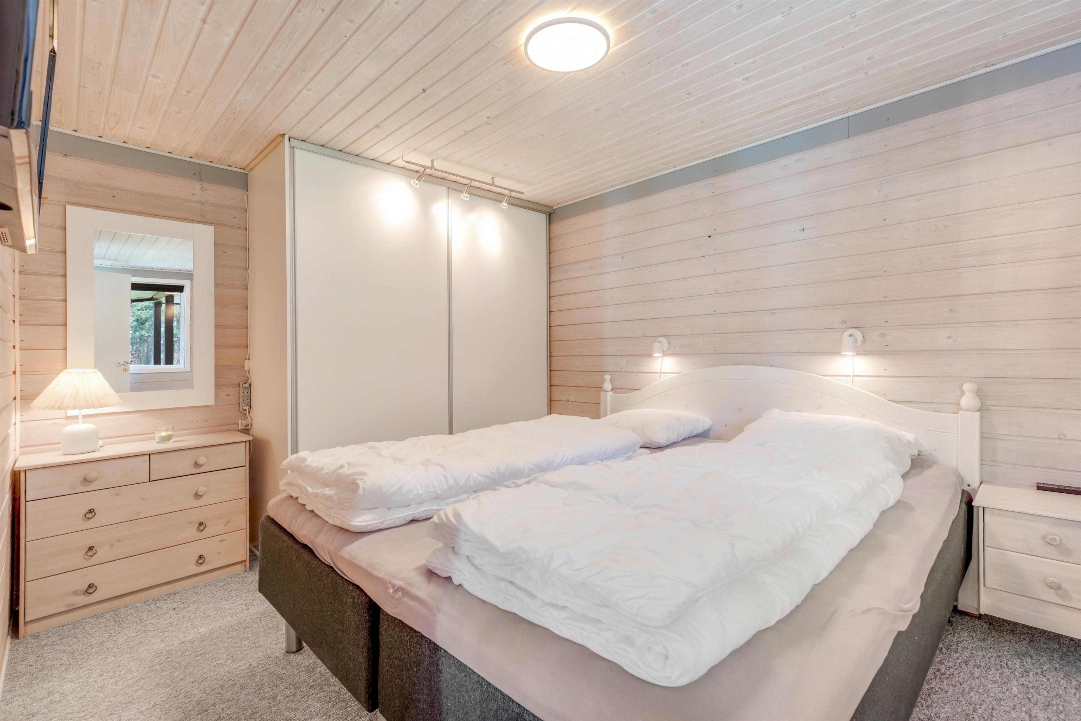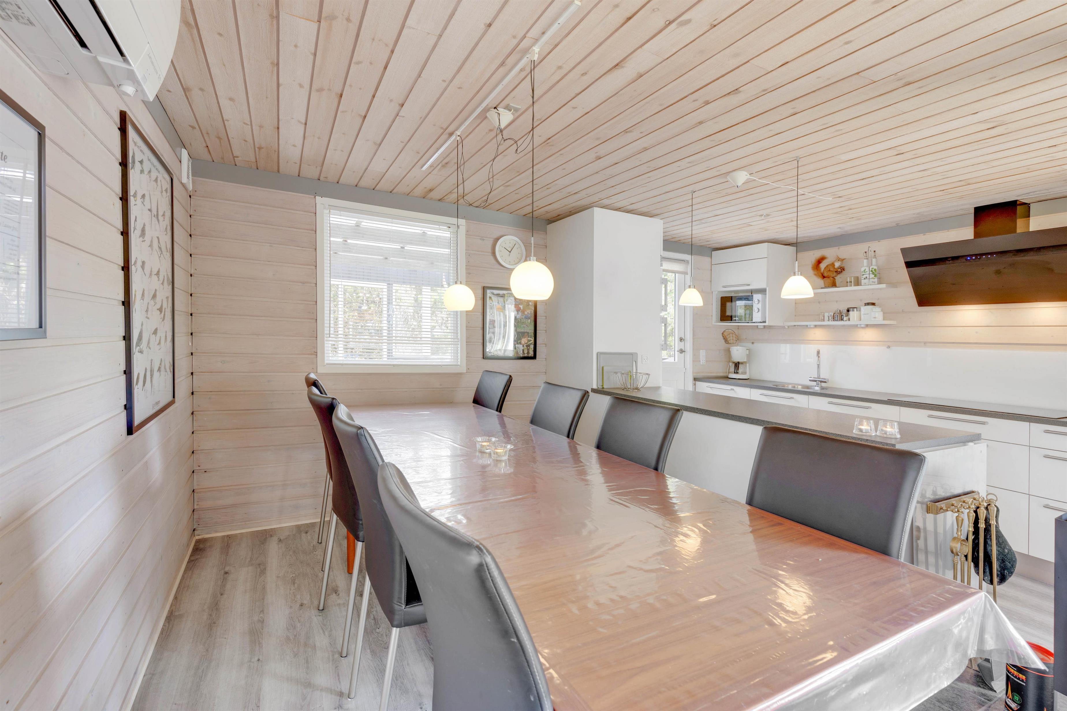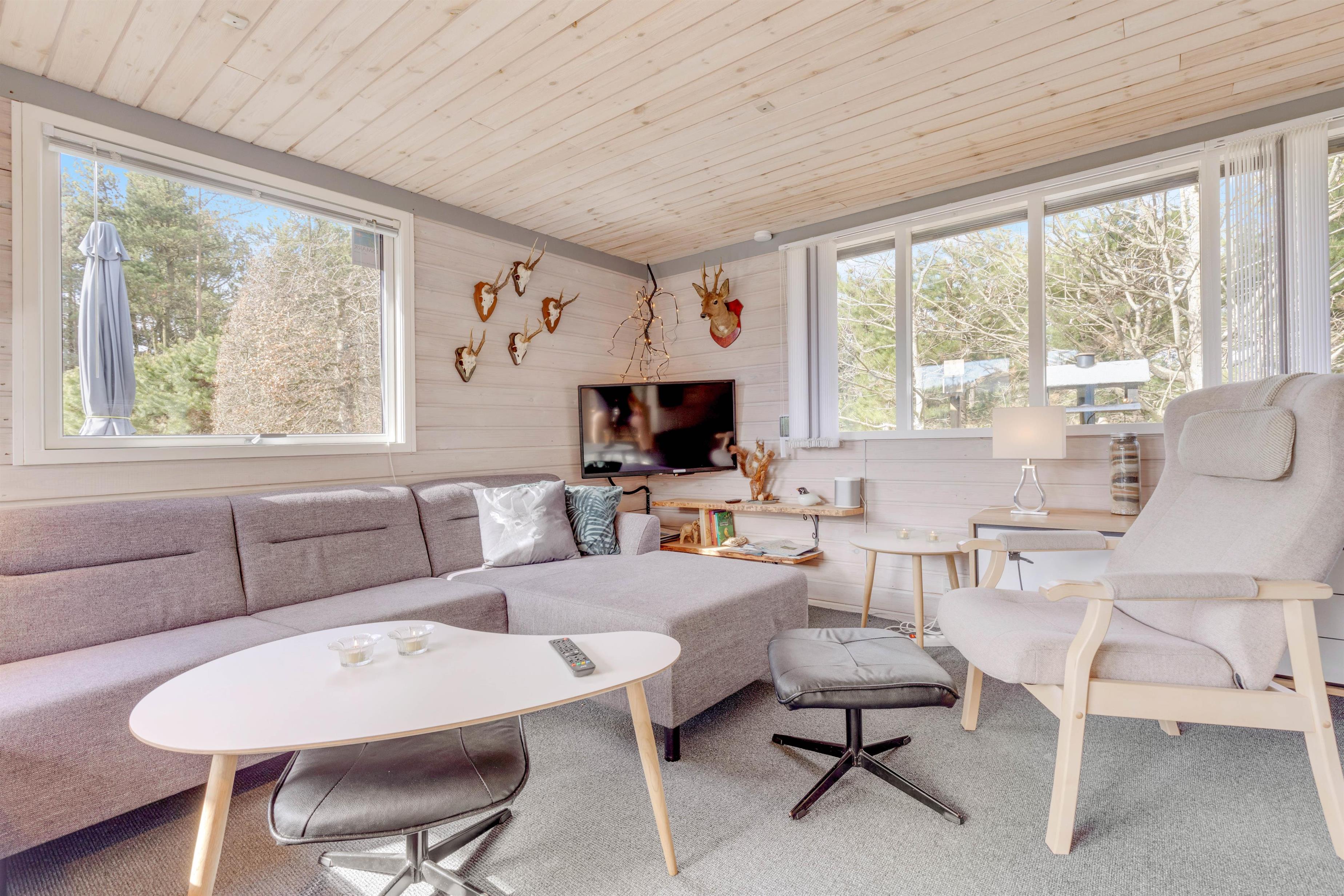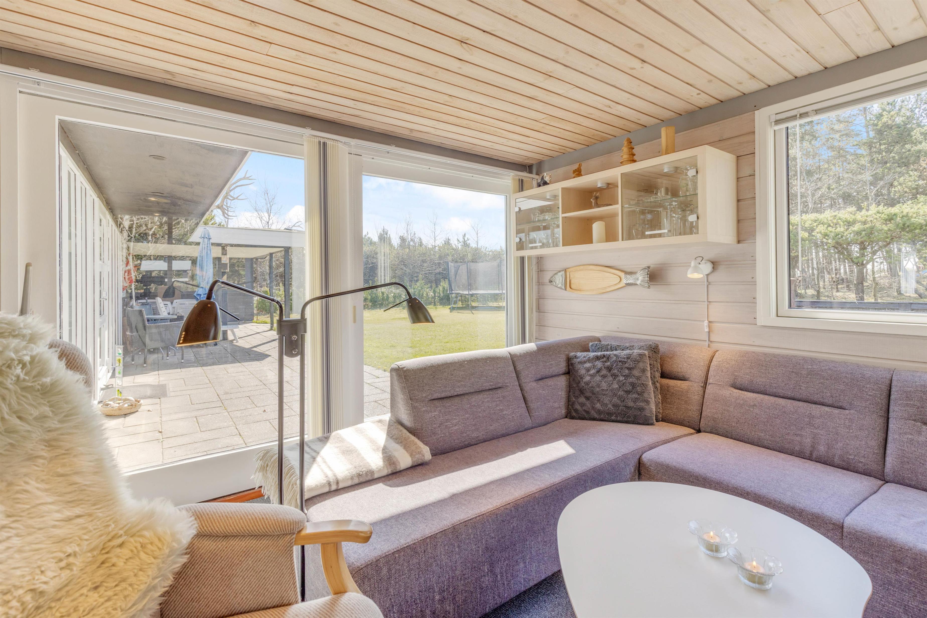 Feriestemningen er perfekt i dette feriehus med det typiske åbne køkken, en hyggespredende brændeovn og en dejlig stor hjørnesofa med plads til hele familien. Køkkenet er veludstyret og med opvaskemaskine, så der er god tid til andre familieaktiviteter. Tag fx en aftentur ved stranden med hunden og nyd efterfølgende en øl eller et krus varm kakao og et spil kort foran den knitrende brændeovn.