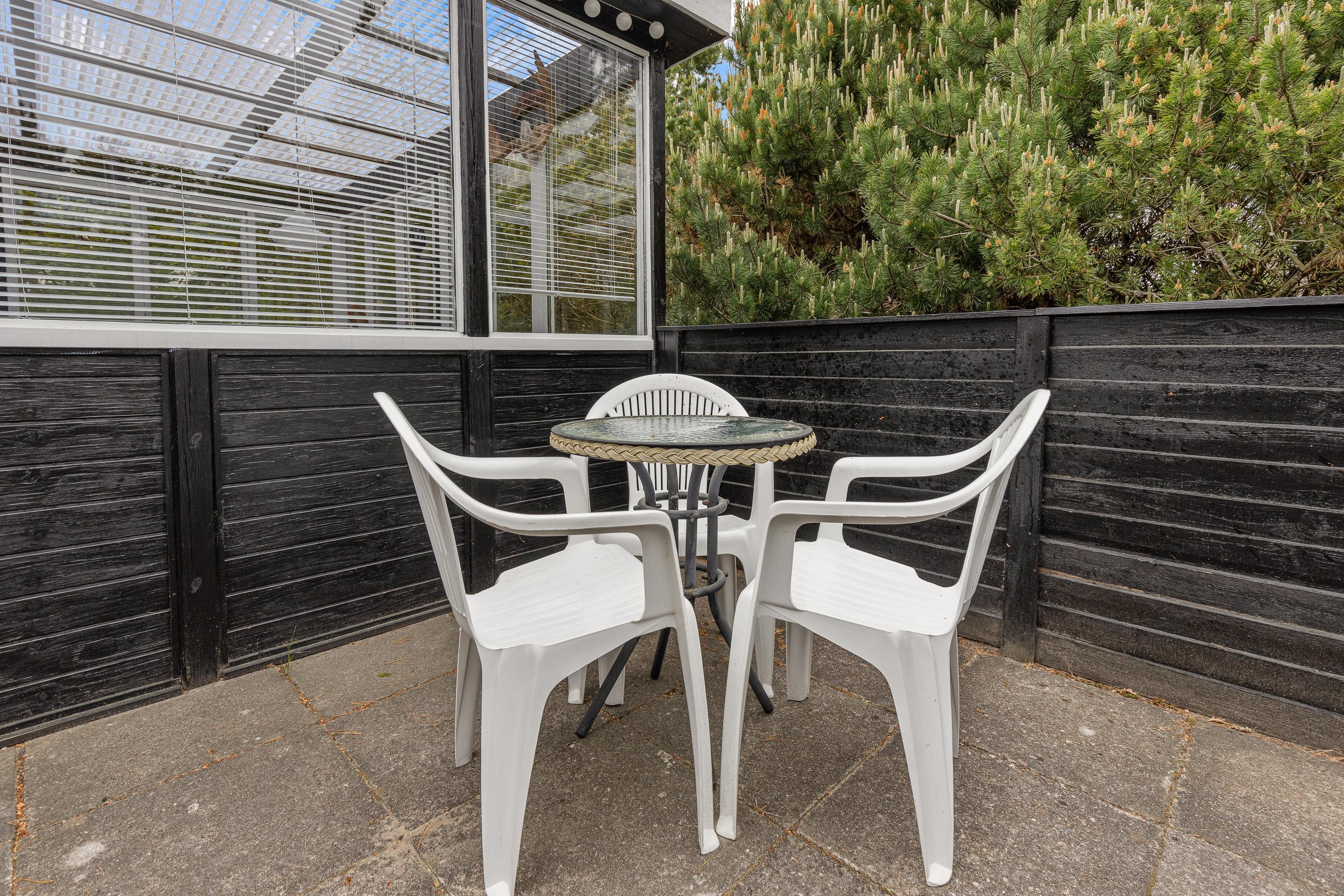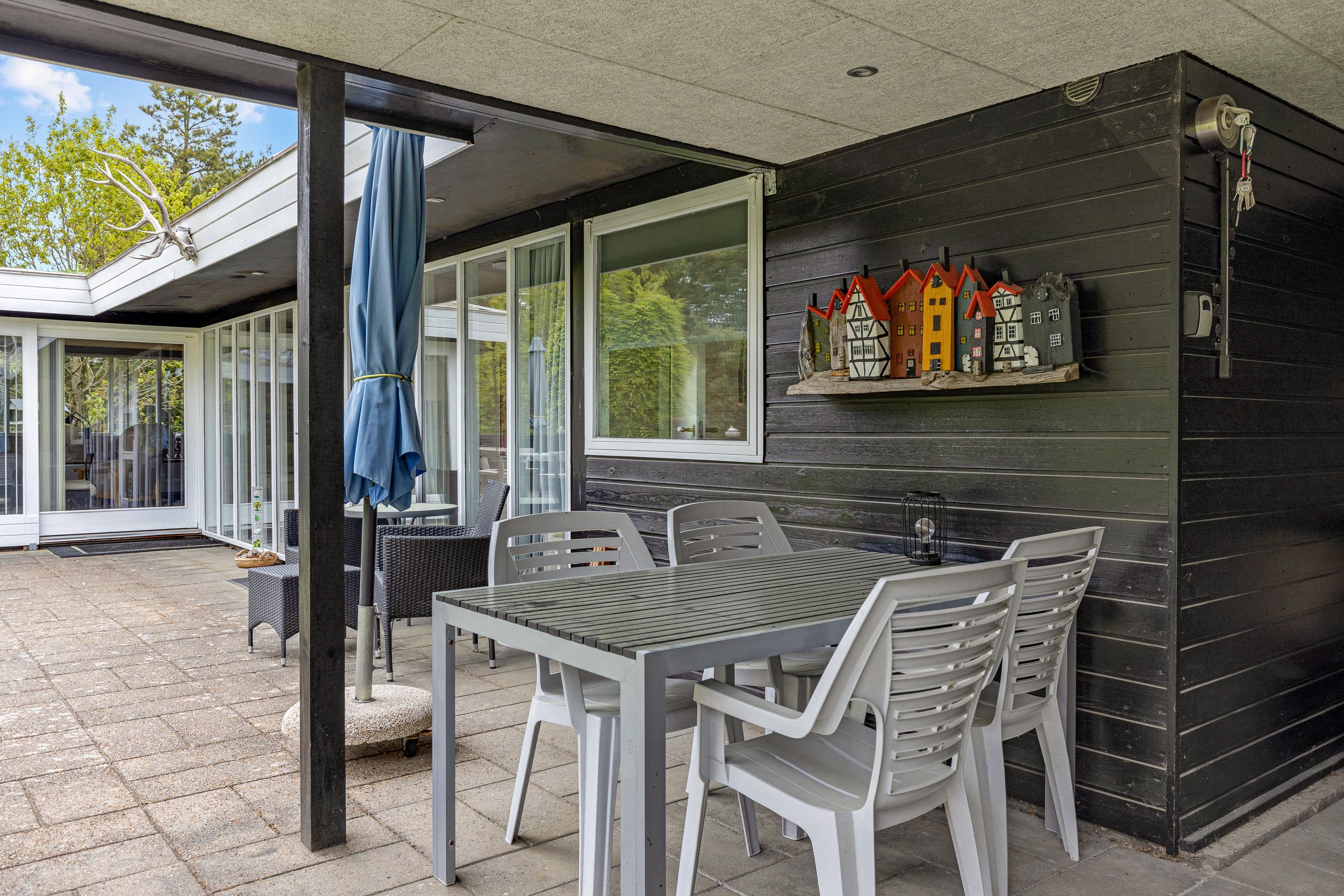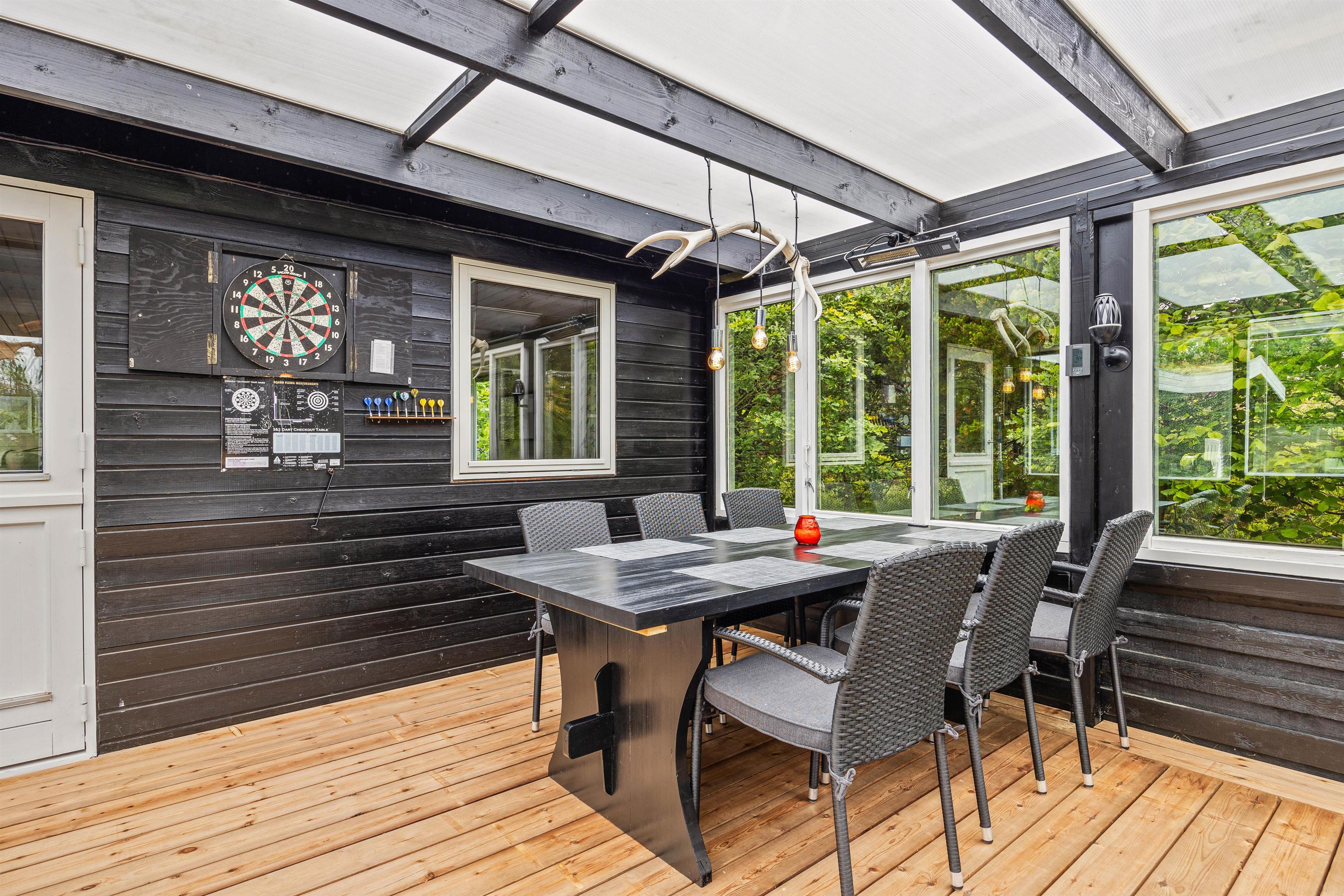 Her er det herligt at slappe af på liggestolene på den store lukkede terrasse. Og skal der grilles eller hygges udendørs, så er det perfekt med et stort overdækket og læfyldt areal, hvor skovens svampe kan sorteres før de tilberedes i køkkenet. Måske hører I også til dem, der gerne nyder aftenstemningen med spil og sang og som nyder at kunne dække op til grillmad, selv når vejret egentligt ikke spiller helt med.