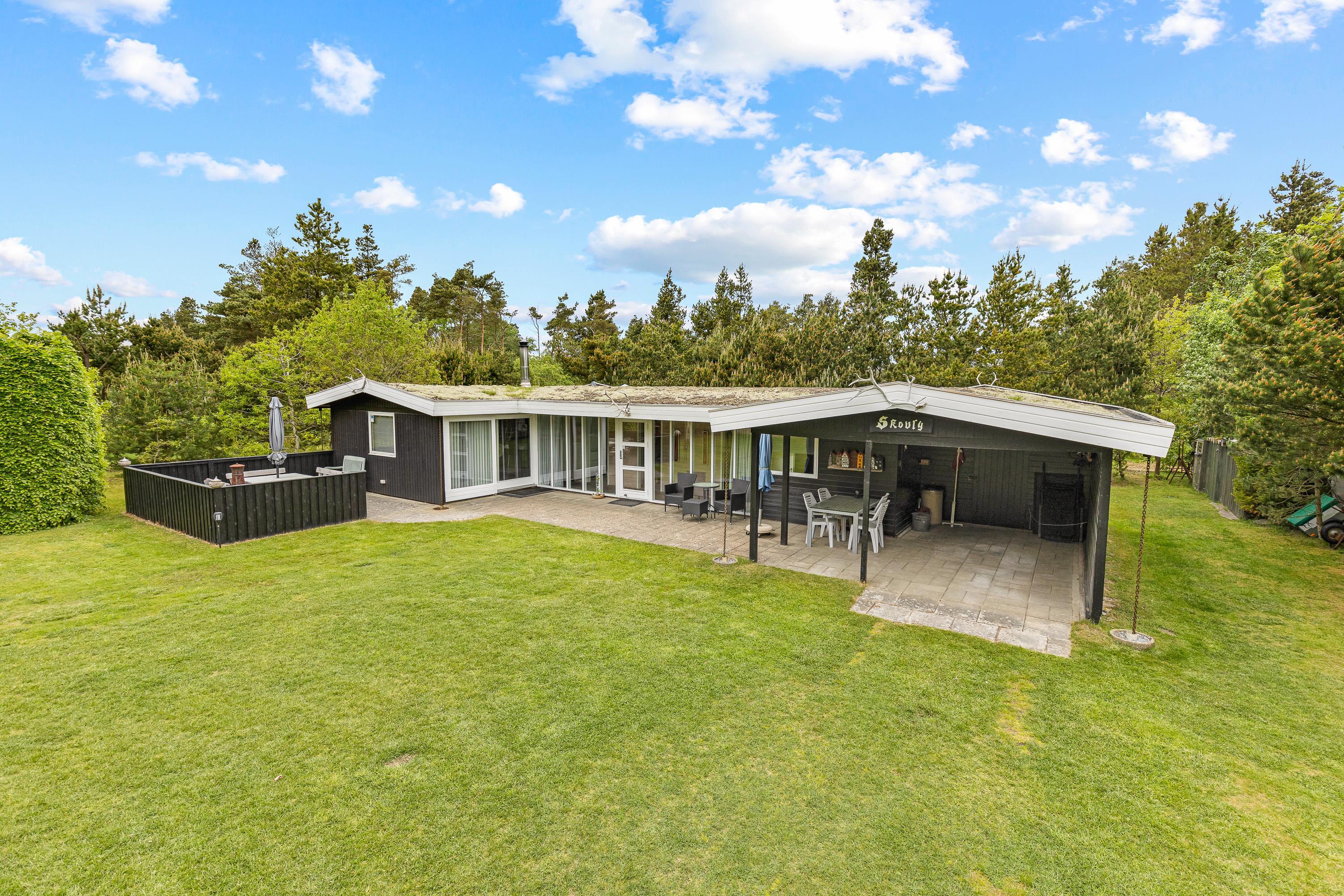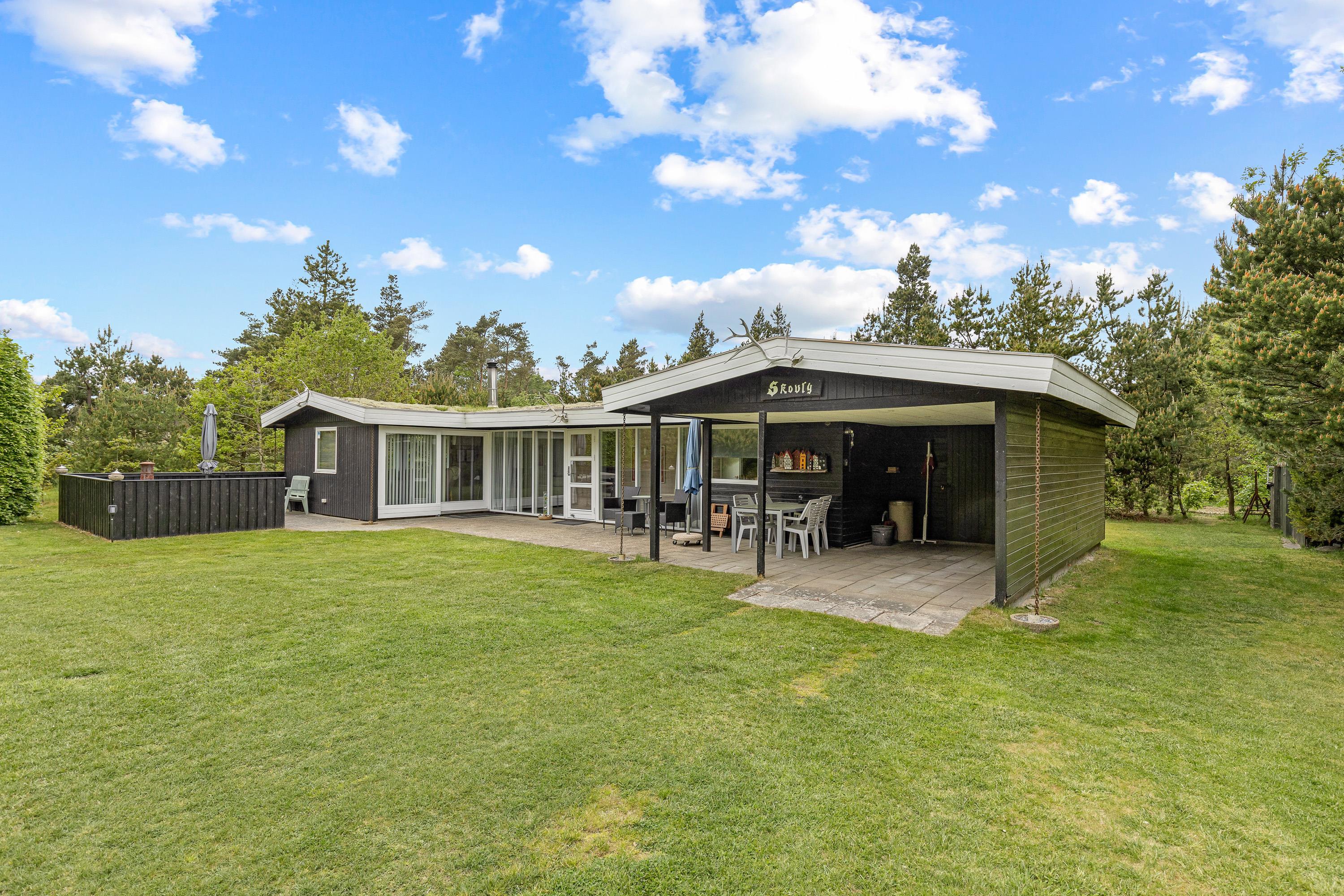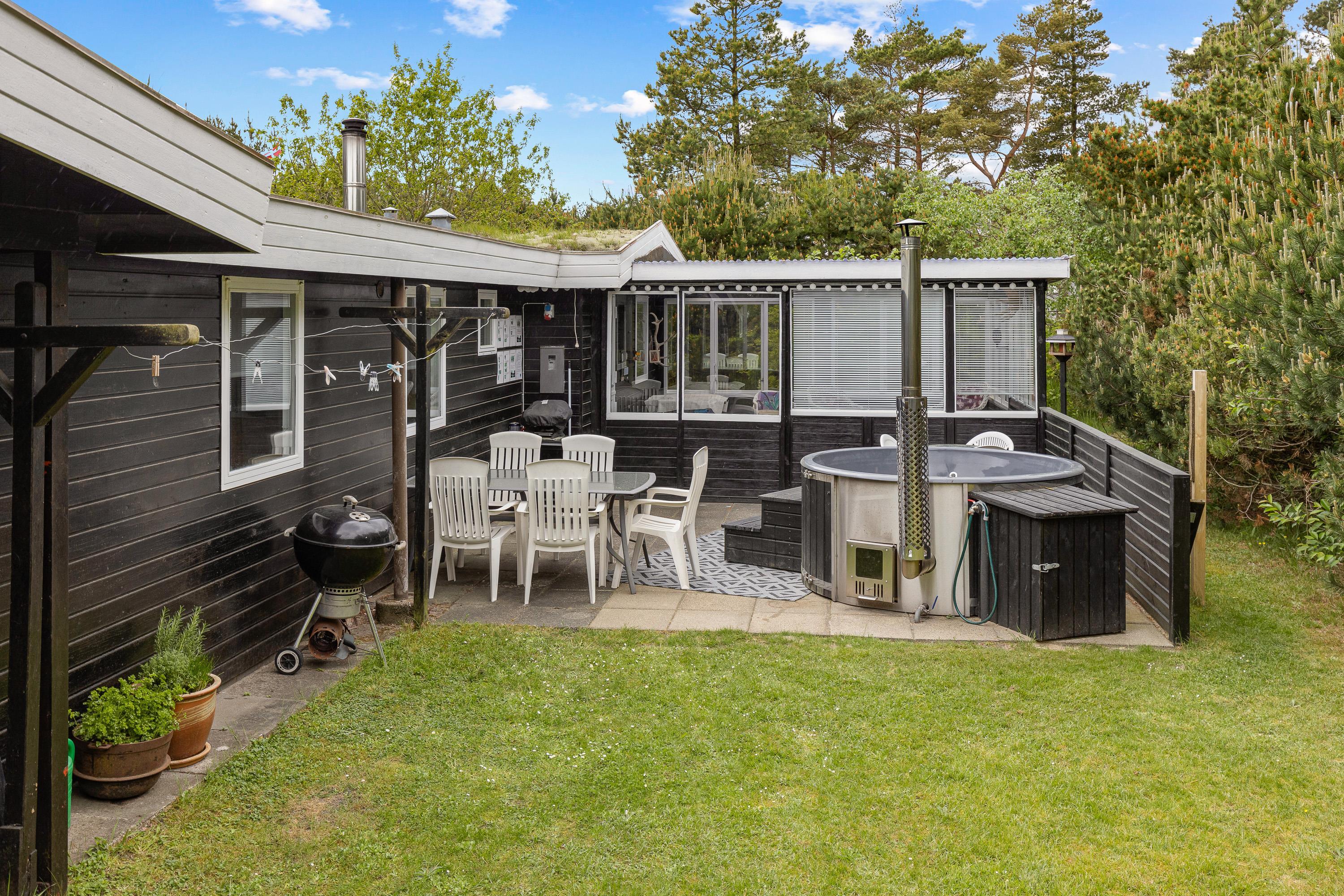 Sommerhuset ligger som et åbent U mod solen og har flere terrasseudgange fx fra stuen og soveværelset. Den store grund tillader masser af lys samtidig med at randbeplantningen giver læ og hygge. Den store græsplæne inviterer i øvrigt alle boldentusiaster til en fodboldturnering.