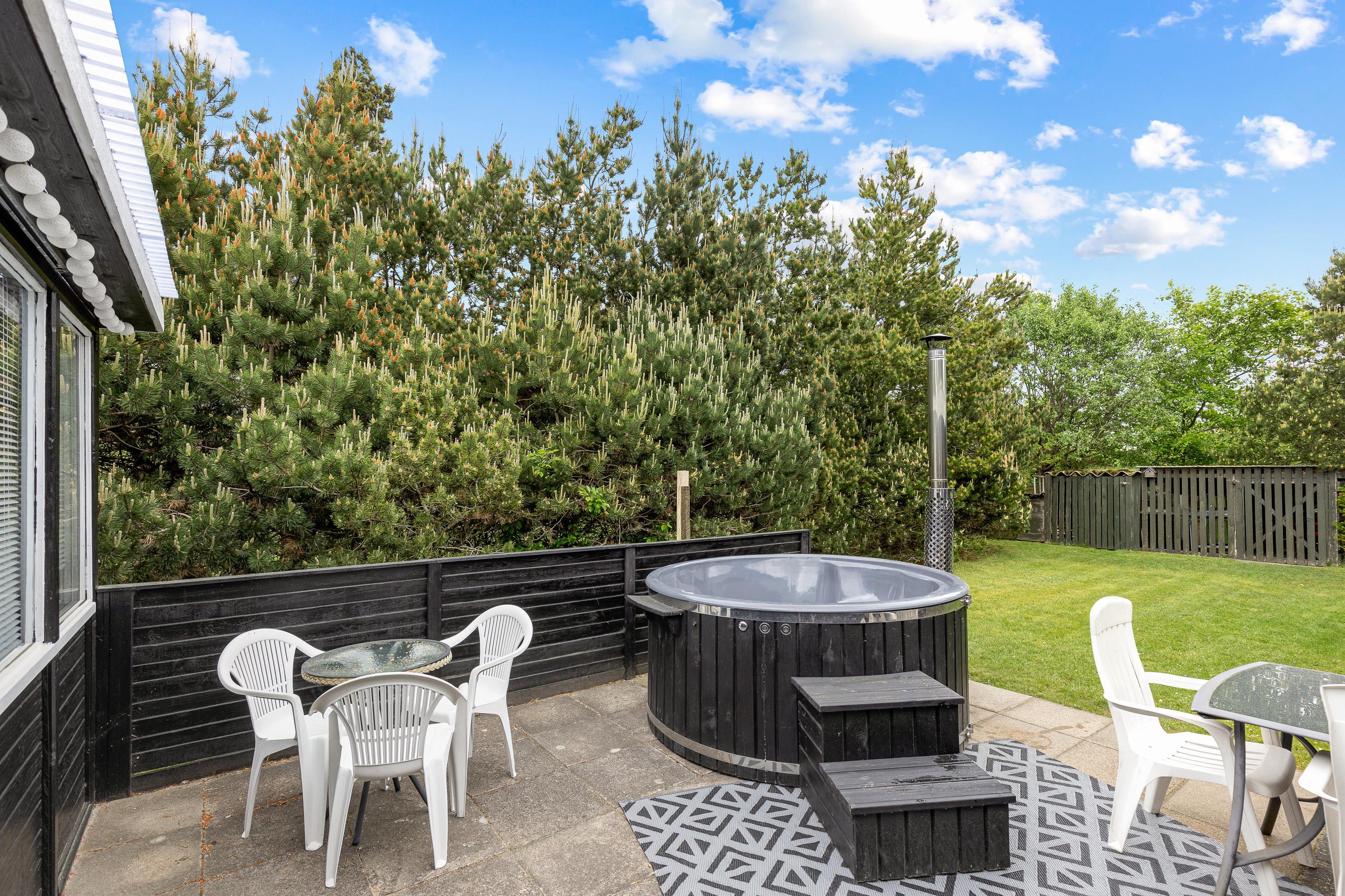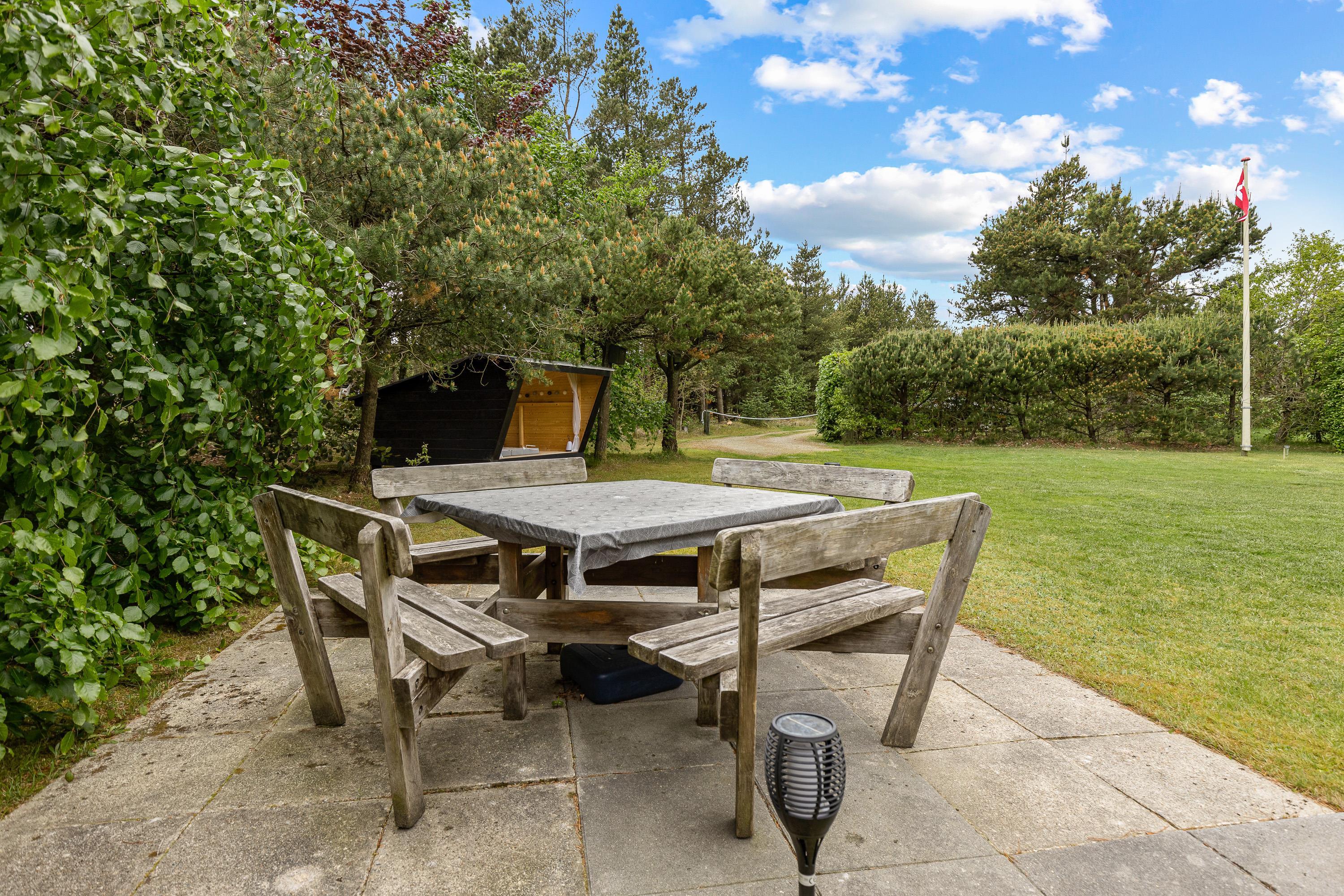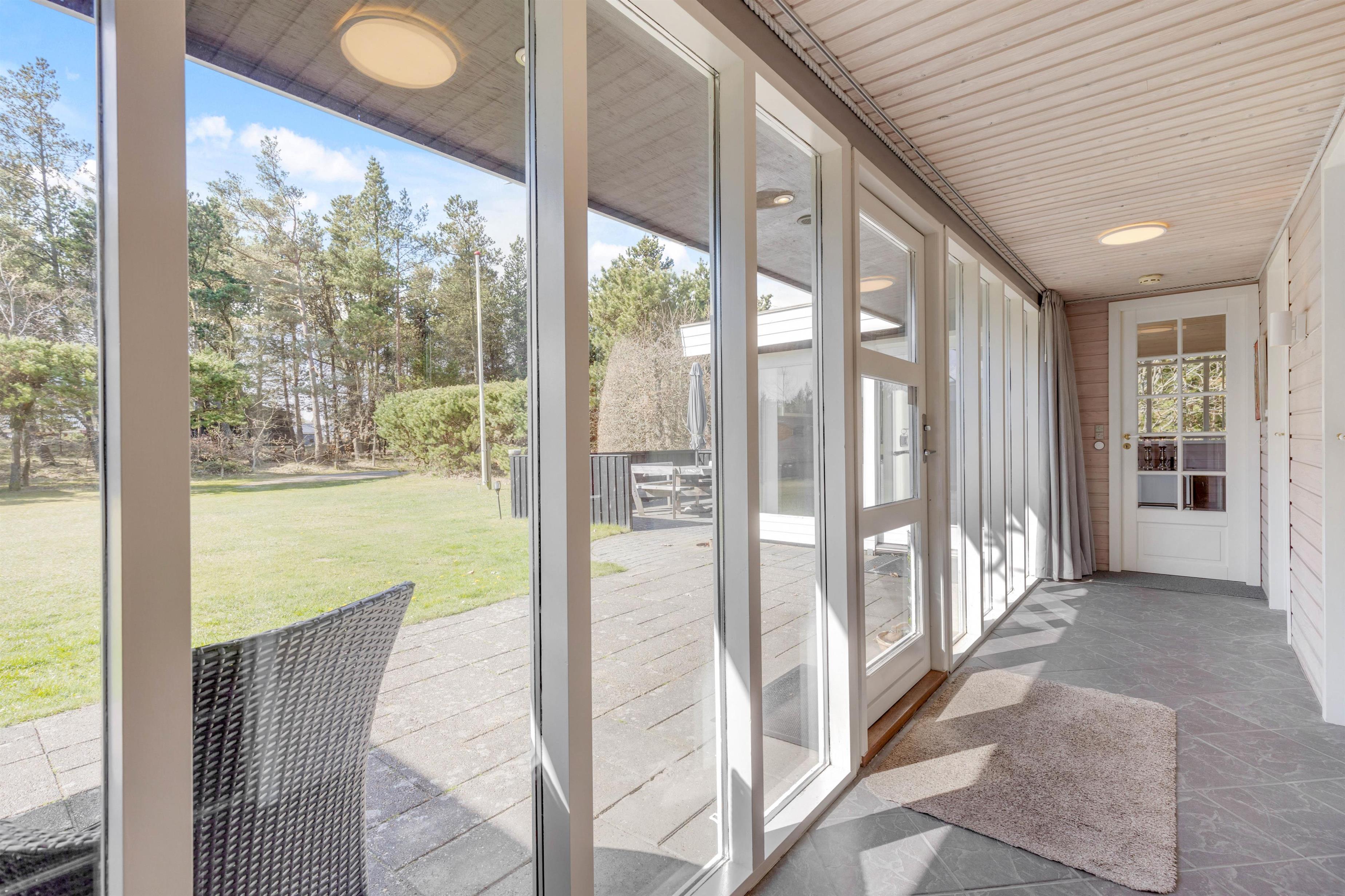 Sommerhuset ligger som et åbent U mod solen og har flere terrasseudgange fx fra stuen og soveværelset. Den store grund tillader masser af lys samtidig med at randbeplantningen giver læ og hygge. Den store græsplæne inviterer i øvrigt alle boldentusiaster til en fodboldturnering.