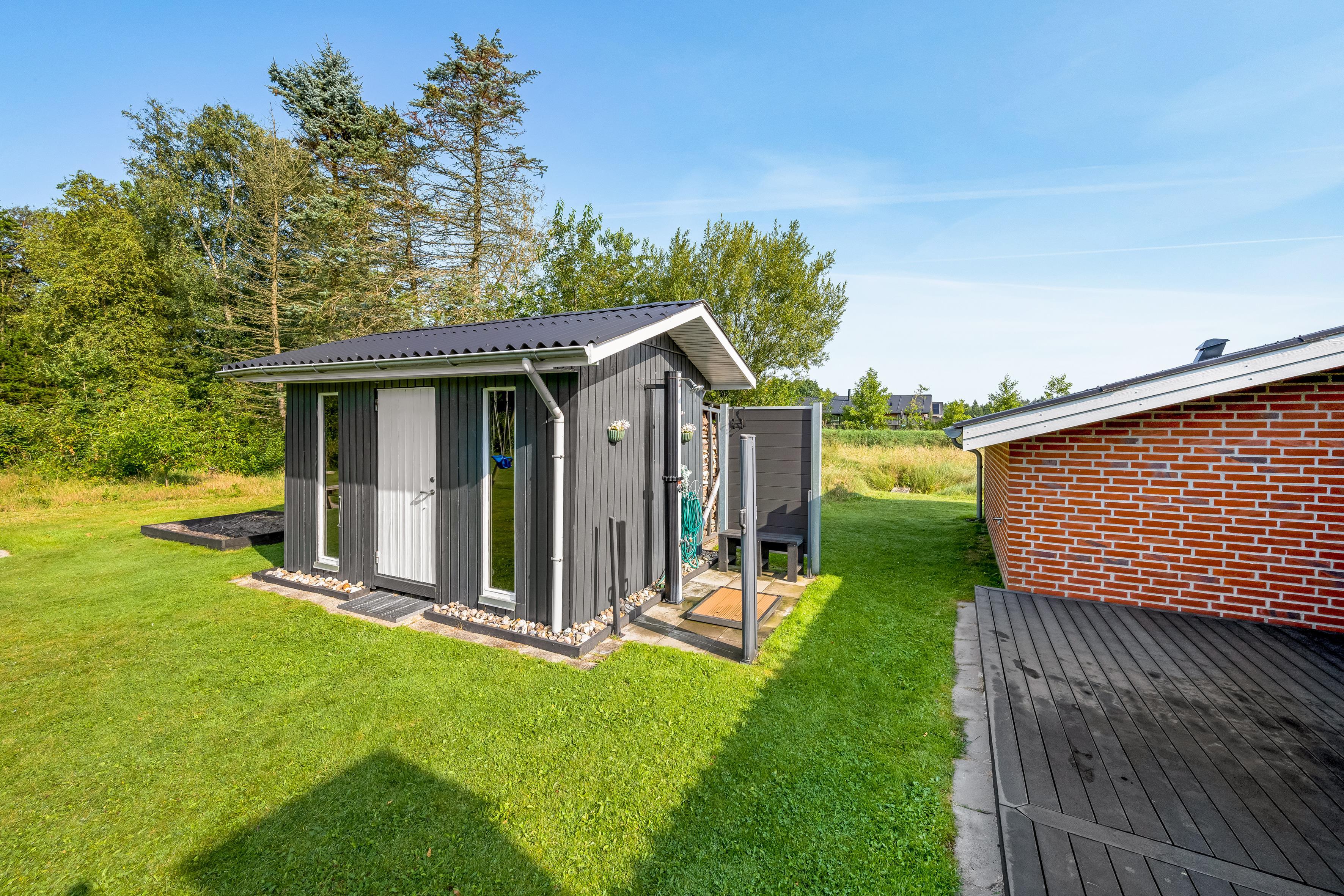 Sommerhuset ligger på en 2.098 m² stor naturgrund. Her kan I nyde den friske luft og roen i det danske landskab. På de komfortable havemøbler og liggestole på den delvist overdækkede og delvist afskærmede terrasse kan I slappe af, mens I bruger gasgrillen til en lækker barbecue. Er man til et frisk bad så er udebruseren til fri benyttelse fra april til november.