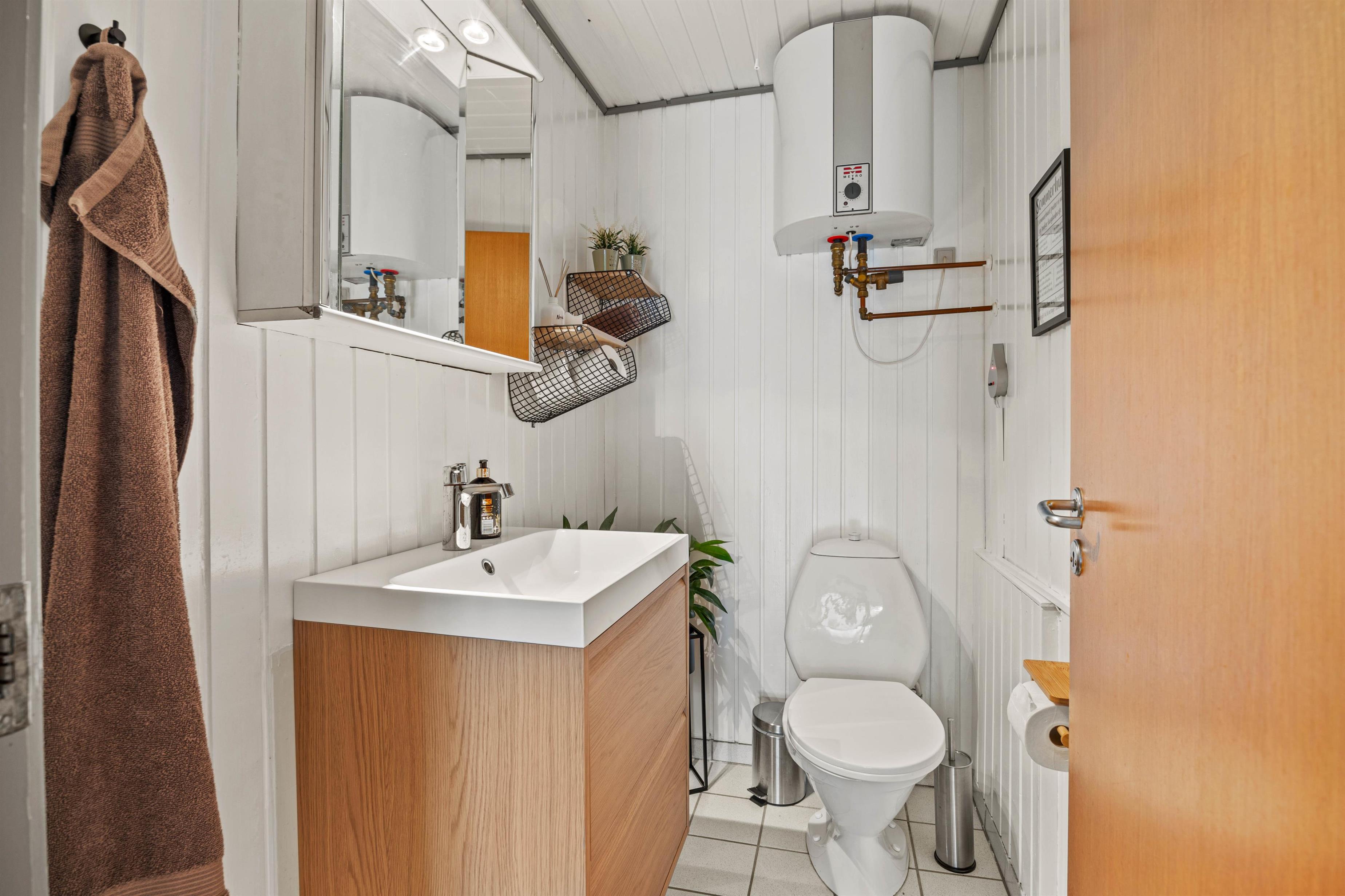 Det dagslysfyldte badeværelse, renoveret i 2025, har gulvvarme samt vaskemaskine og tørretumbler. Et ekstra gæstetoilet gør hverdagen mere afslappet. Sommerhusets sauna inviterer til lange saunagange, og fra april til november kan I benytte udendørsbruseren til en forfriskende afkøling efter saunaturen.