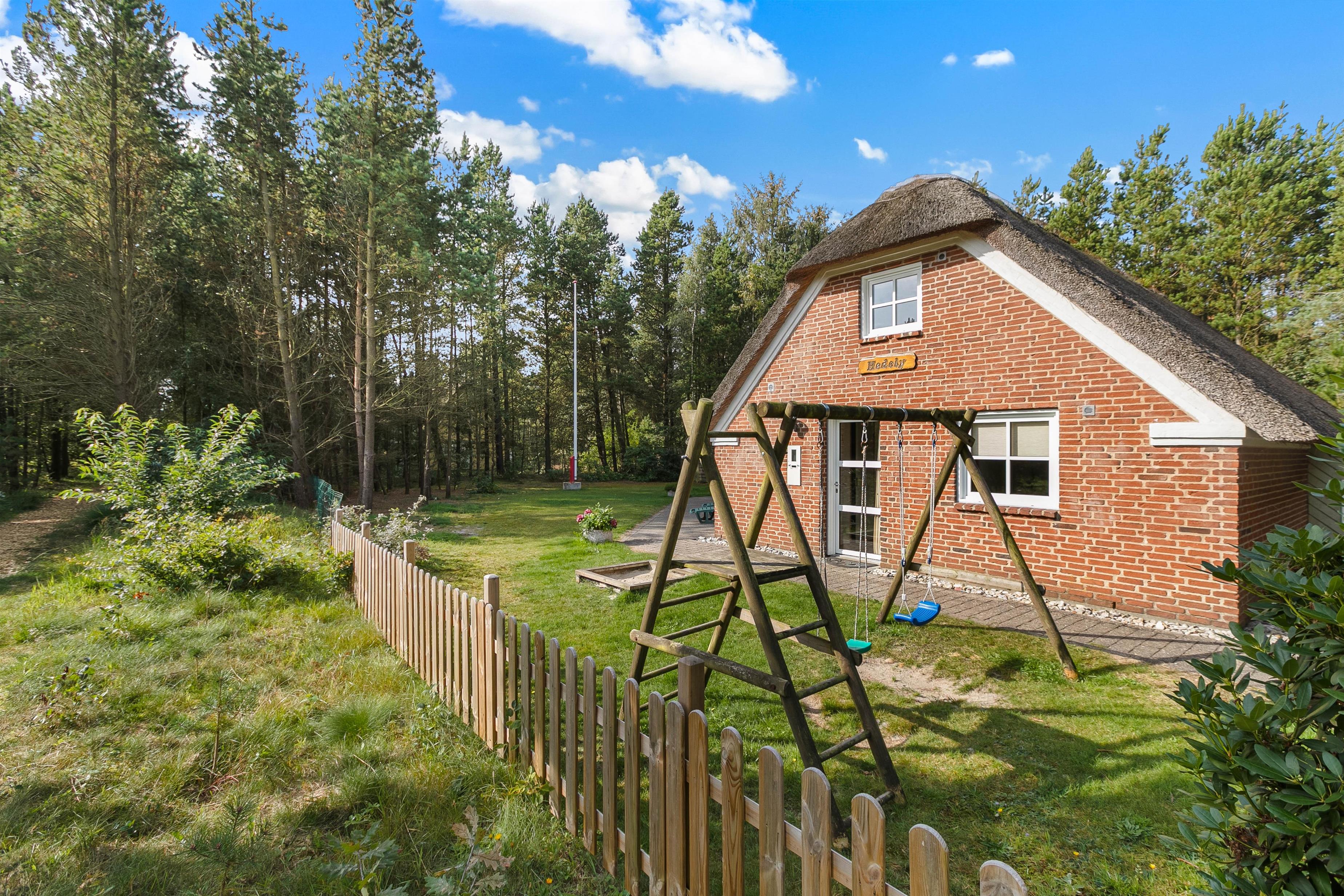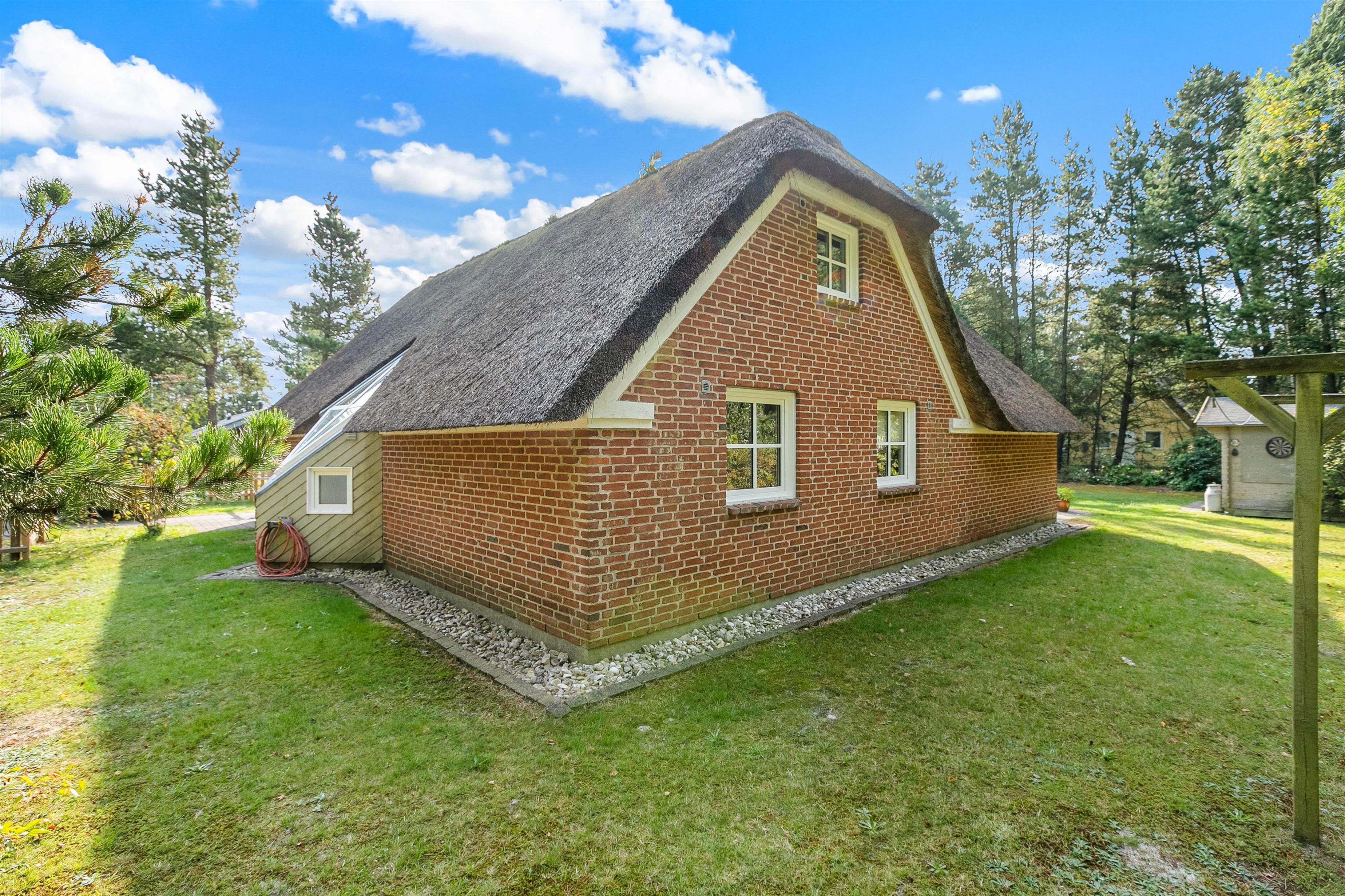 Indenfor indbyder det solide murstenshus med stråtag til afslapning og socialt samvær med de nærmeste. Et ideelt feriehus til den store børnefamilie skal på tur, eller hvis I er flere par, der skal på tur! Her er fem soveværelser, hvoraf to er at finde på førstesalen.