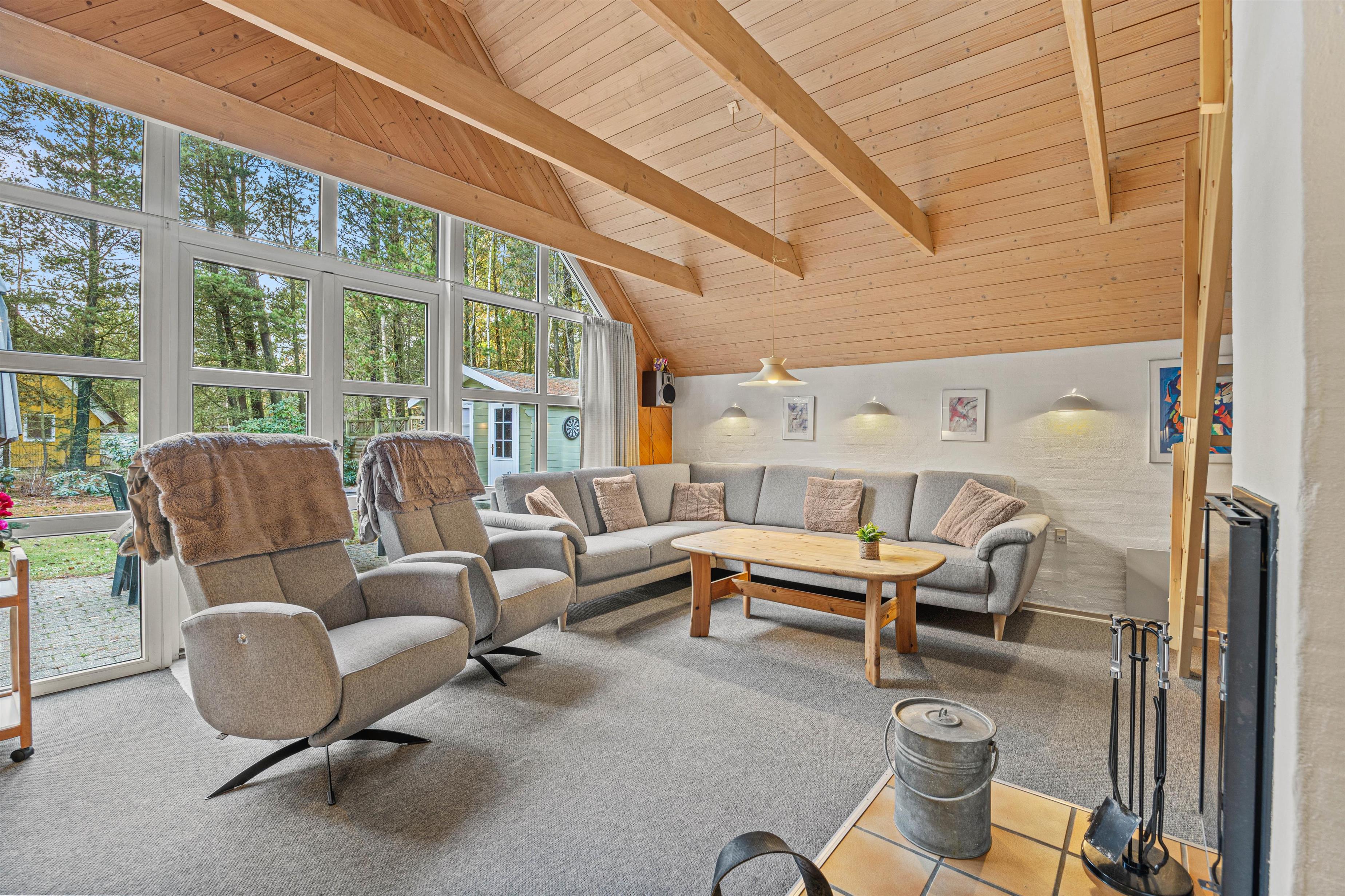 Særligt skønt er opholdsrummet, hvor stuen og køkkenet er samlet i ét. Feriehusets naturlige midtpunkt, hvor I alle kan samles. Her er en god loftshøjde og et stort vinduesparti, der lukker dagslyset ind og giver udkig til haven. Slå jer ned i sofaen med popcorn og en god film, mens brændeovnen knitrer hyggeligt i baggrunden. Fra stuen er der endvidere udgang til terrassen og den dejlige lukkede grund.