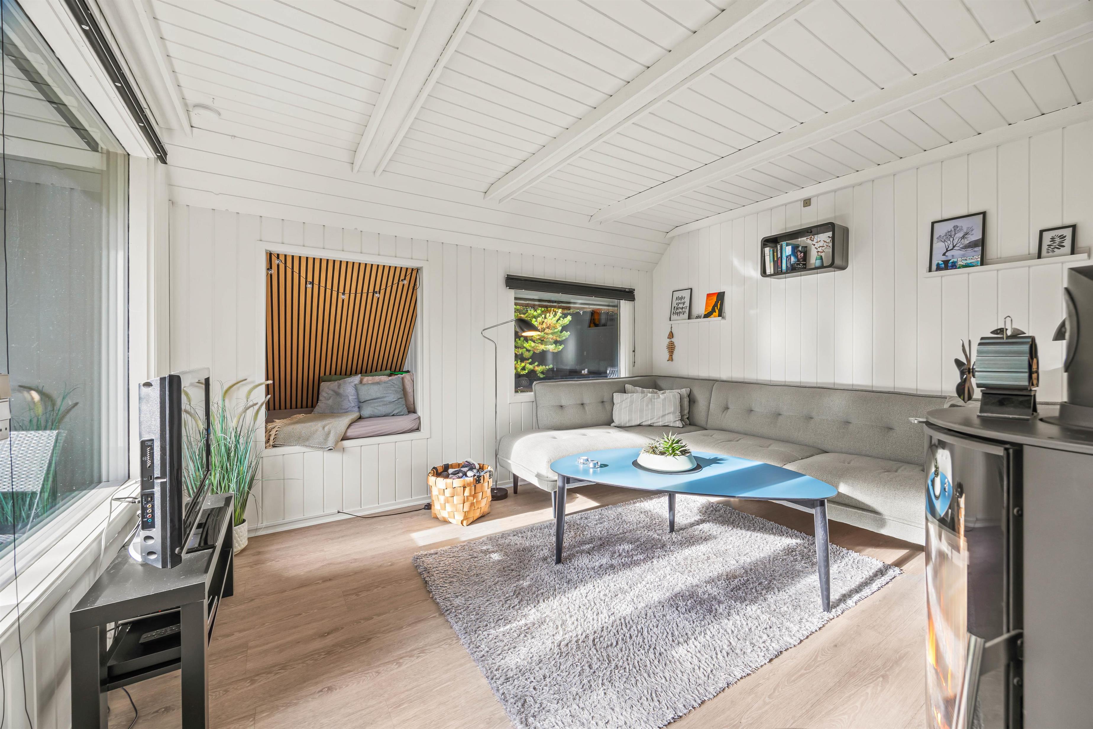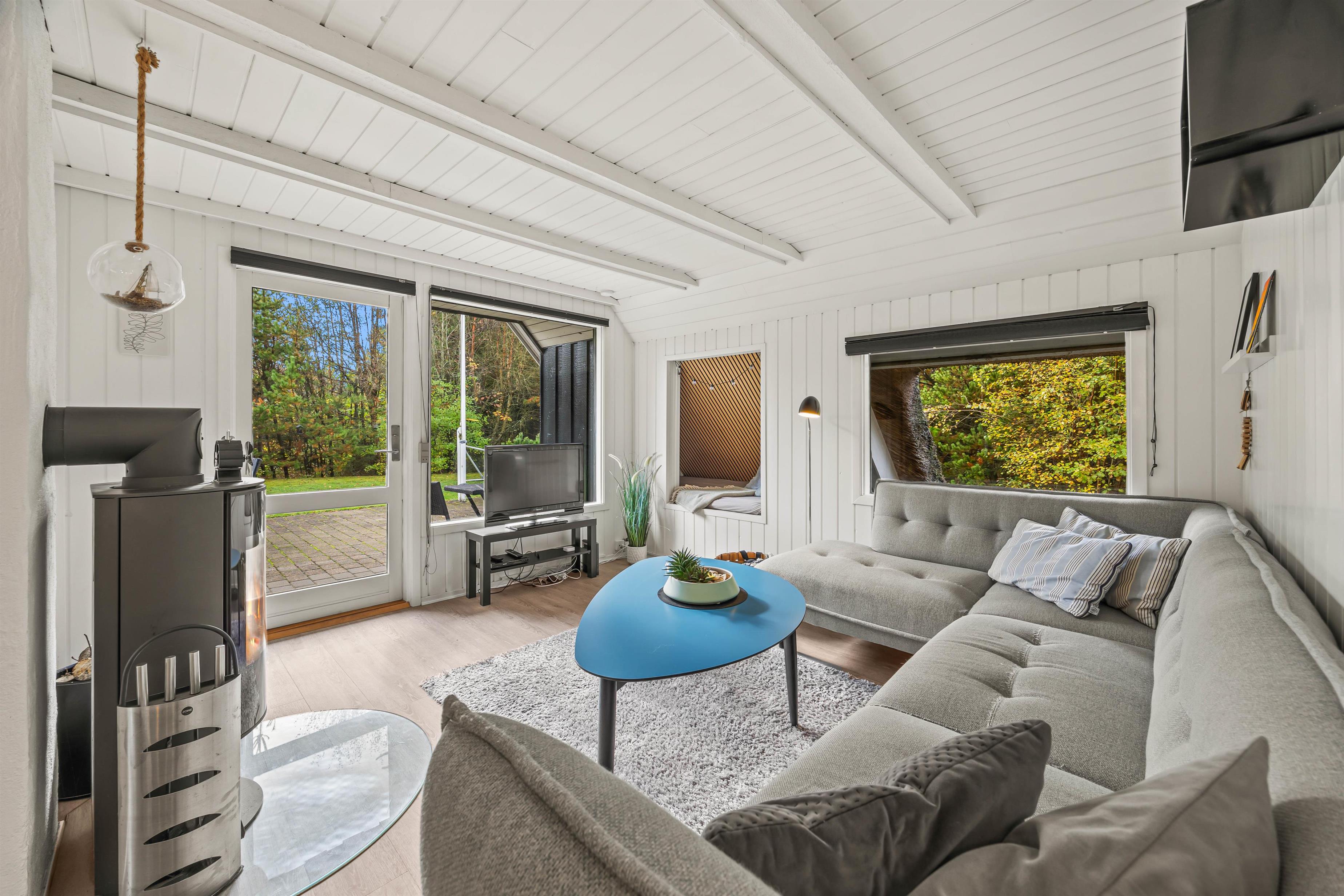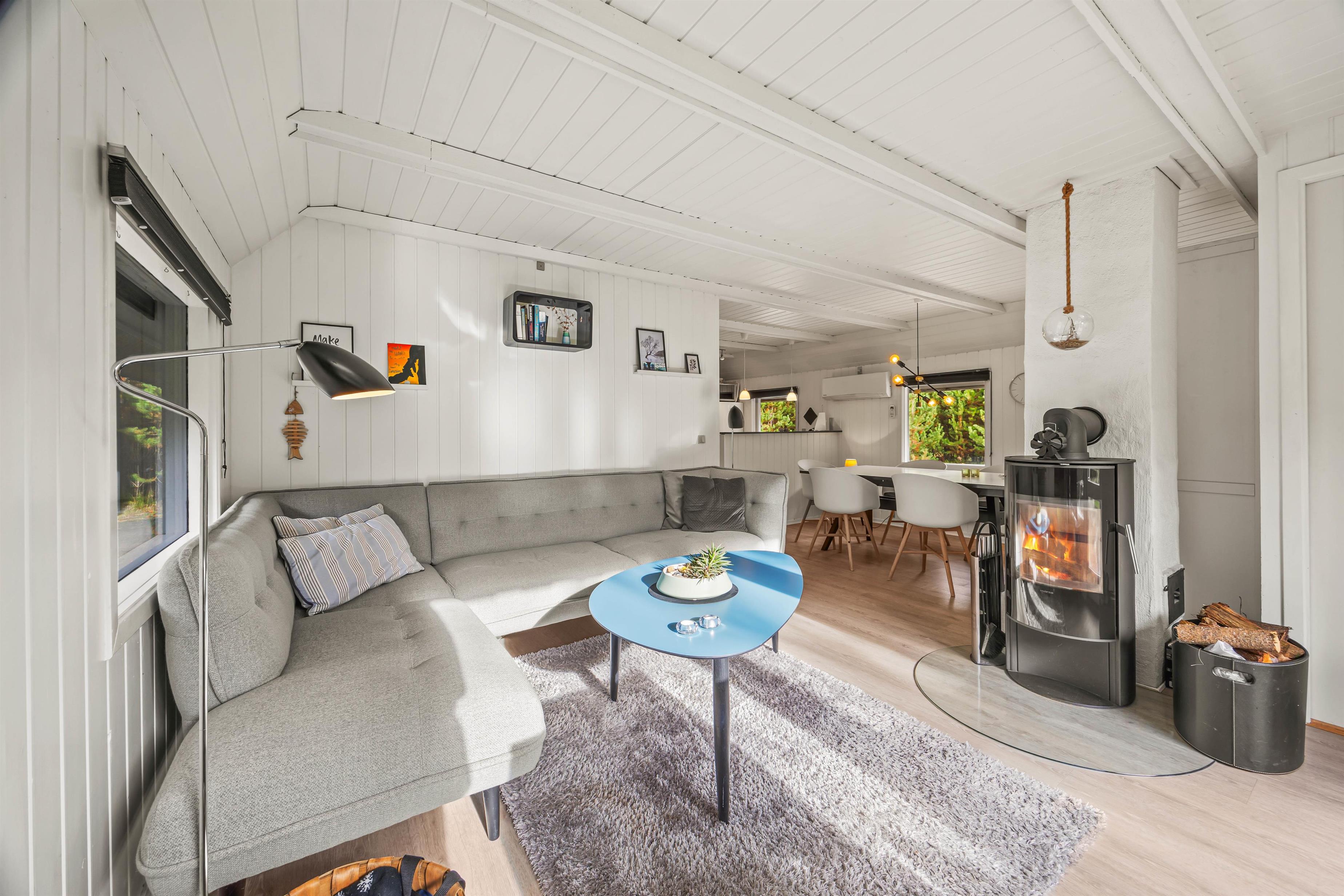 Dette klassiske stråtækte sommerhus byder på et lyst og åbent opholdsrum med store vinduer, der skaber en varm og indbydende stemning. Komfortable sofaer inviterer til afslapning, mens brændeovnen sikrer hyggelig atmosfære på de kølige aftener. Varmepumpen kan også benyttes til hurtigt og effektivt at opvarme sommerhuset.