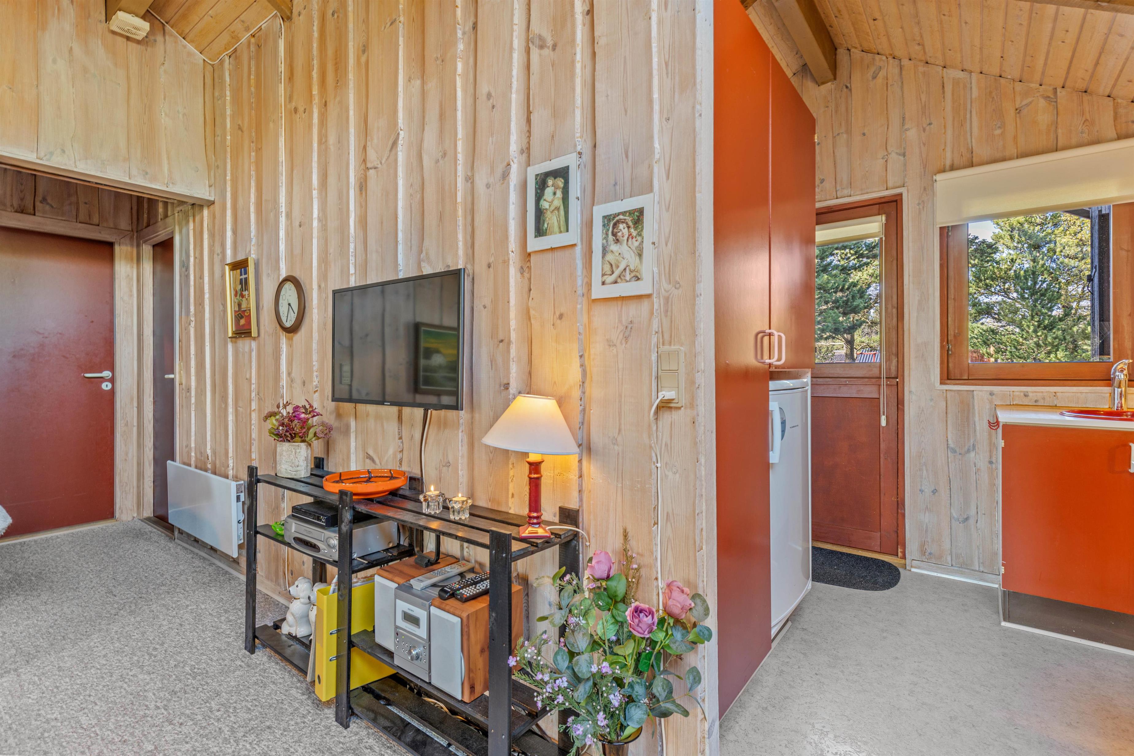 Opholdsstuen med åben forbindelse til køkkenet fungerer som husets hjerte og bliver familiens mødested. Her kan der kokkereres, hygges med film og snacks og spilles spil langt ud på de sene aftentimer. Her står også brændeovnen, hvis knitrende flammer spreder masser af hyggelig stemning og varme på de kolde feriedage. I både stuen og badeværelset er der ovenlysvinduer, der fylder rummene med et naturligt og behageligt lys i dagstimerne.