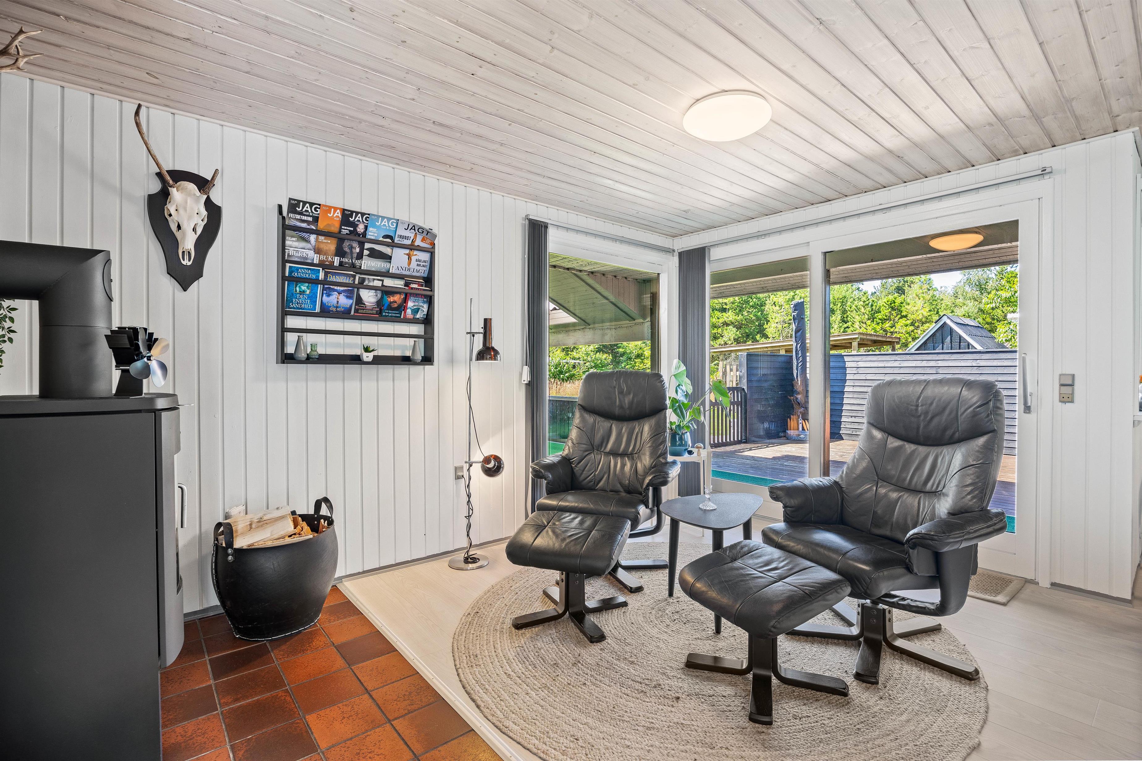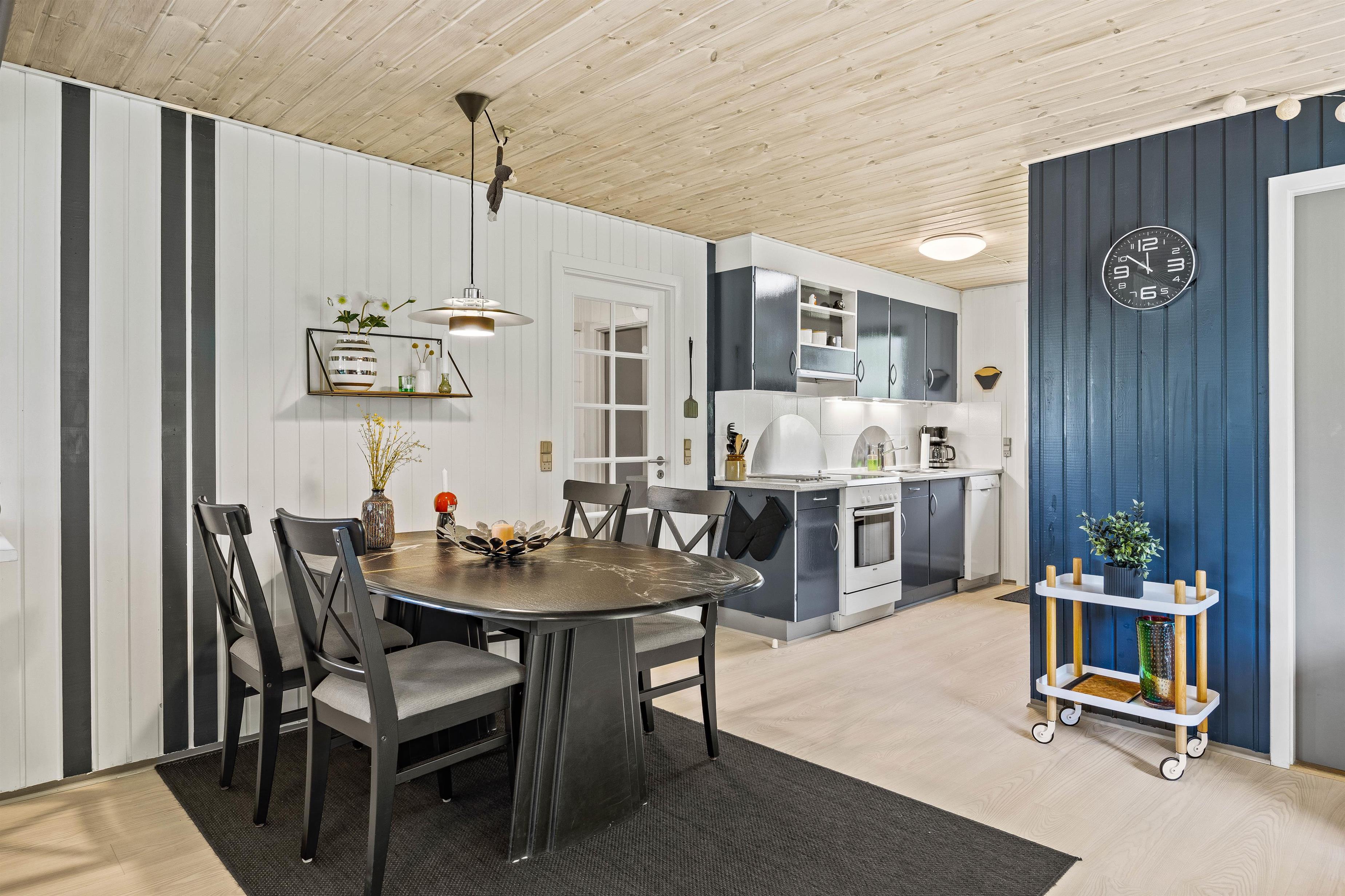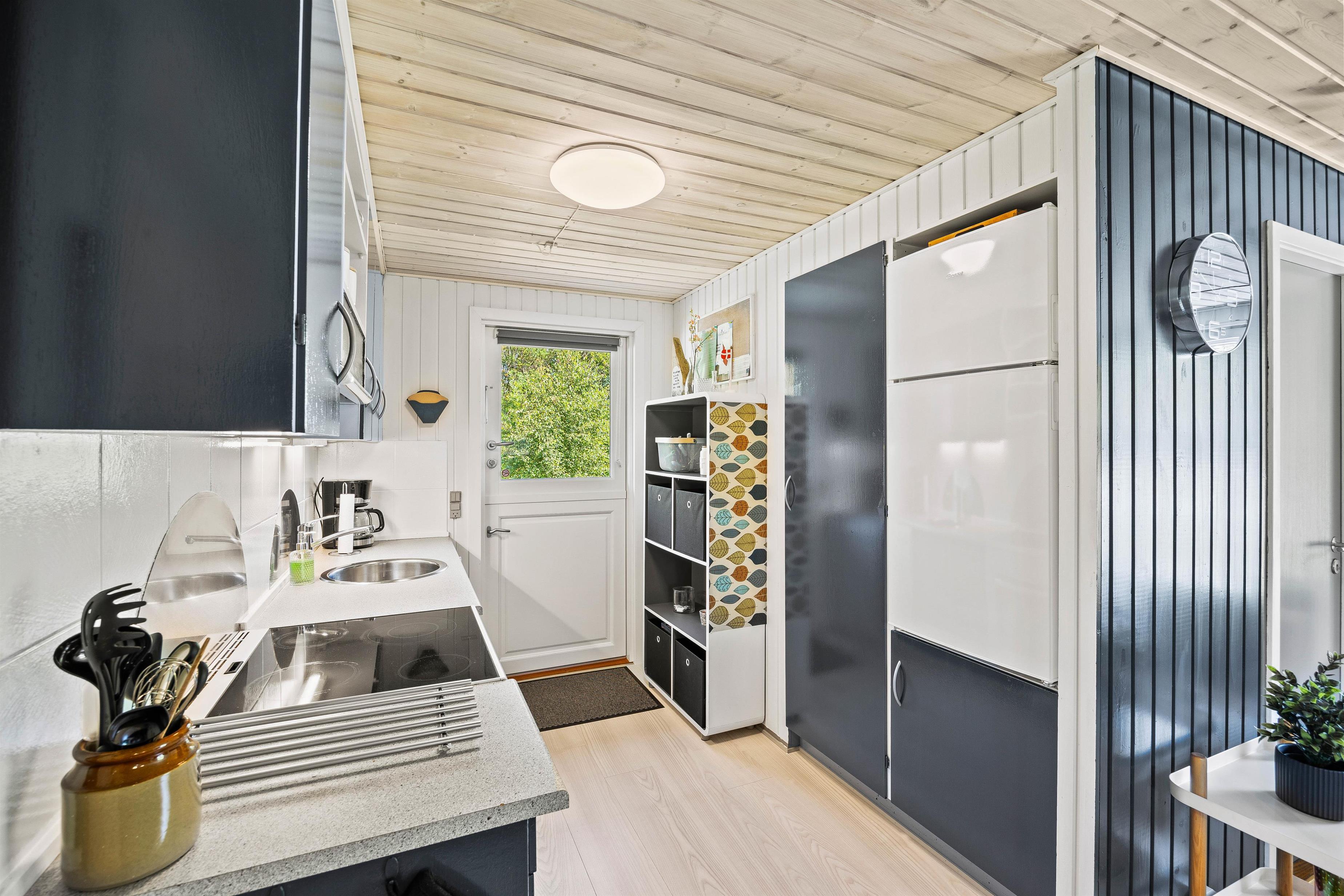Velkommen indenfor på Hedevang. Du vil her blive mødt af et funktionelt køkken i åben forbindelse til stuen. I køkkenet er der installeret en opvaskemaskine, så I som familie kan lade maskinen arbejde, og selv komme ned i gear og ikke tænke over opvasken. I vil i huset med det samme kunne mærke sommerhusstemningen, med de lyse vægge og den skandinaviske stil. Lænestolene står klar foran brændeovnen og tv’et, til I kommer hjem fra en dejlig gåtur i det fantastiske område, som I finder i Houstrup.