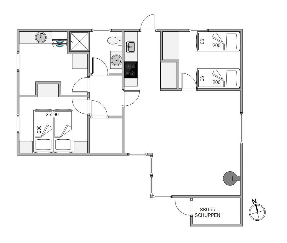 Feriehuset er opført med 2 soverum med god skabsplads, og et flot renoveret badeværelse med gulvvarme. I vil også nyde godt af den store dejlige bryggers med gulvvarme, hvor der også er installeret en vaskesøjle.