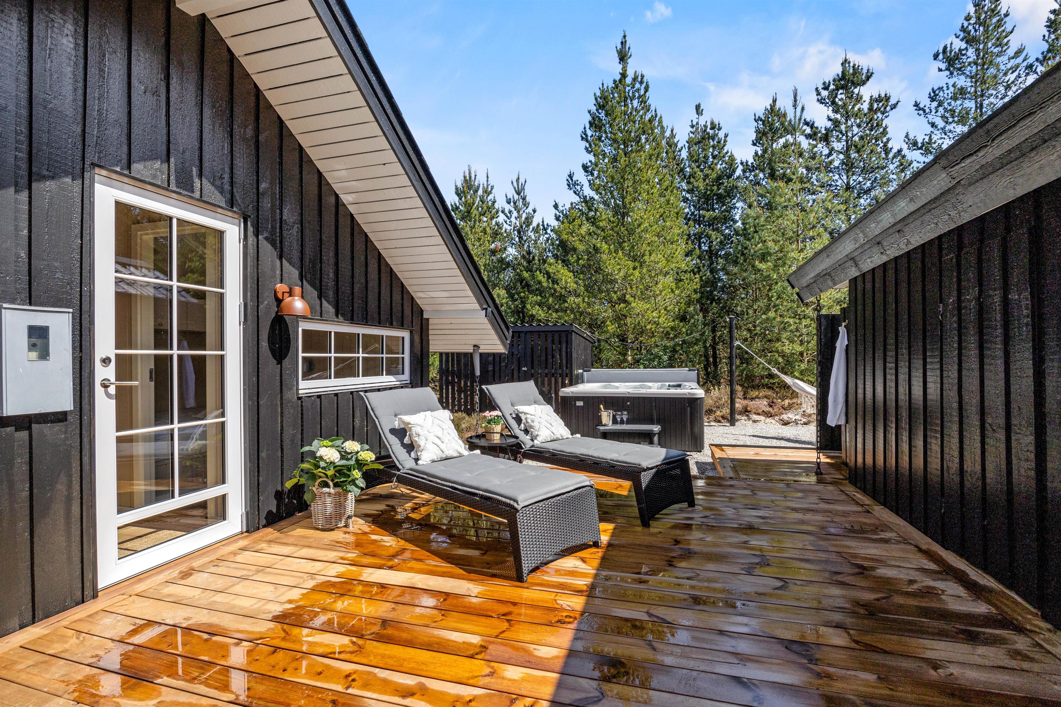 Huset byder desuden på både en åben og en overdækket terrasse, så I kan vælge mellem solbadning under åben himmel eller et skyggefuldt pusterum, mens samtidig nyde de omkringliggende naturskønne omgivelser. Terrassen skaber en uforstyrret oase, hvor I kan samles til måltider eller blot slappe af og nyde stilheden.