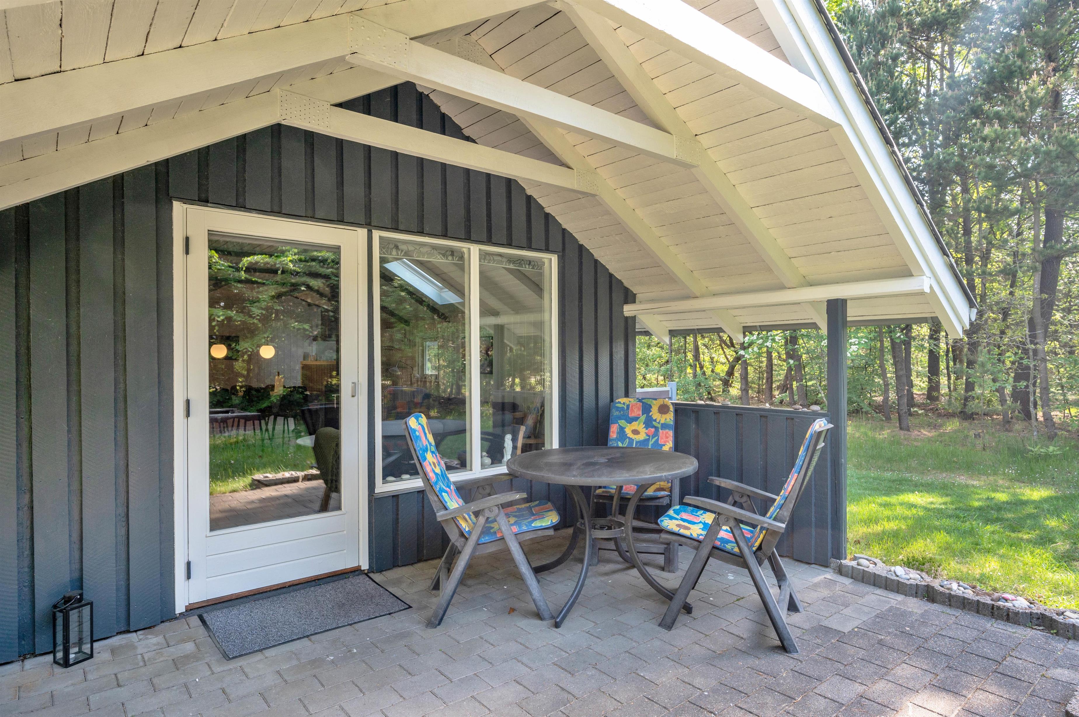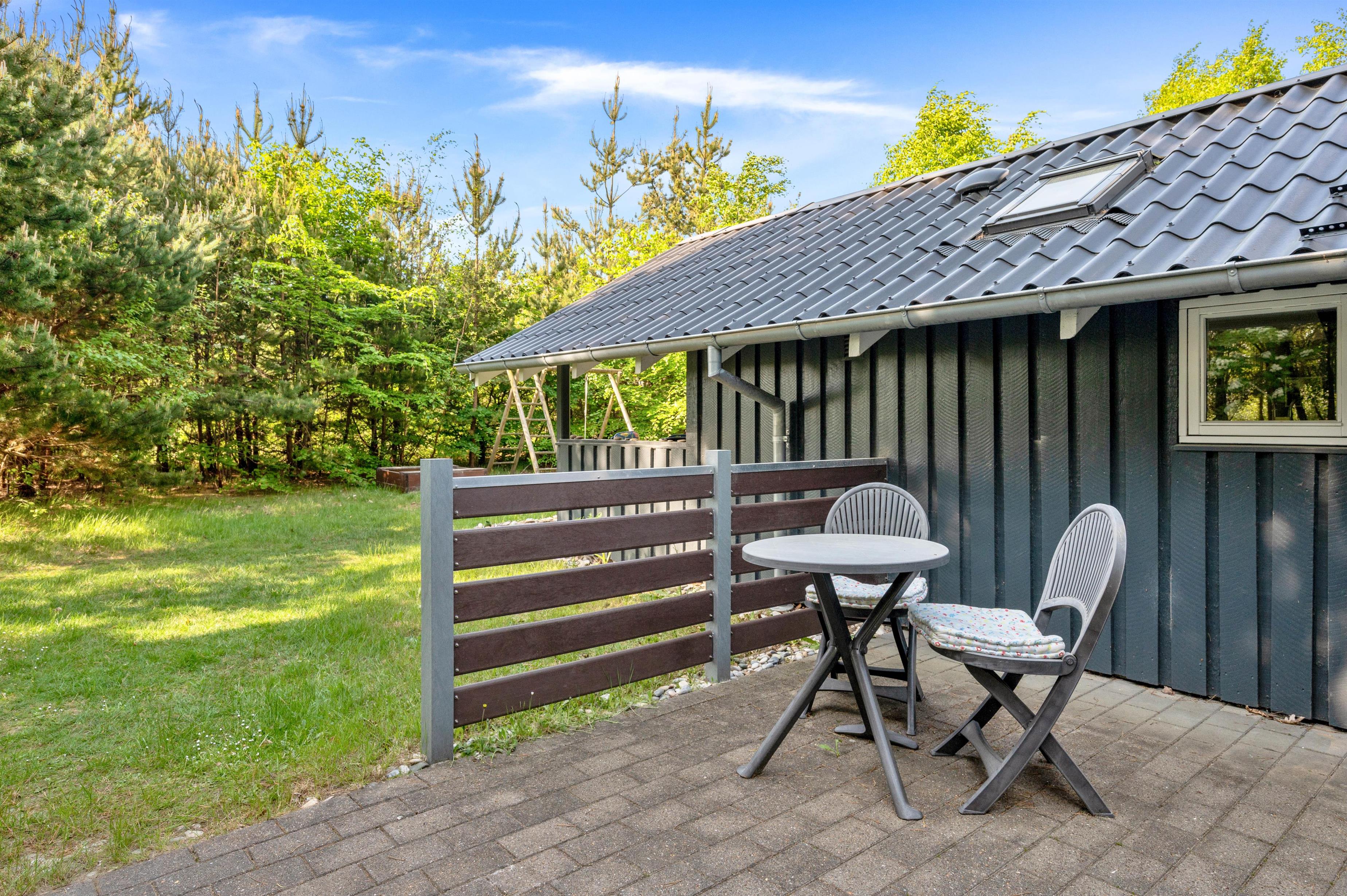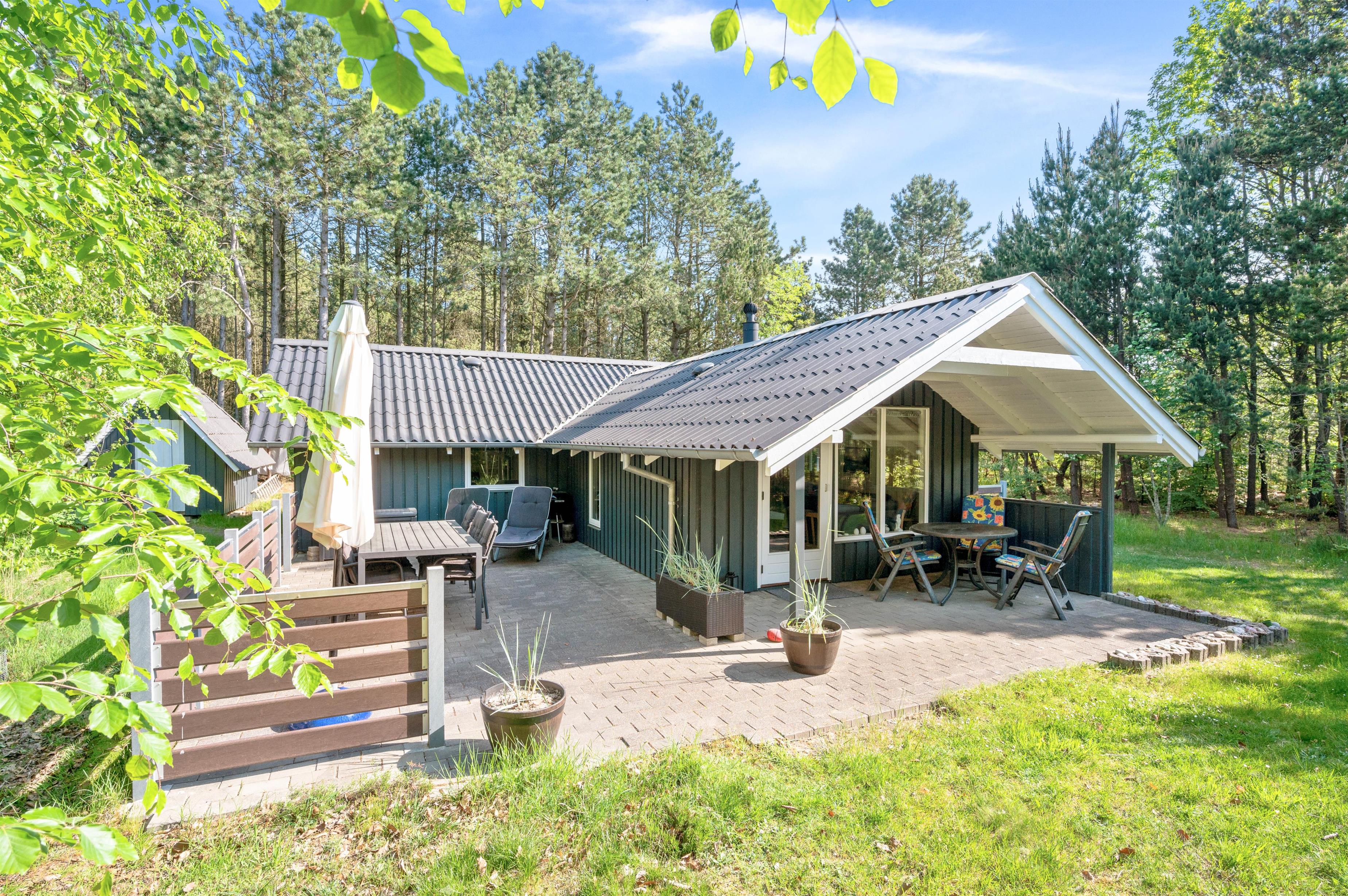 Her kan I helt uforstyrret tilbringe jeres ferie. Sommerhuset har en dejlig og fredelig beliggenhed, og her kan I nyde stilheden og det gode vejr fra den overdækkede terrasse. På de varme sommerdage står liggestolene klar, så der kan slappes af i det gode vejr, og som en god afslutning på dagen kan I tænde op i grillen og tilberede en ægte feriemiddag under åben himmel.