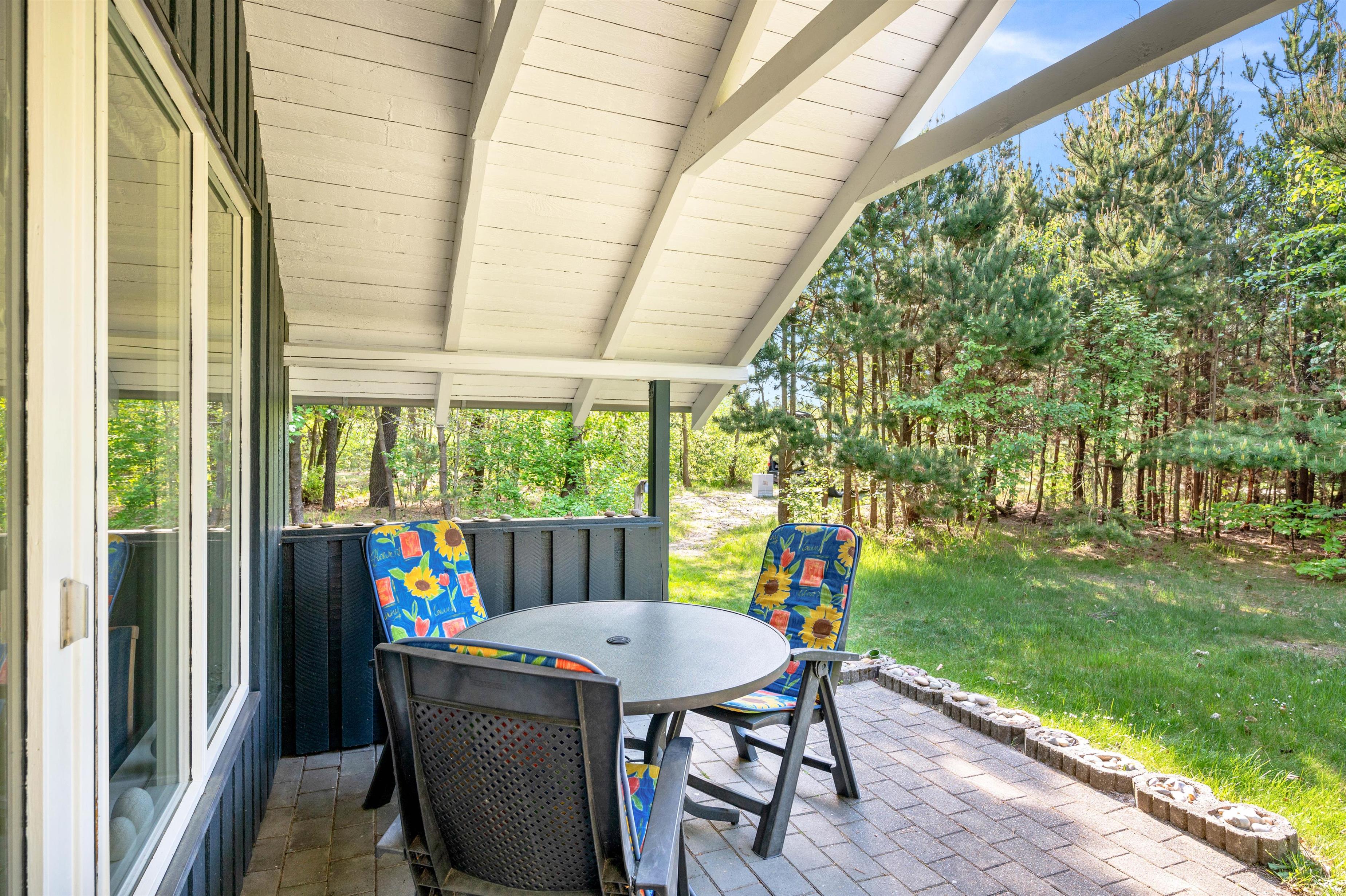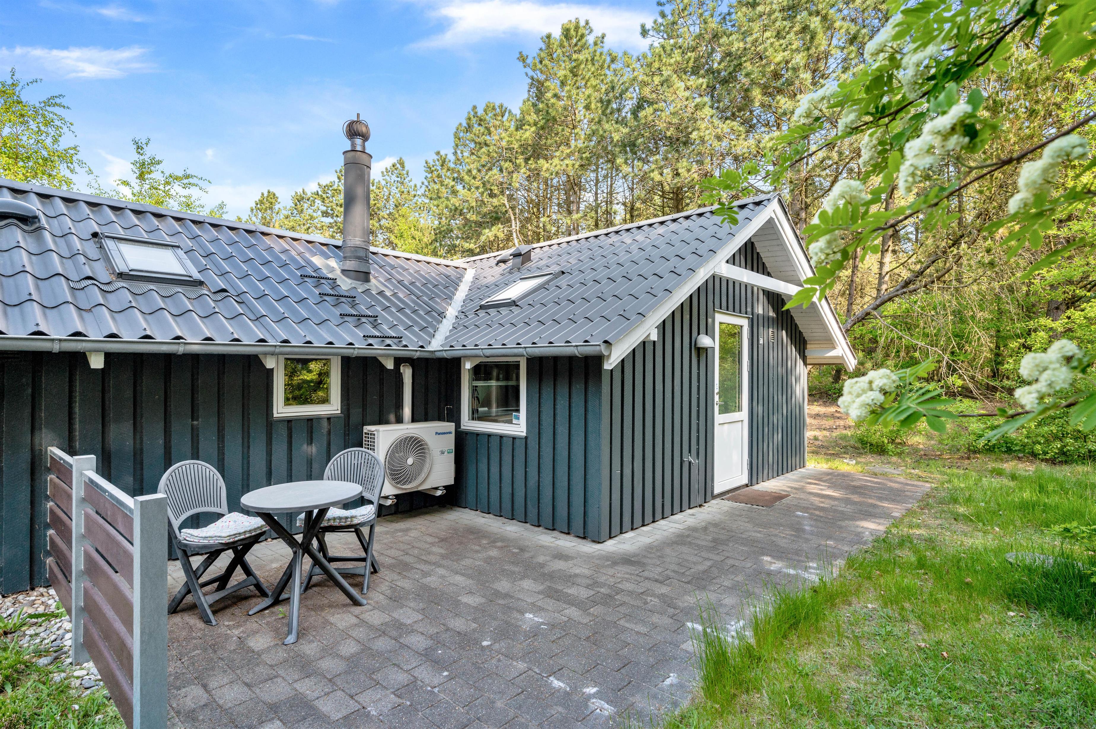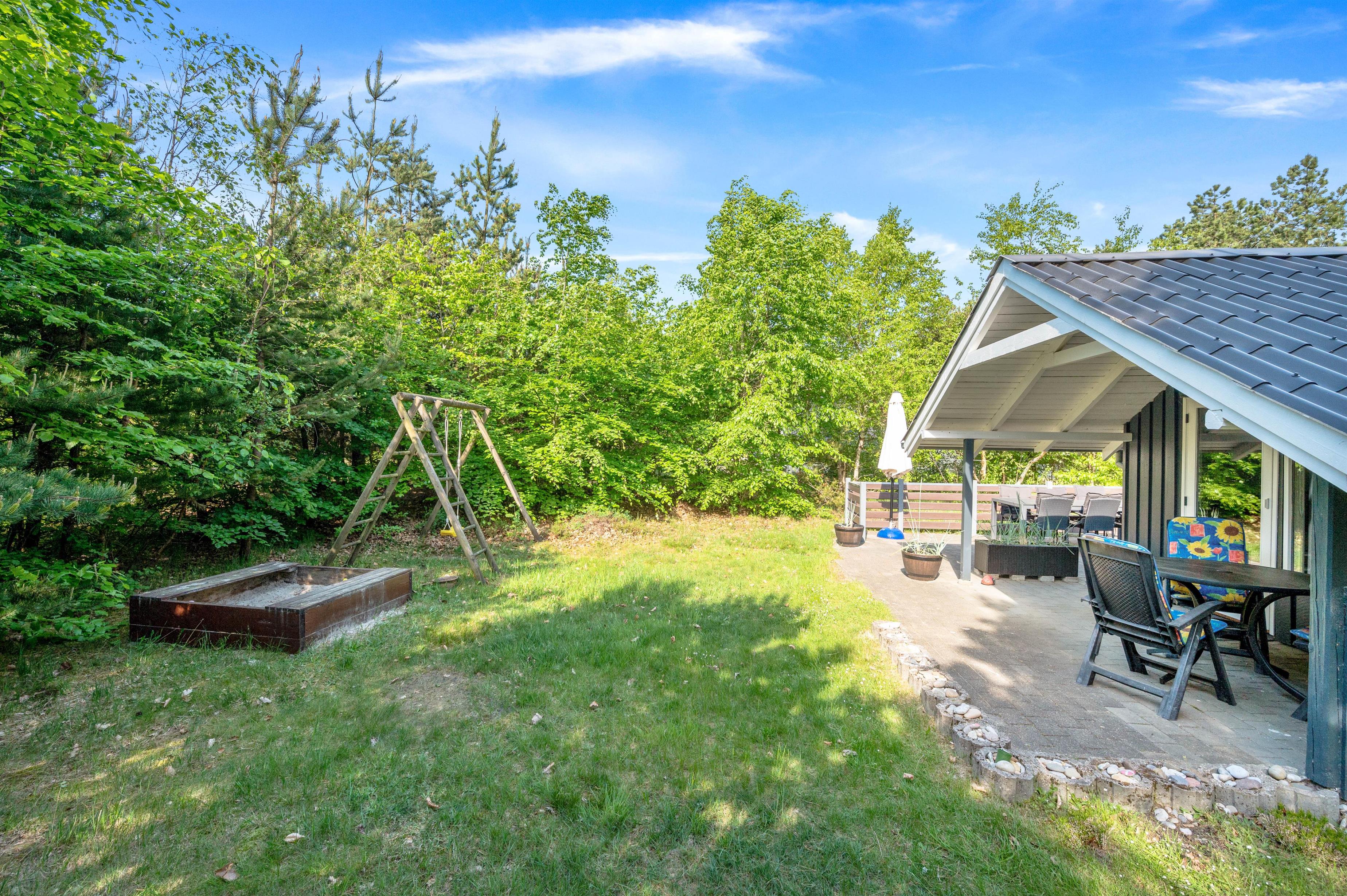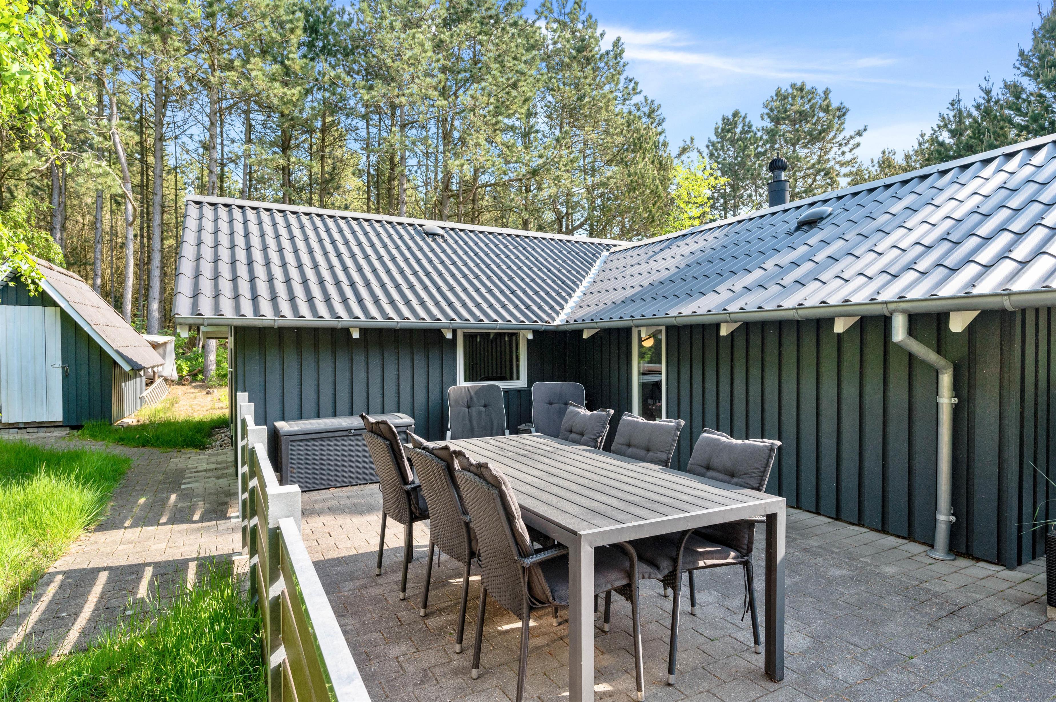 Her kan I helt uforstyrret tilbringe jeres ferie. Sommerhuset har en dejlig og fredelig beliggenhed, og her kan I nyde stilheden og det gode vejr fra den overdækkede terrasse. På de varme sommerdage står liggestolene klar, så der kan slappes af i det gode vejr, og som en god afslutning på dagen kan I tænde op i grillen og tilberede en ægte feriemiddag under åben himmel.