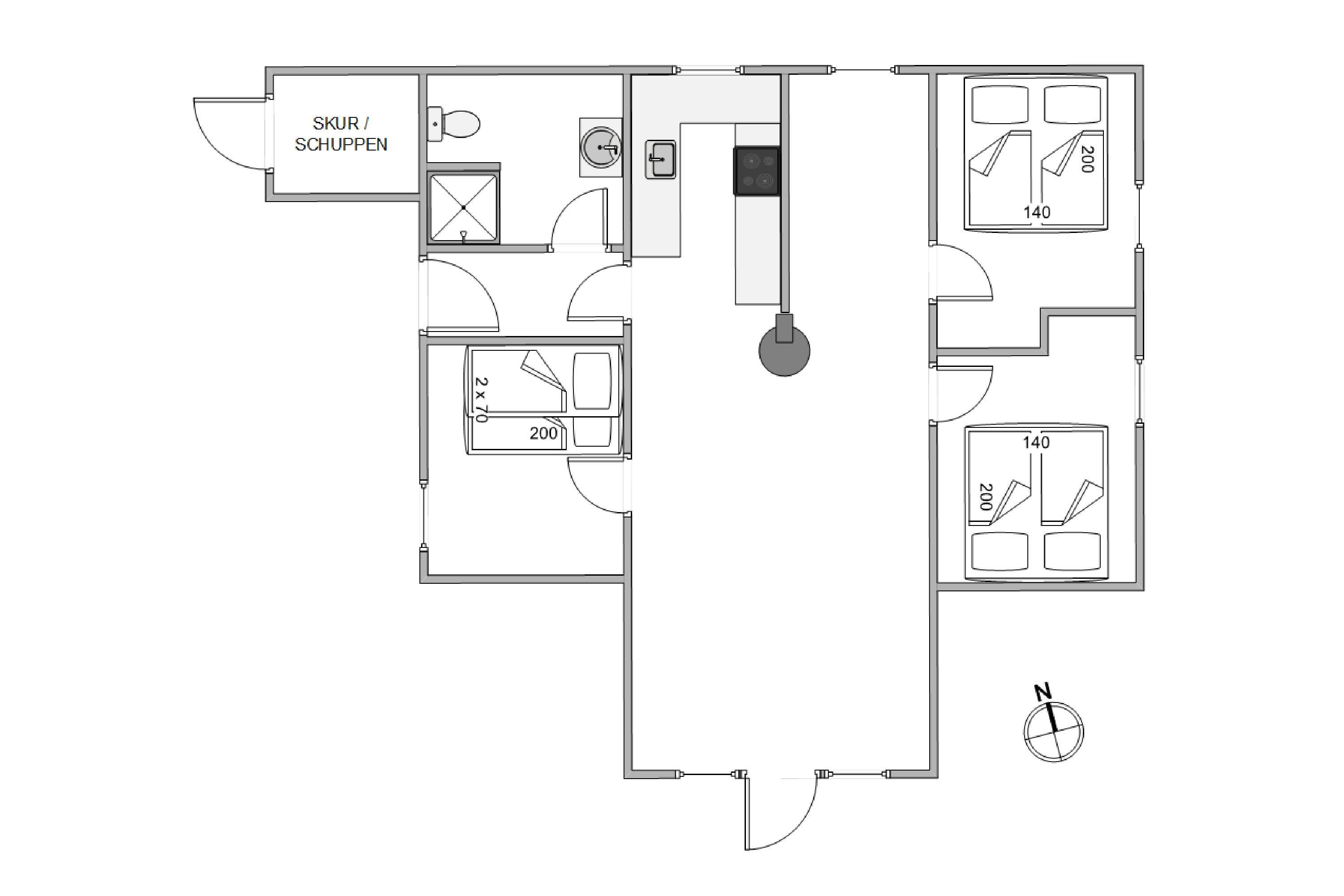 Sommerhusets hjerterum er alrummet, hvor stue, spiseplads og køkken er samlet i ét. Her kan I tænde op i brændeovnen, der sætter prikken over i’et til feriestemningen. Vinduespartiet mod terrassen skaber et godt lysindfald og bidrager til god atmosfære i rummet. Her er også en energibesparende varmepumpe, som I kan bruge til at holde et behageligt indeklima.