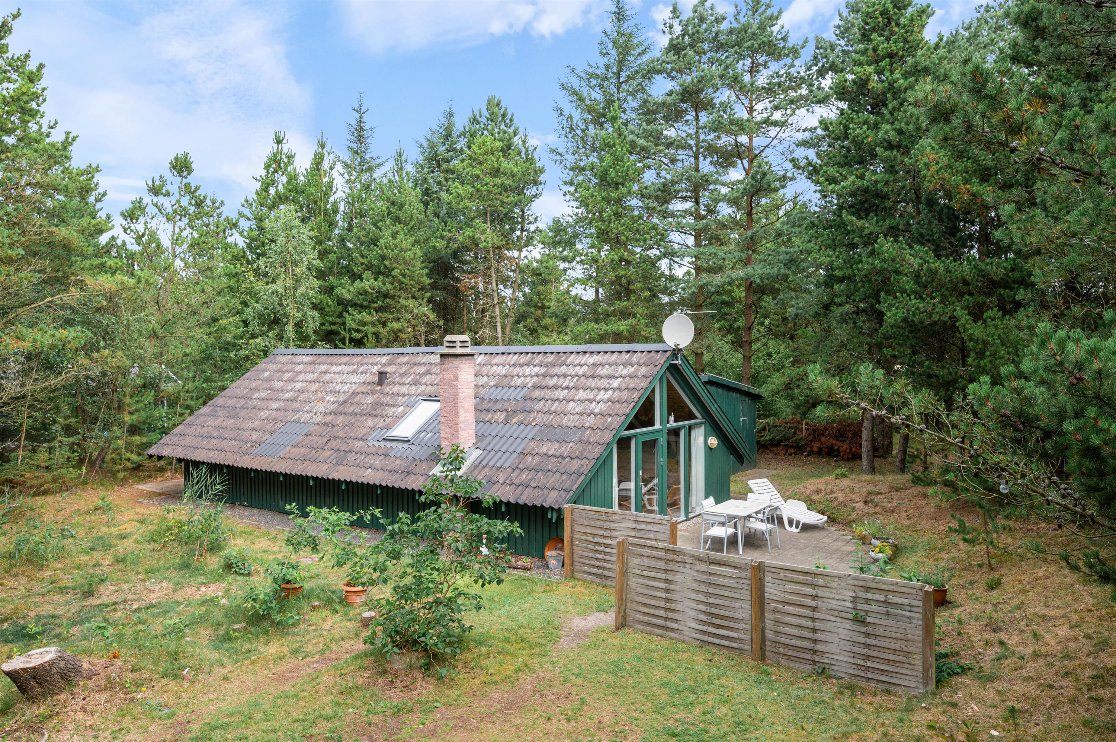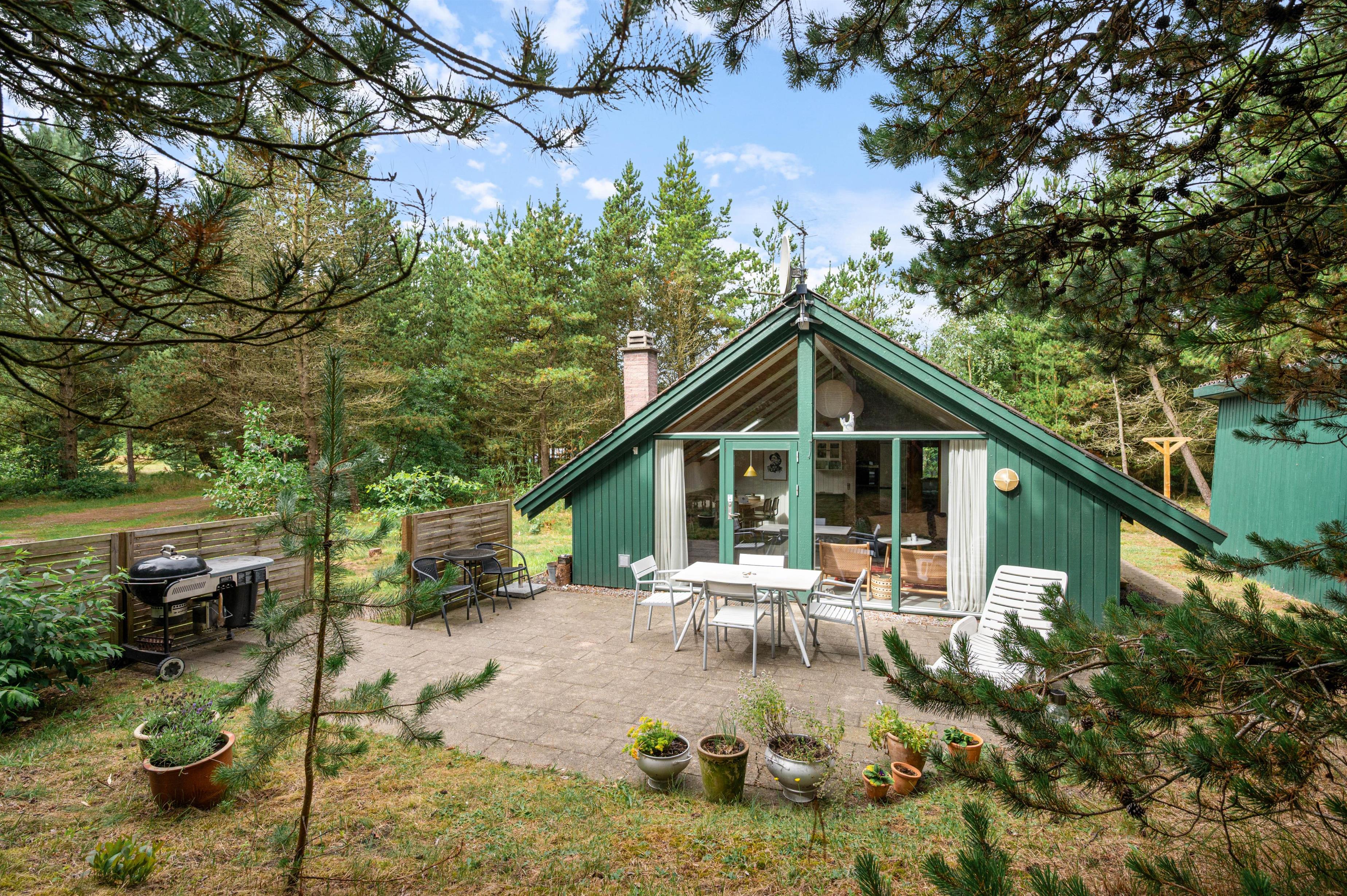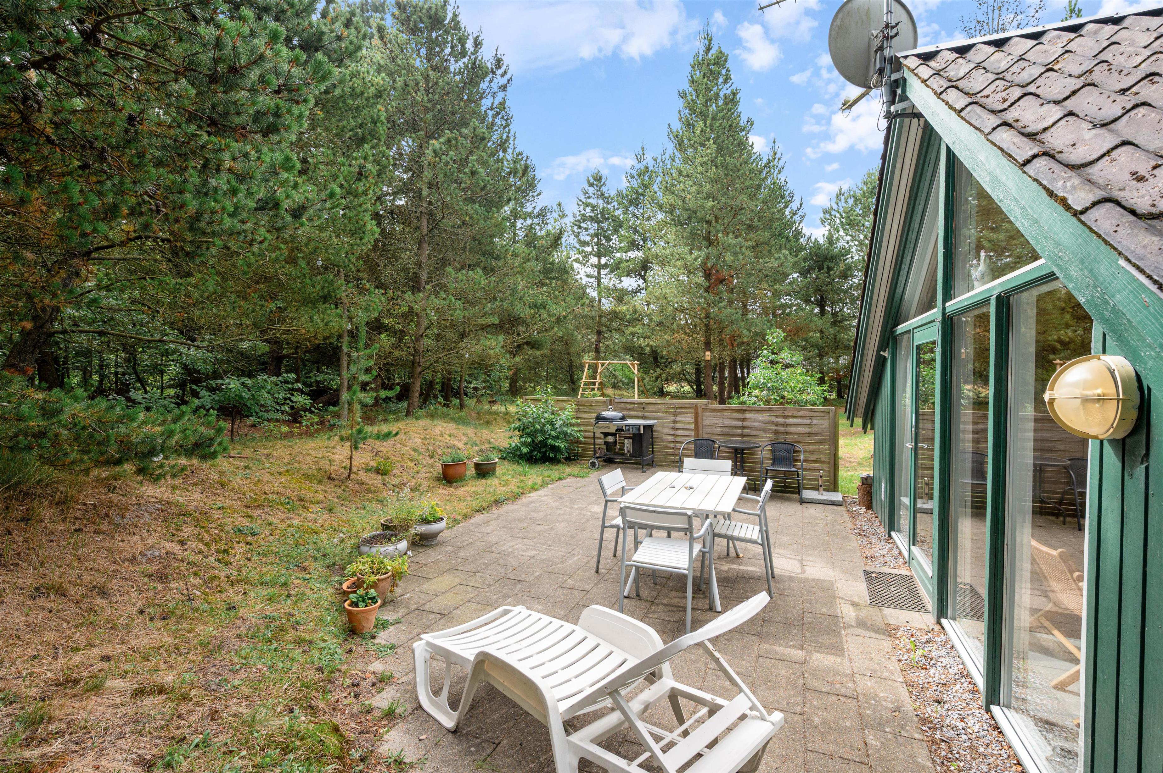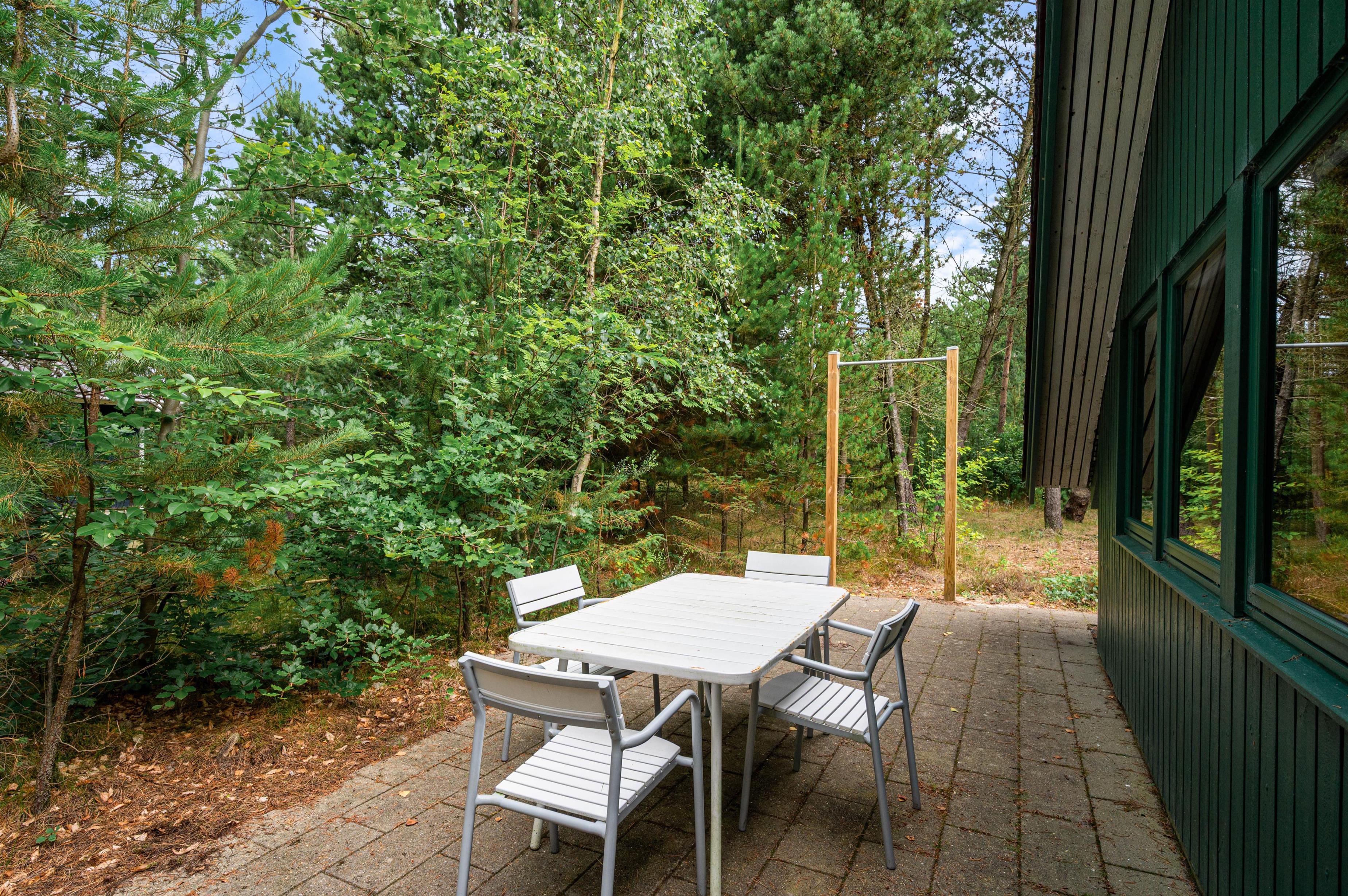 Sommerhuset på Kirkeflod 96 er helt omgivet af træer, hvilket giver masser af læ og privatliv til familiehygge på terrassen.