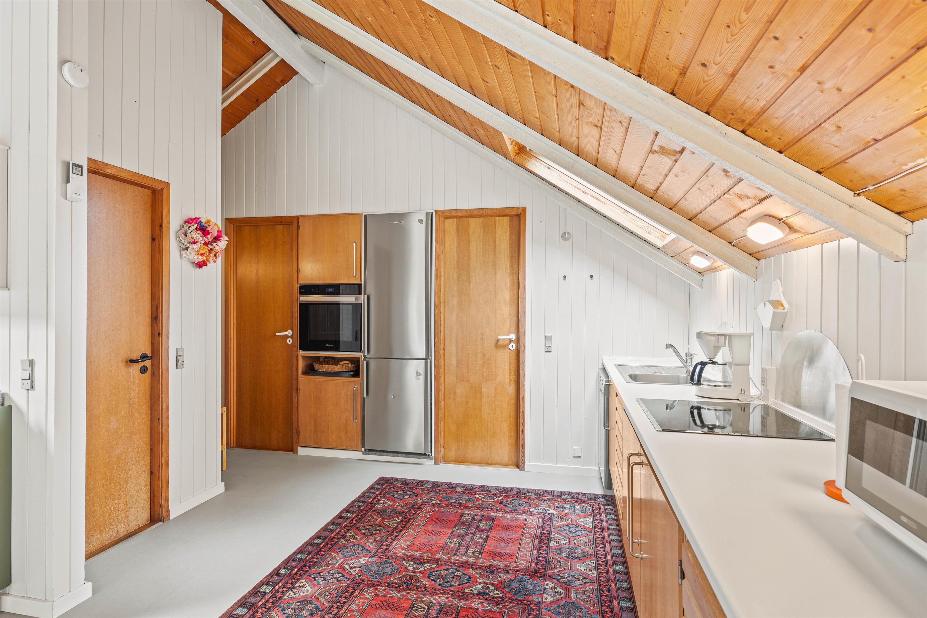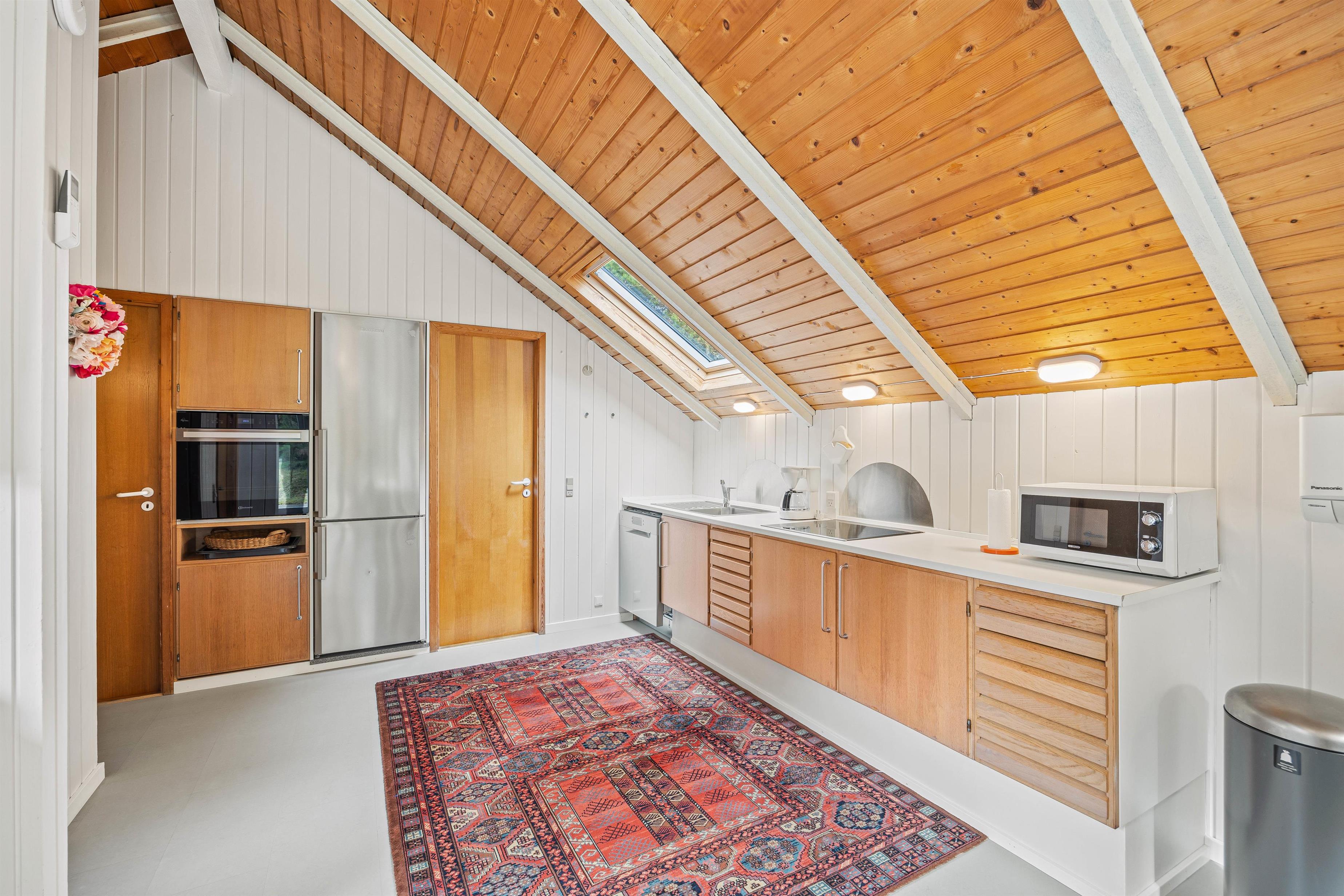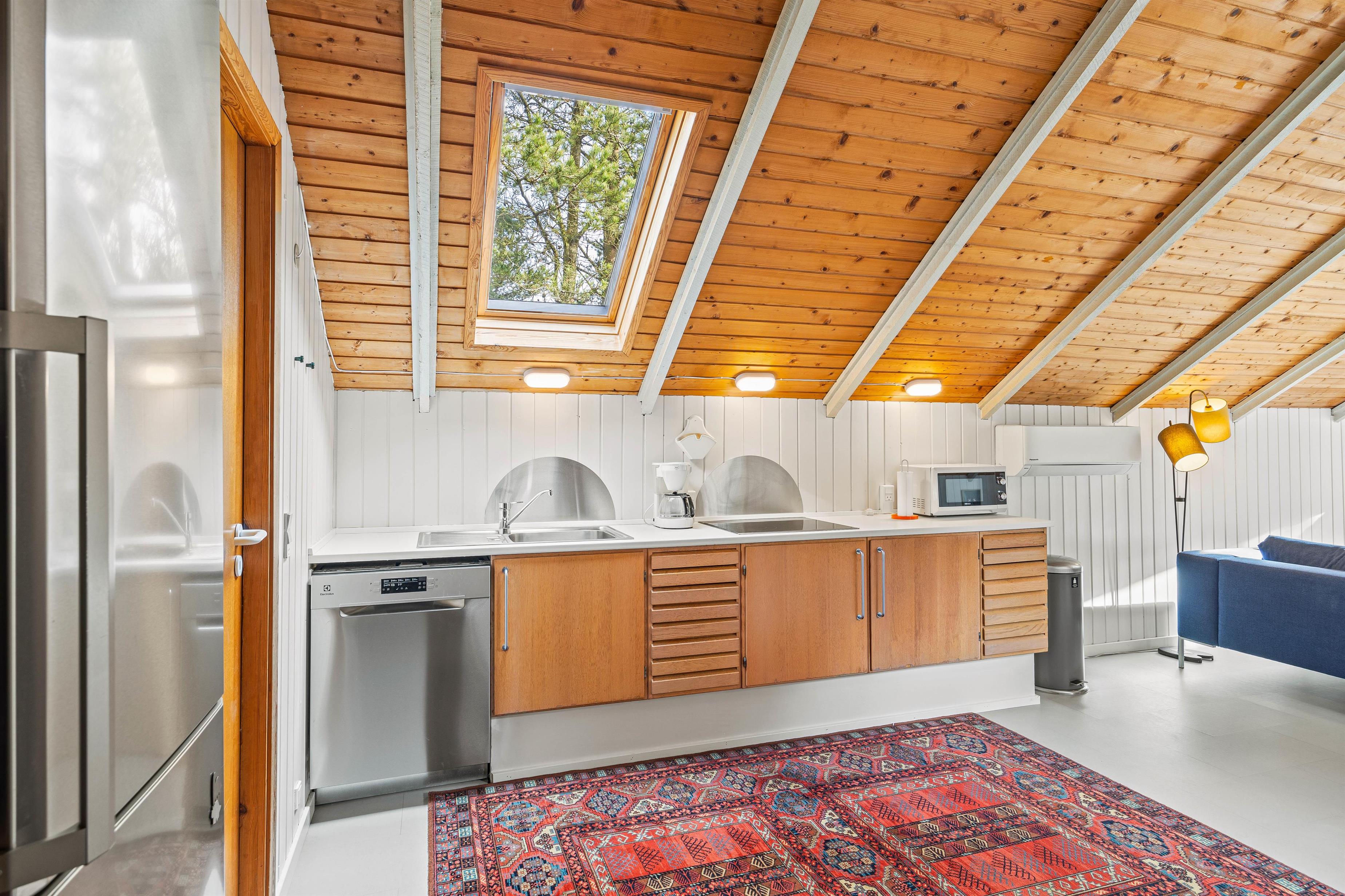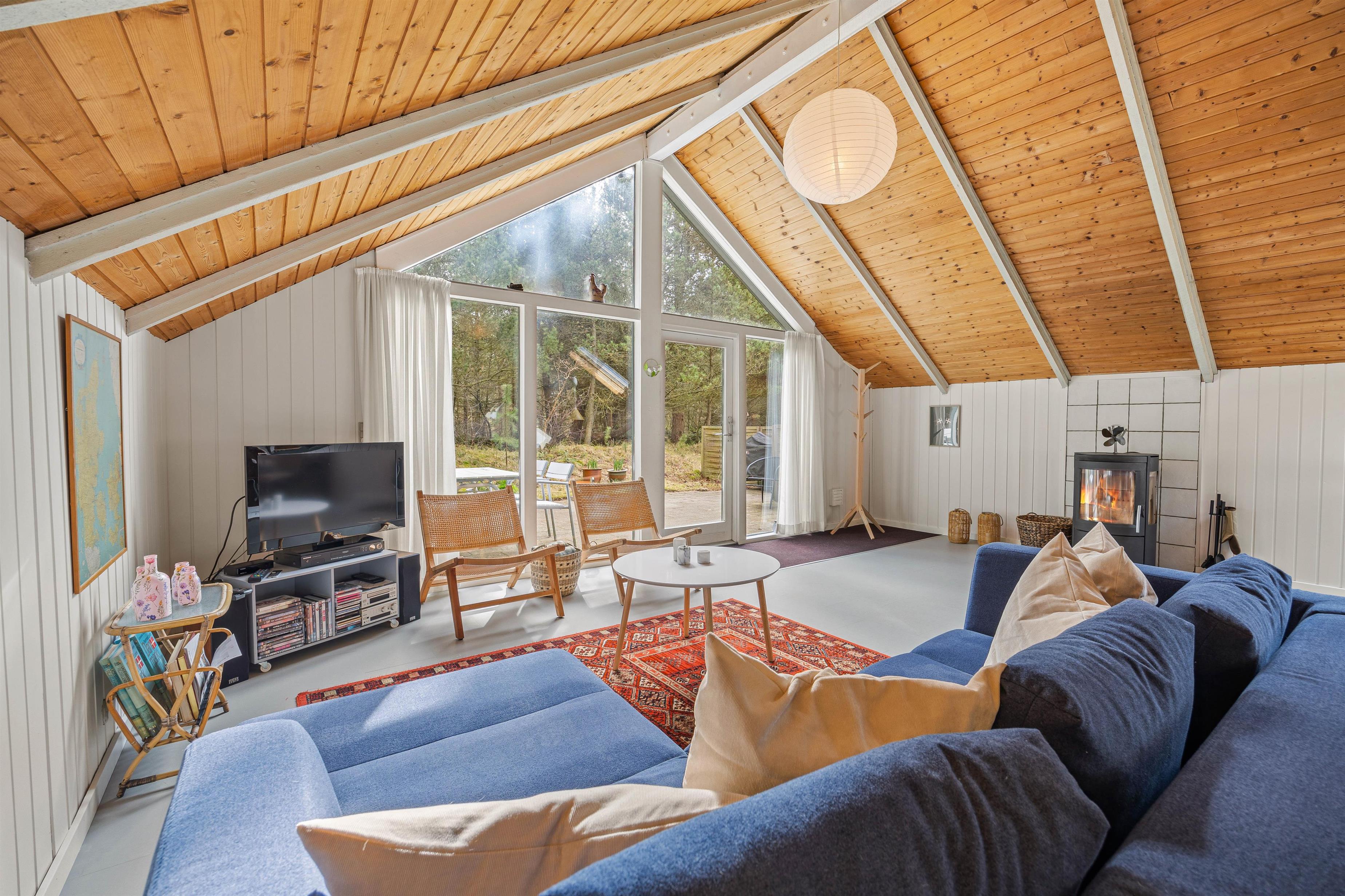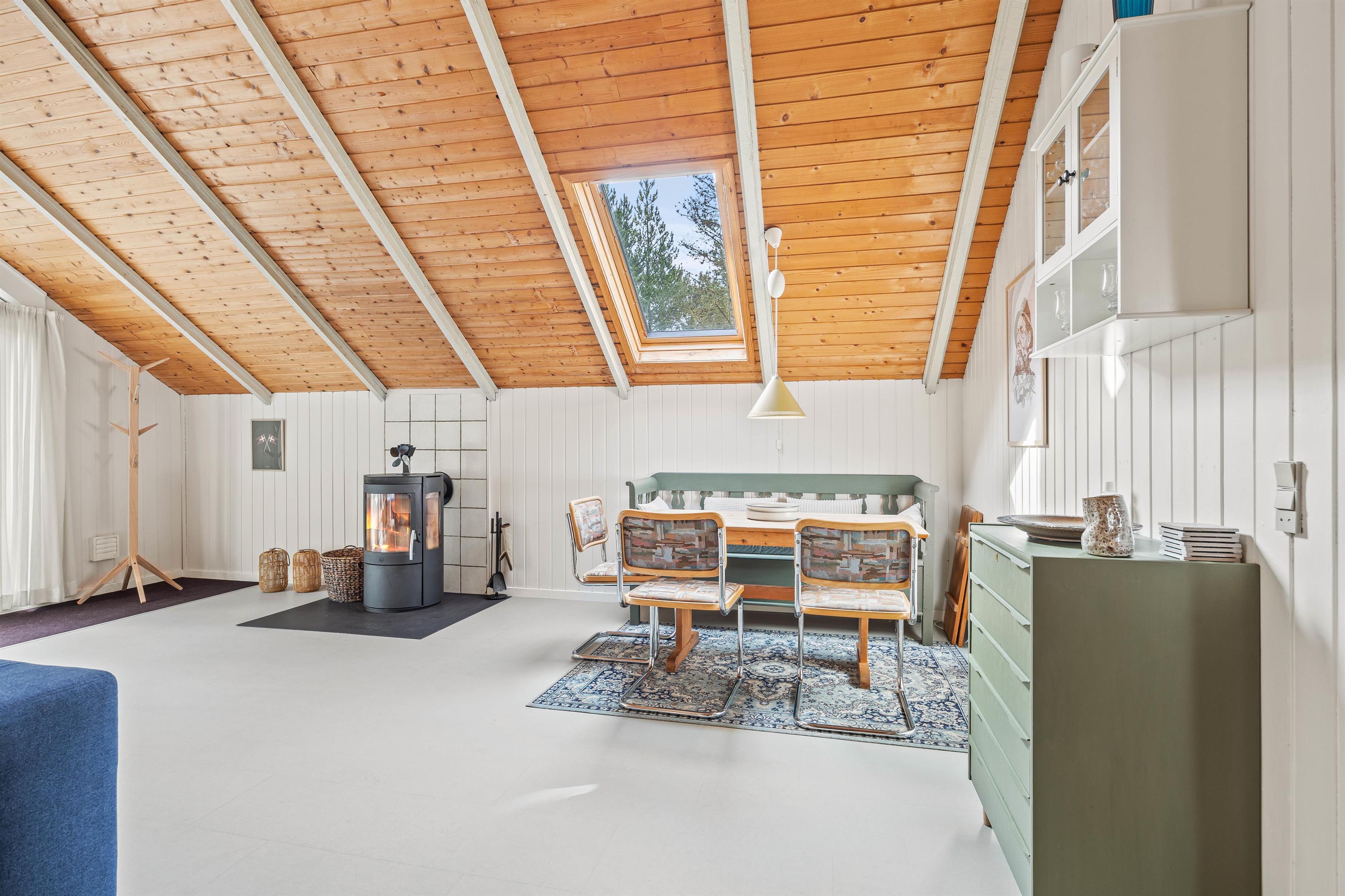 Det store opholdsrum er sommerhusets centrum – her er plads til alle. Køkkenafdelingen indeholder alt, hvad I har brug for, bl.a. opvaskemaskine og mikroovn – og herfra kan I nemt være med i fællesskabet i opholdsrummet. Sofagruppen indbyder til hyggelige stunder med familiespil og brændeovns-hygge.