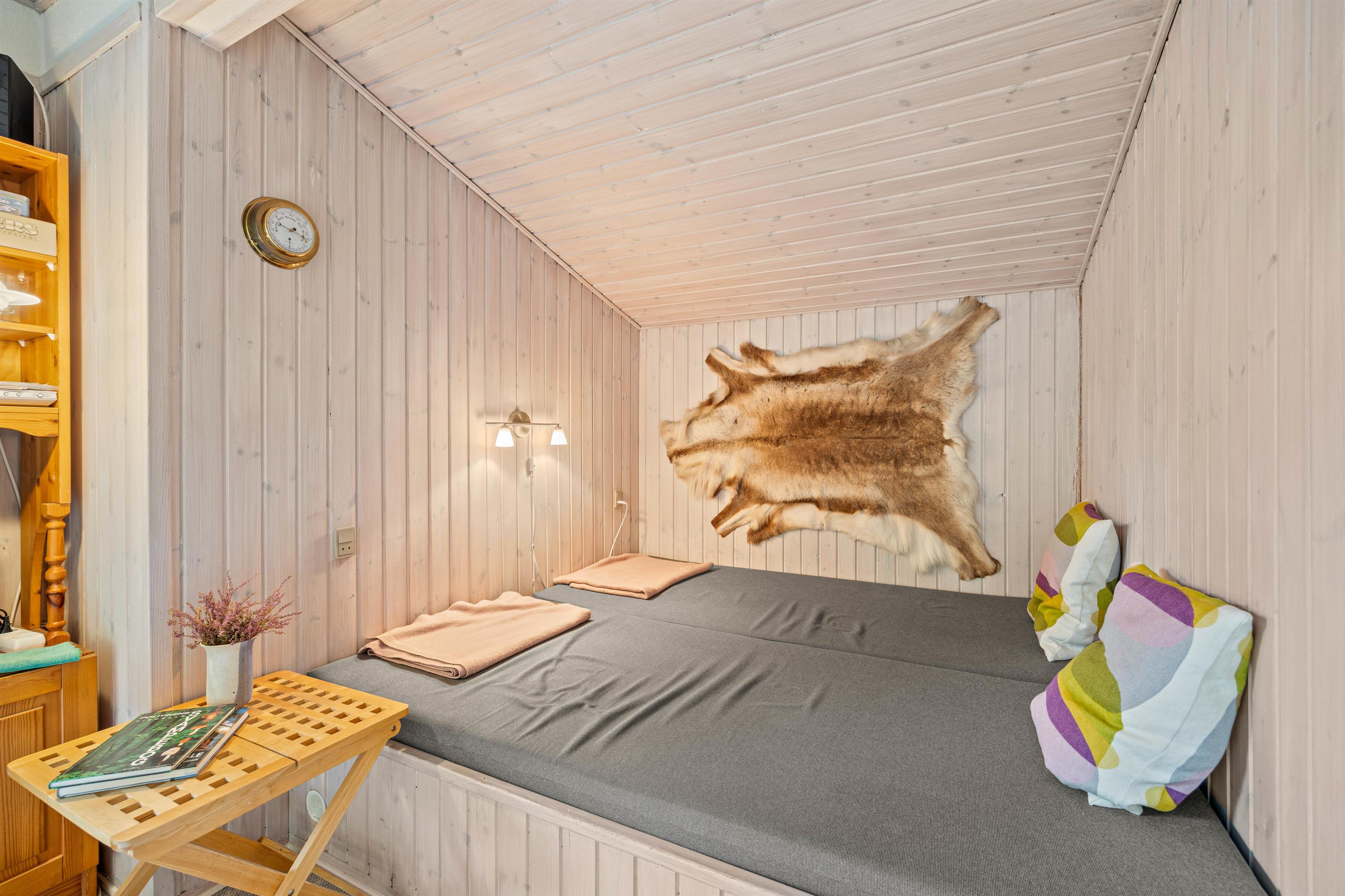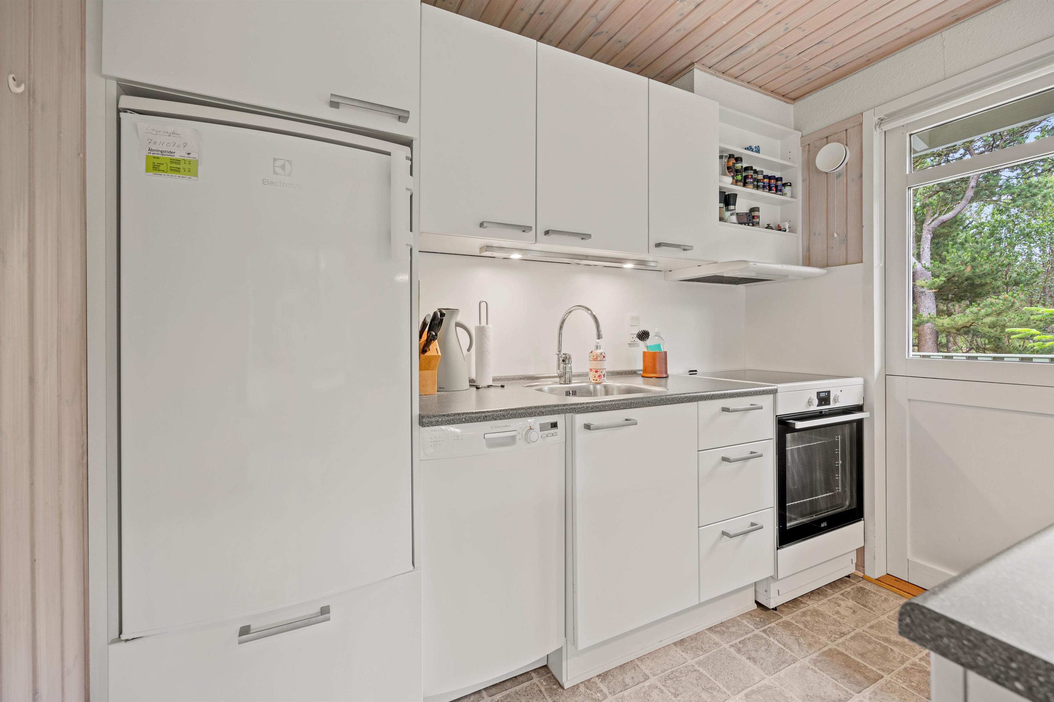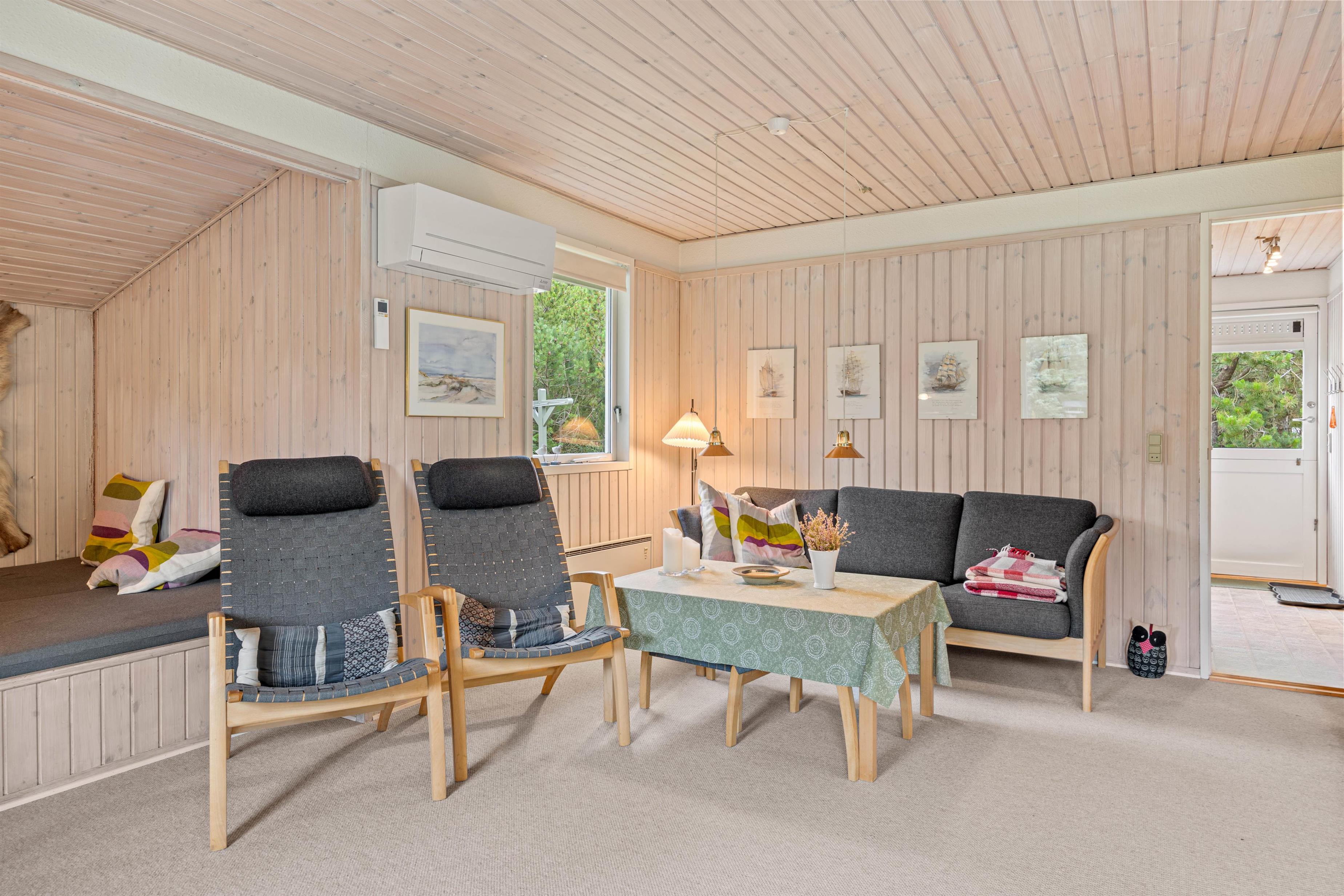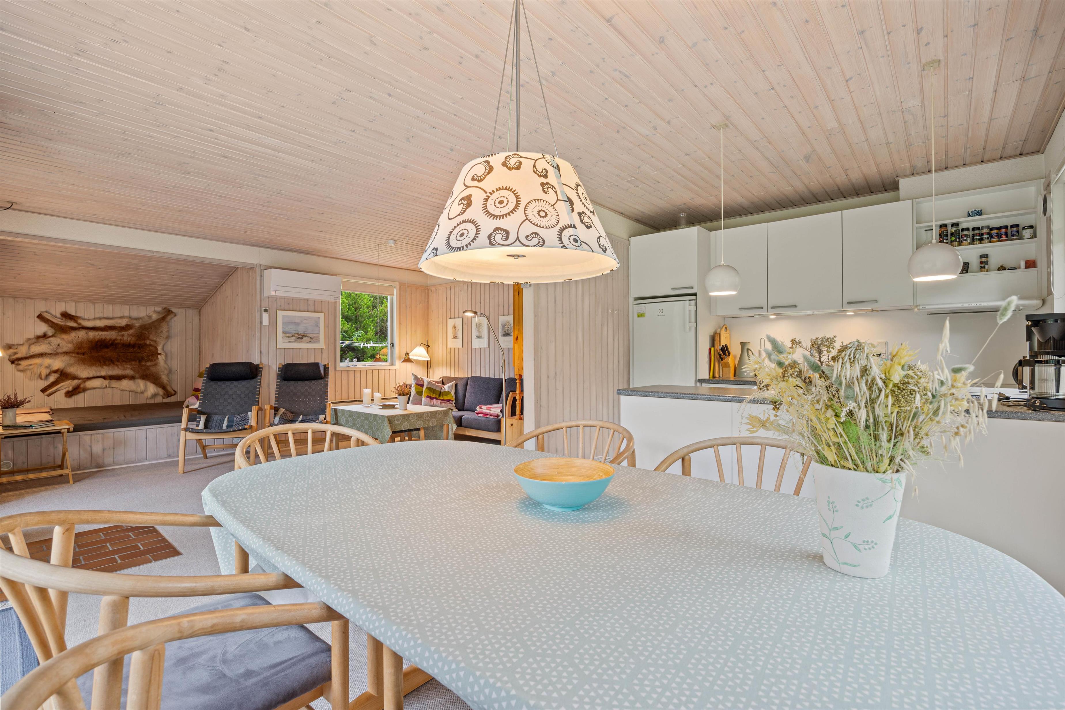 Den hjemlige indretning gør, at I hurtigt vil falde til på den nye ferieadresse, og også indenfor er der sørget for hyggen. Den åbne køkken- og spisestueafdeling er både udstyret med brændeovn og en lille alkove, som også fungerer som seng, hvor der kan slappes af, og børnene kan lege.