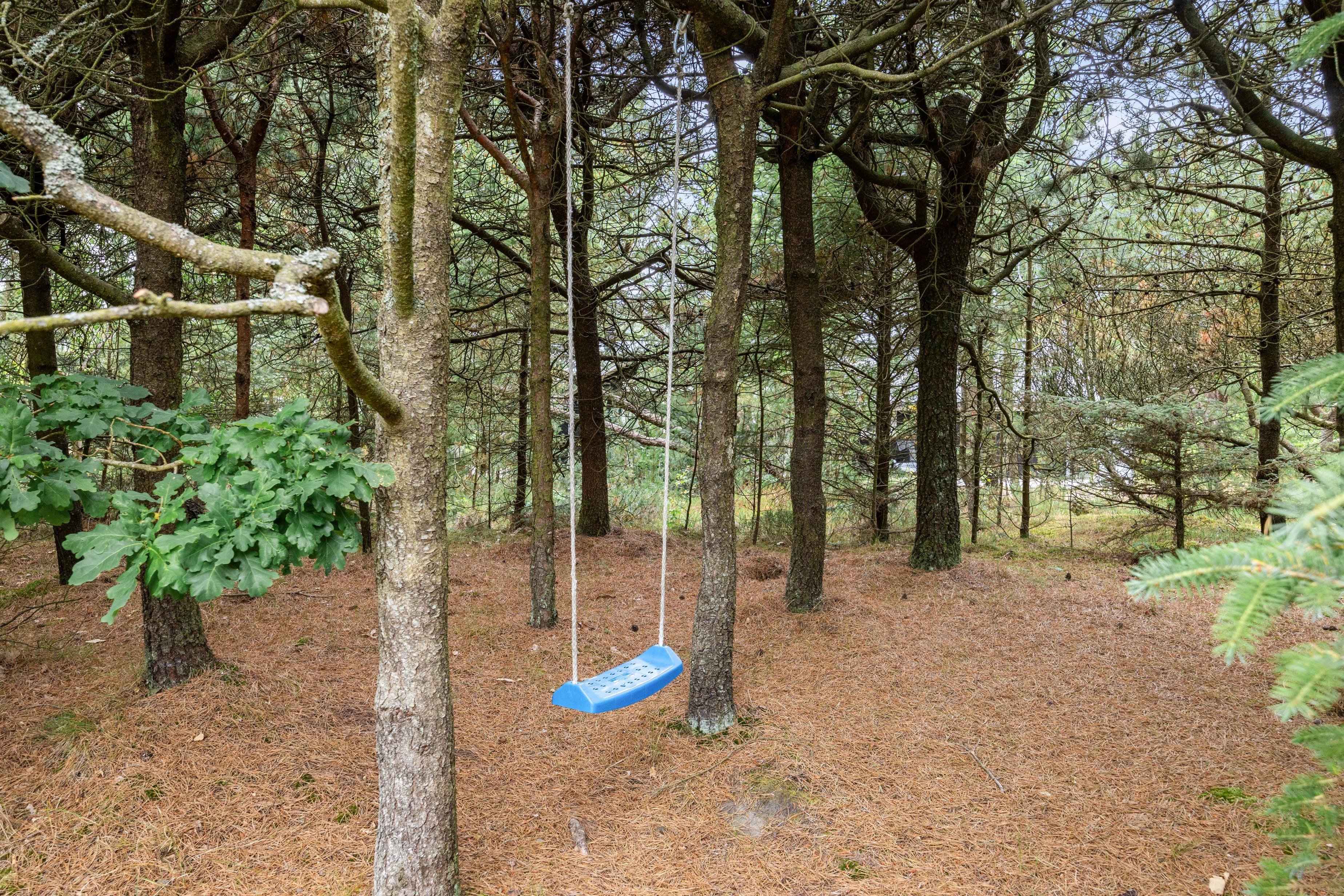 Gå på opdagelse efter de mange små hyggekroge, der findes udenfor - for eksempel står der en bænk mellem træerne, og ud over sandkassen gemmer der sig også en gynge inde i skoven, som børnene kan få glæde af.