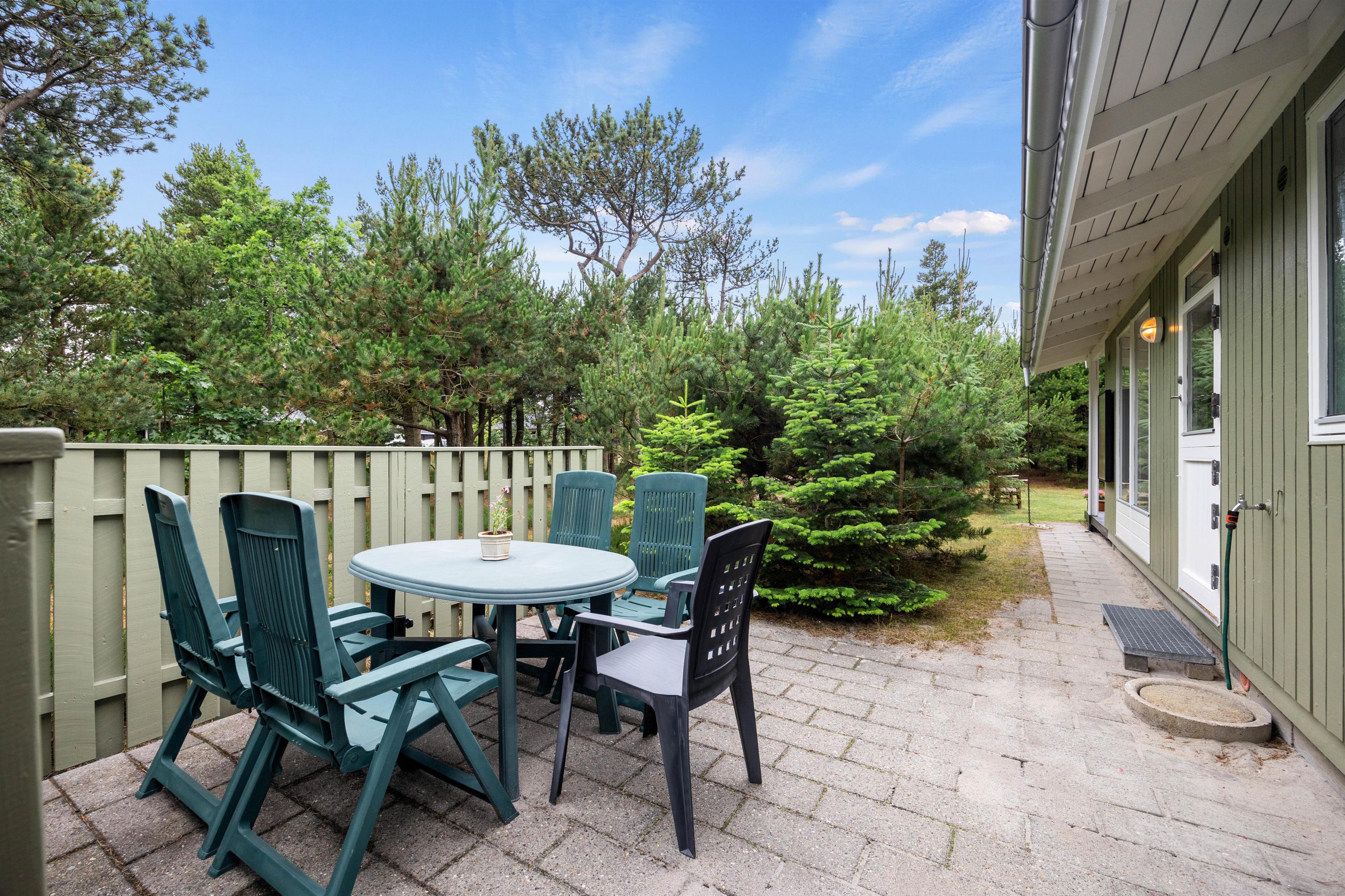 Huset har flere terrasser, hvoraf den store er overdækket, så der er altid mulighed for at sidde i skyggen, og skulle regnen melde sig, kan I hurtigt søge ly under halvtaget. Grillen står også klar, så lige meget vind og vejr kan der spises en rigtig feriemiddag.