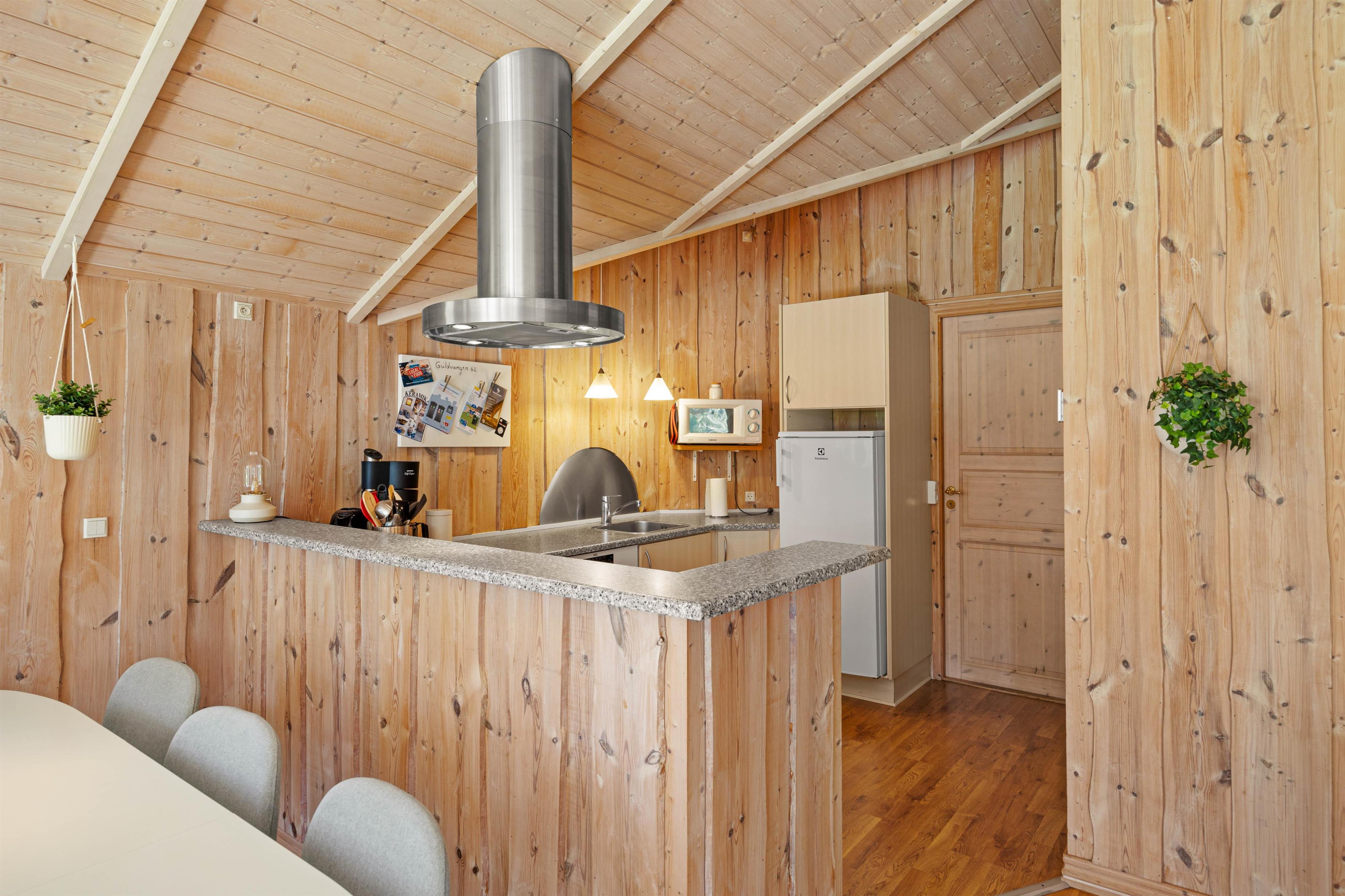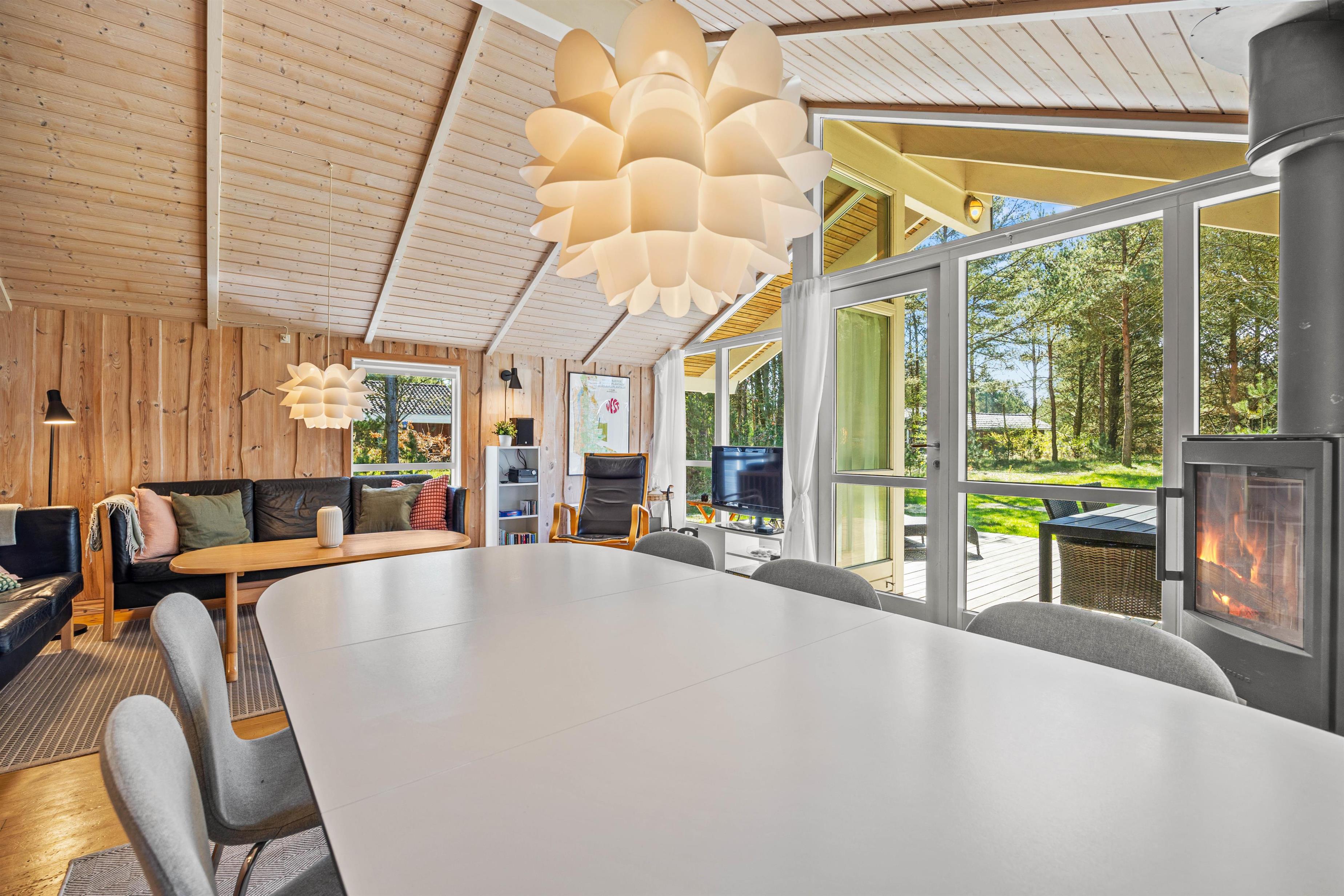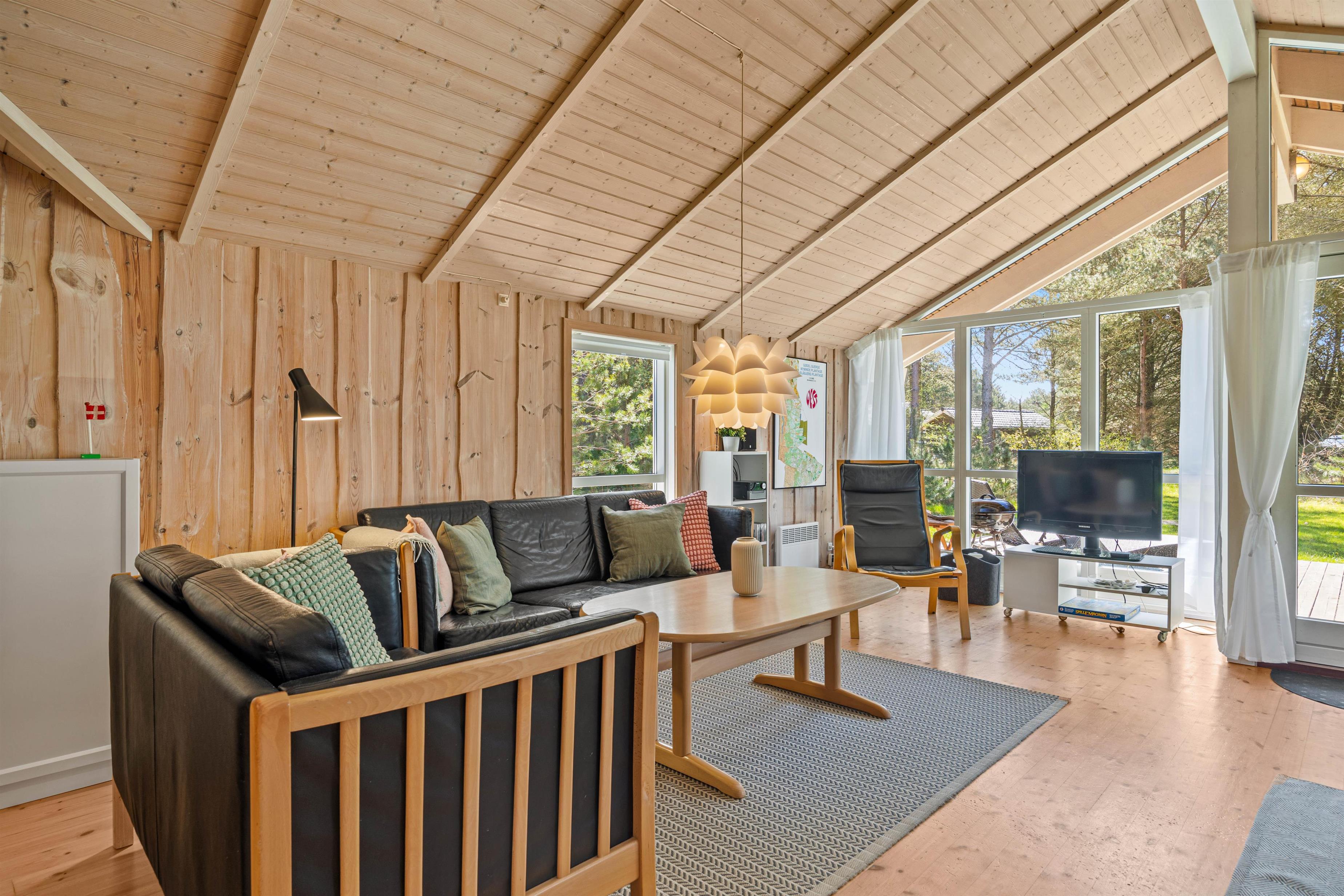 Det store og åbne opholdsrum er en kombination af både stue, spiseafdeling og køkken, og det bliver centrum for samvær og hygge i løbet af ferien. Her finder I også en radio med bluetooth funktion. De mange vinduer sørger for lyse og venlige omgivelser, og sammen med den moderne indretning og det lyse træ giver det en behagelig og venlig atmosfære.