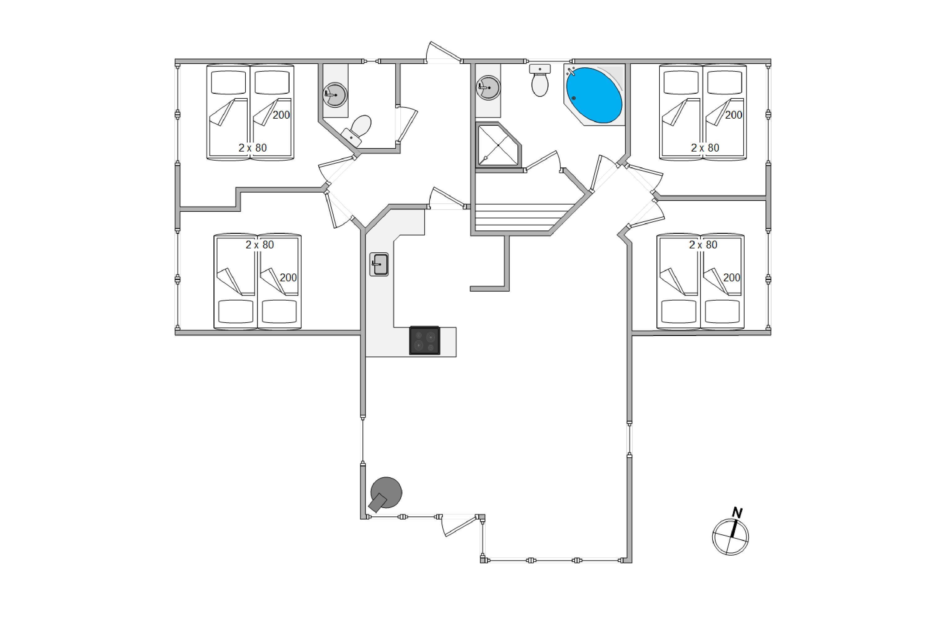 Husets rumopdeling er perfekt til et hold venner eller to familier, der gerne vil holde ferie sammen, med 2 soveværelser med dobbeltsenge i hver sin ende. Huset har et ekstra gæste-wc, så I slipper for toiletkø om morgenen. Det store badeværelse fungerer med gulvvarme, spa og sauna som en lille wellnessoase, så ferien kan nydes i fulde drag med et ekstra strejf af luksus.