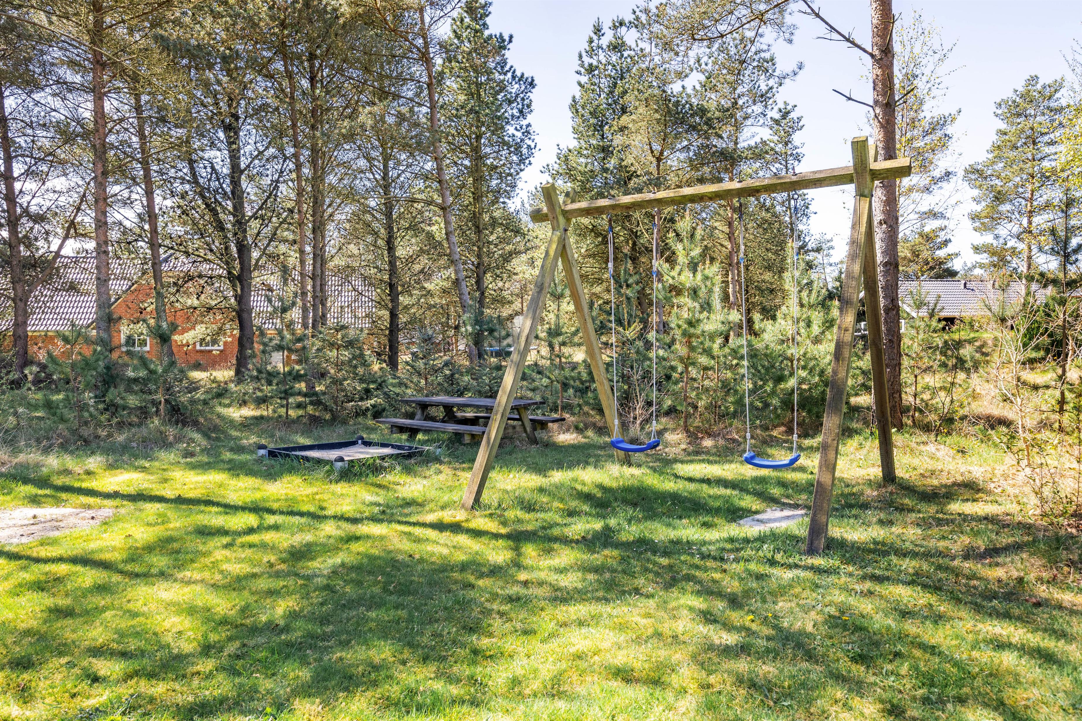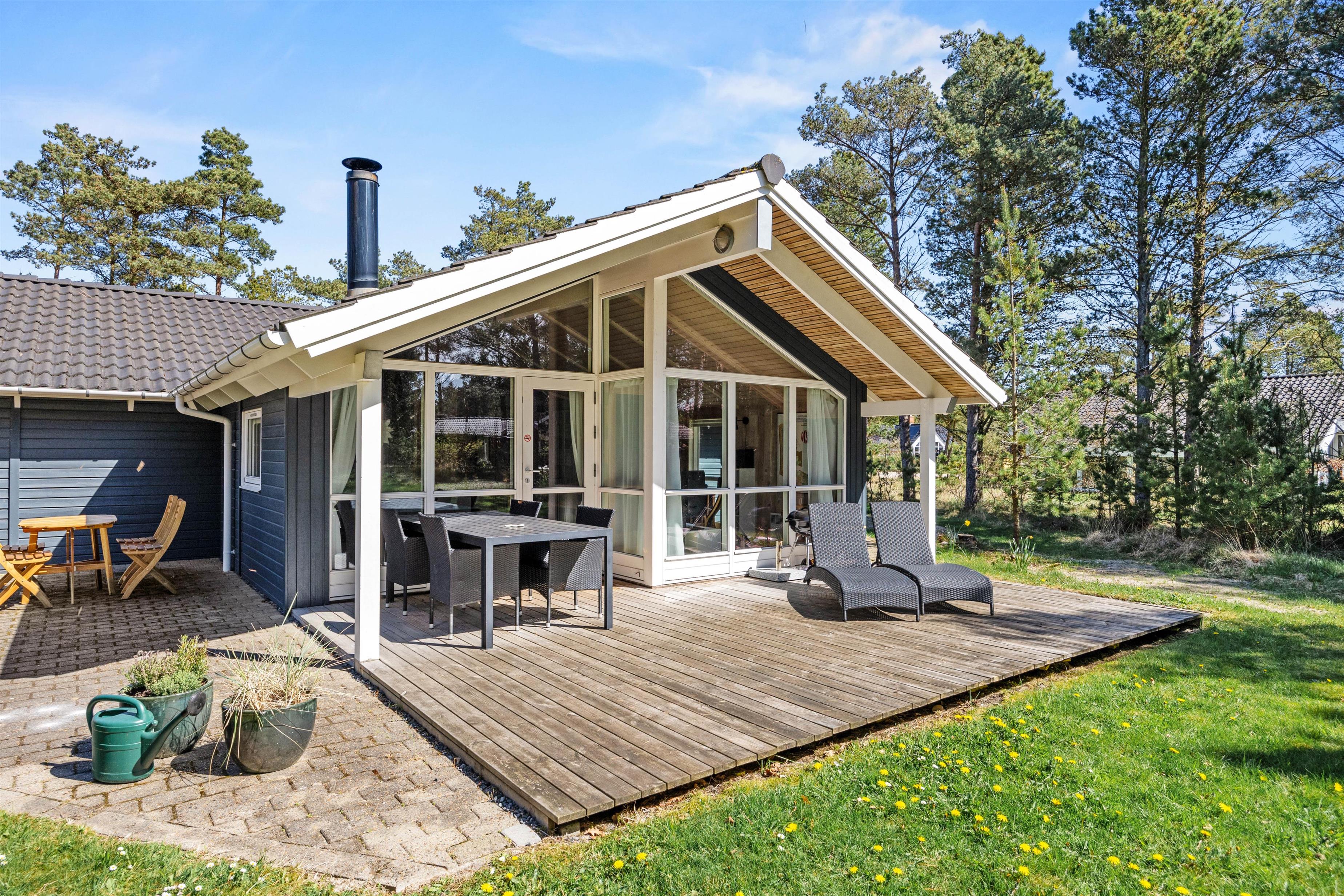 Sommerhuset ligger på en skøn naturgrund for enden af en blind vej, hvilket sikrer jer en uforstyrret ferieoplevelse i rolige omgivelser. På den afskærmede og delvist overdækkede terrasse kan I dagen lang nyde solen og den friske luft, mens børnene går på opdagelse blandt træerne eller leger i græsset. Her finder I ikke kun liggestole, parasol og havemøbler, men også en grill, så selv aftensmaden kan tilberedes og nydes under åben himmel på de lune aftener.