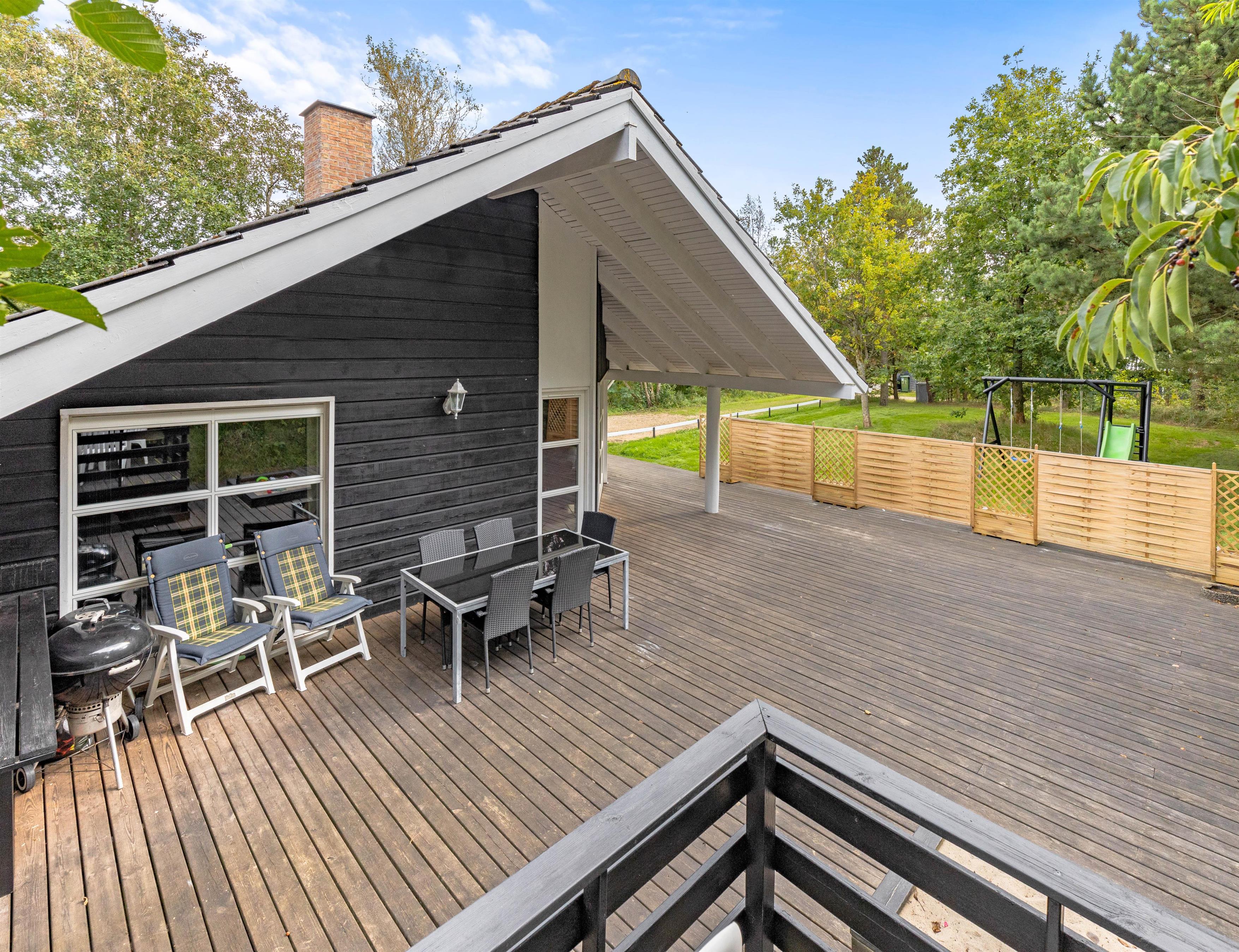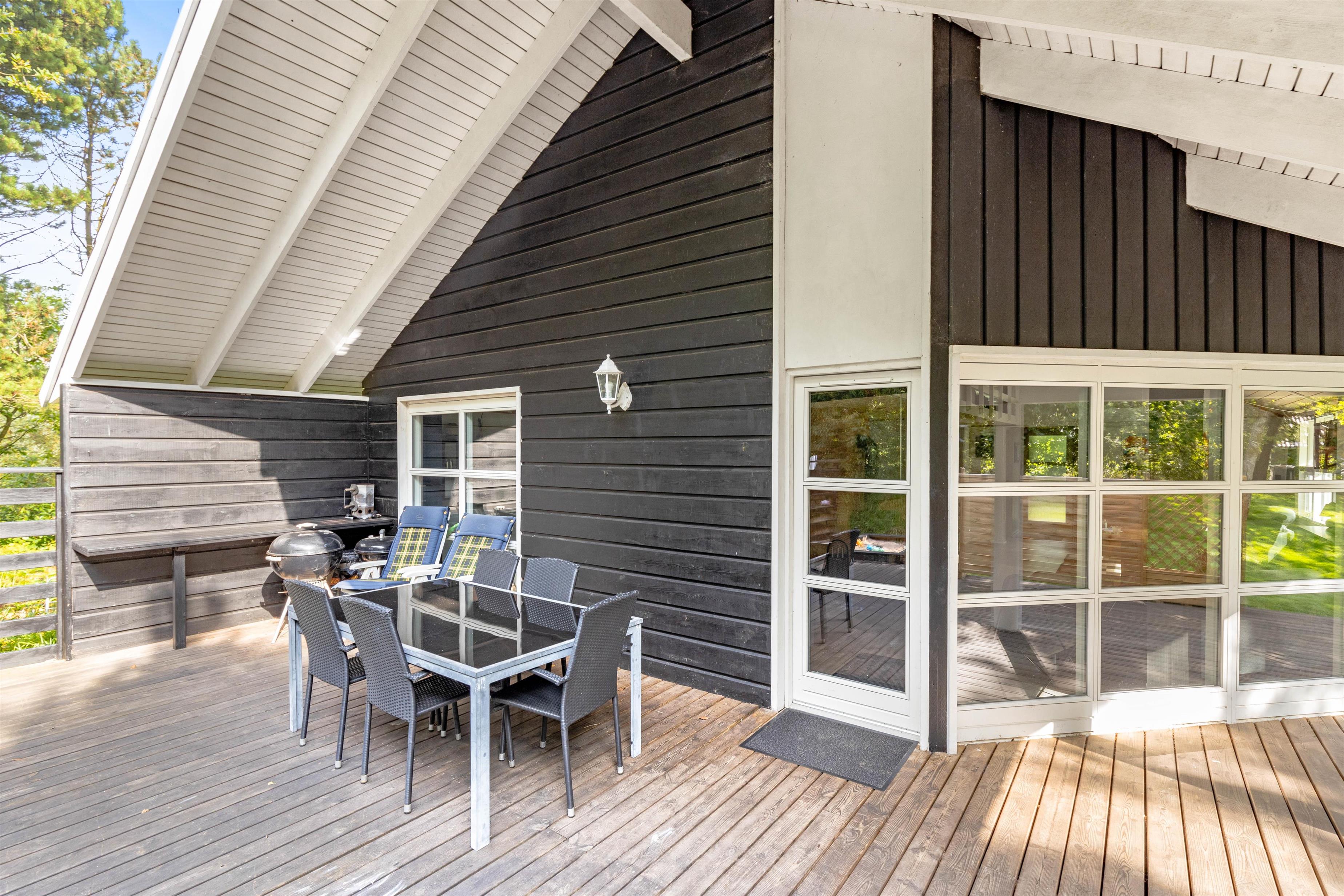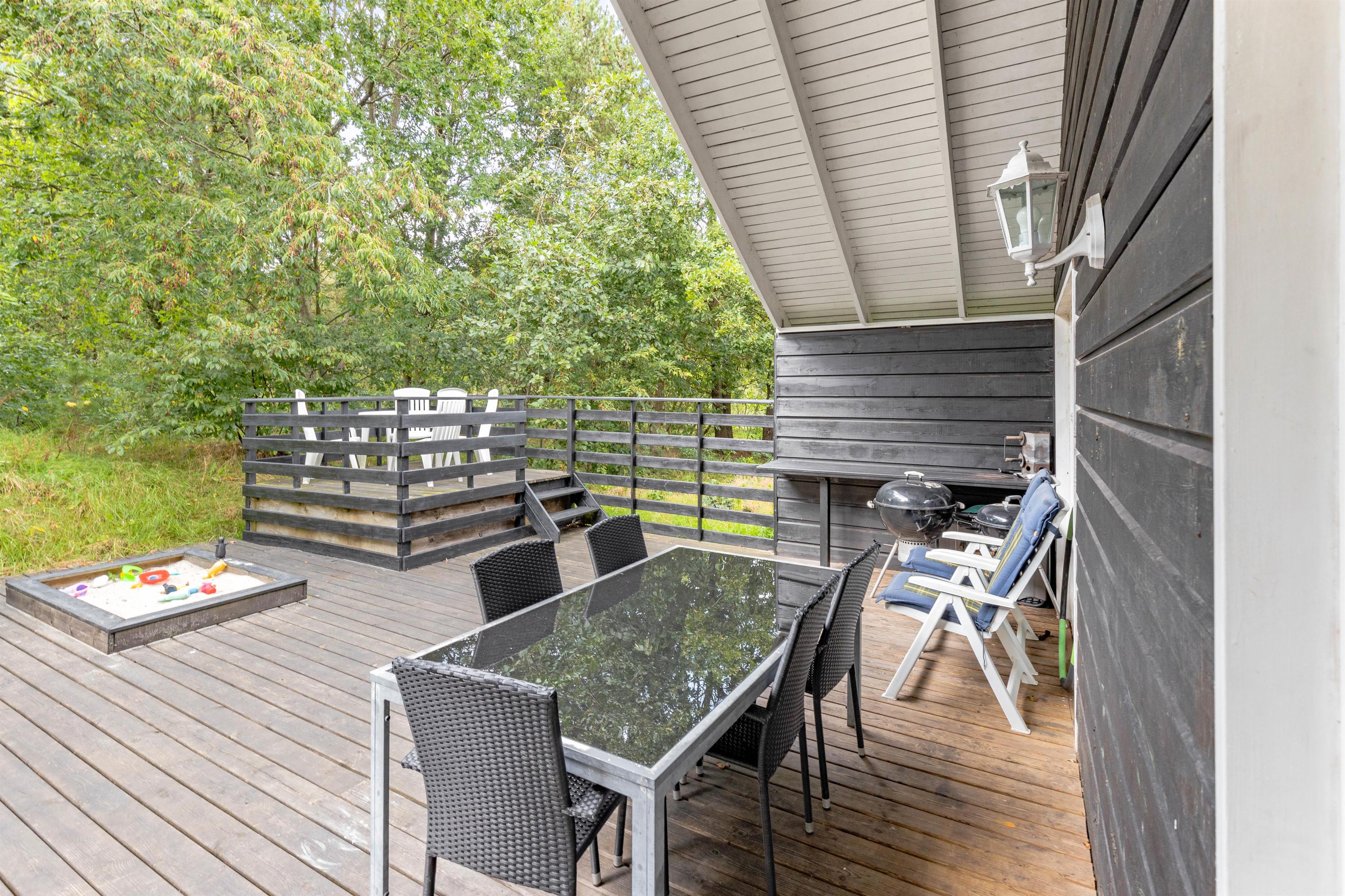 Udenfor er der er stor og delvis overdækket terrasse, hvor du kan tilbringe mange timer i den friske luft. Hen er der liggestole, hvor du kan nyde solens stråler, læse en god bog eller bare slappe af. Kuglegrillen indbyder til familiehygge med gode stegte pølser, bøffer og andre lækkerier.