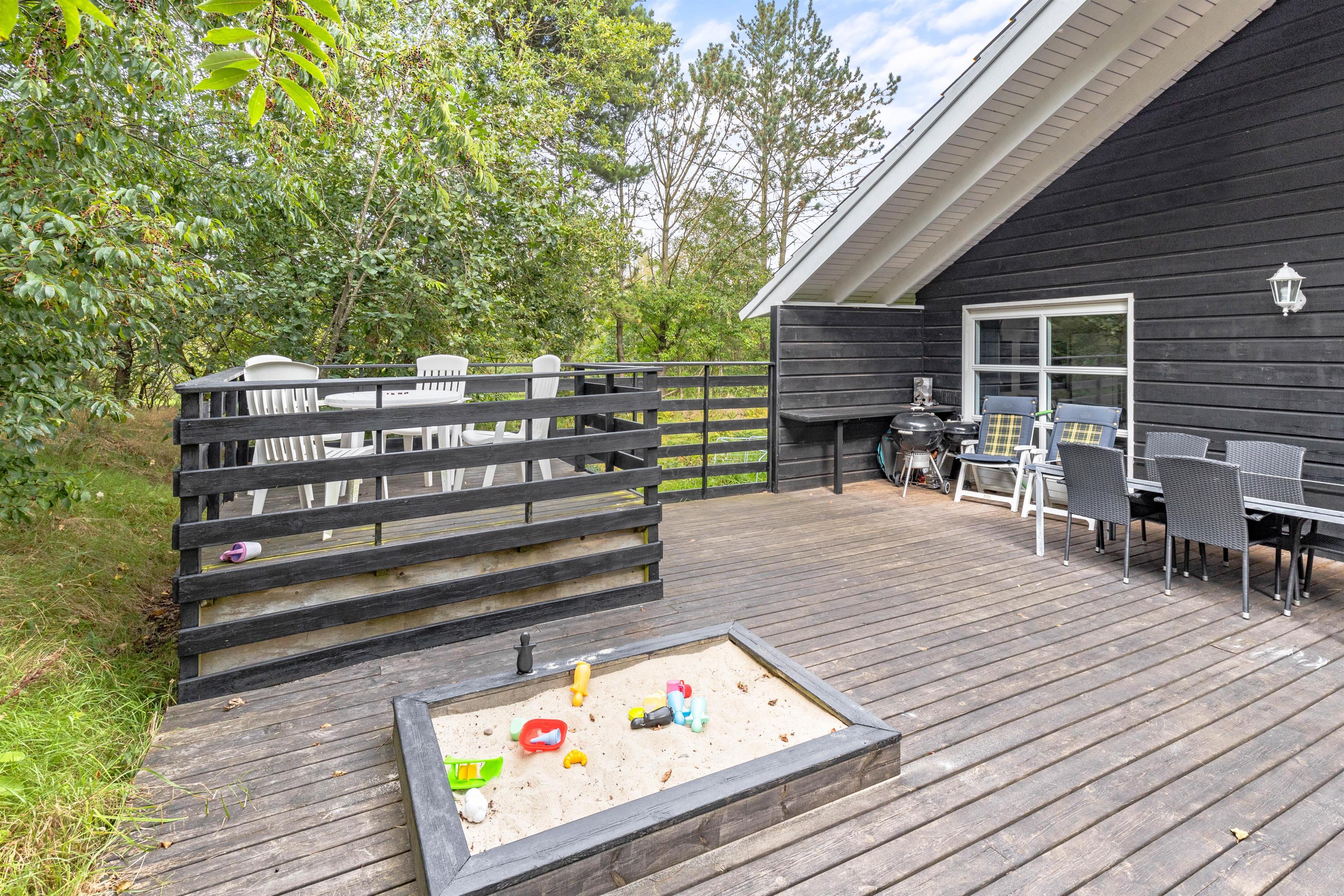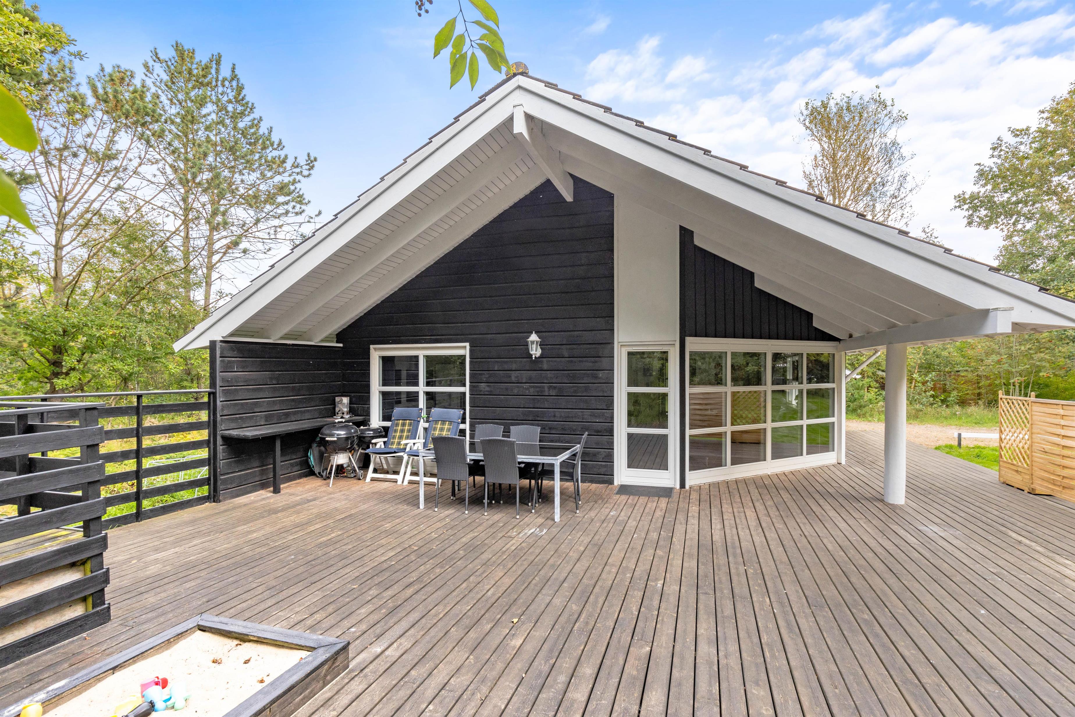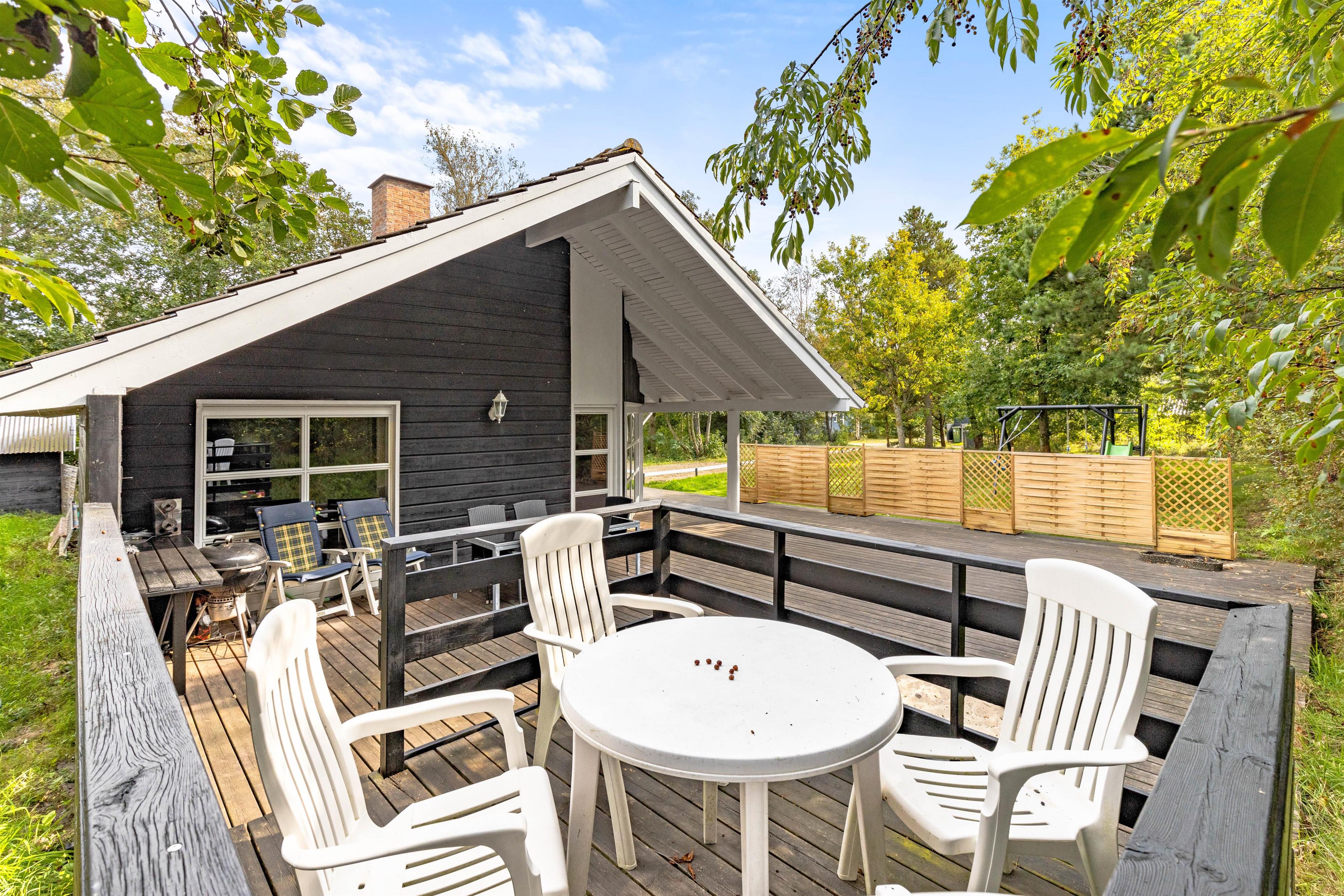 Udenfor er der er stor og delvis overdækket terrasse, hvor du kan tilbringe mange timer i den friske luft. Hen er der liggestole, hvor du kan nyde solens stråler, læse en god bog eller bare slappe af. Kuglegrillen indbyder til familiehygge med gode stegte pølser, bøffer og andre lækkerier.