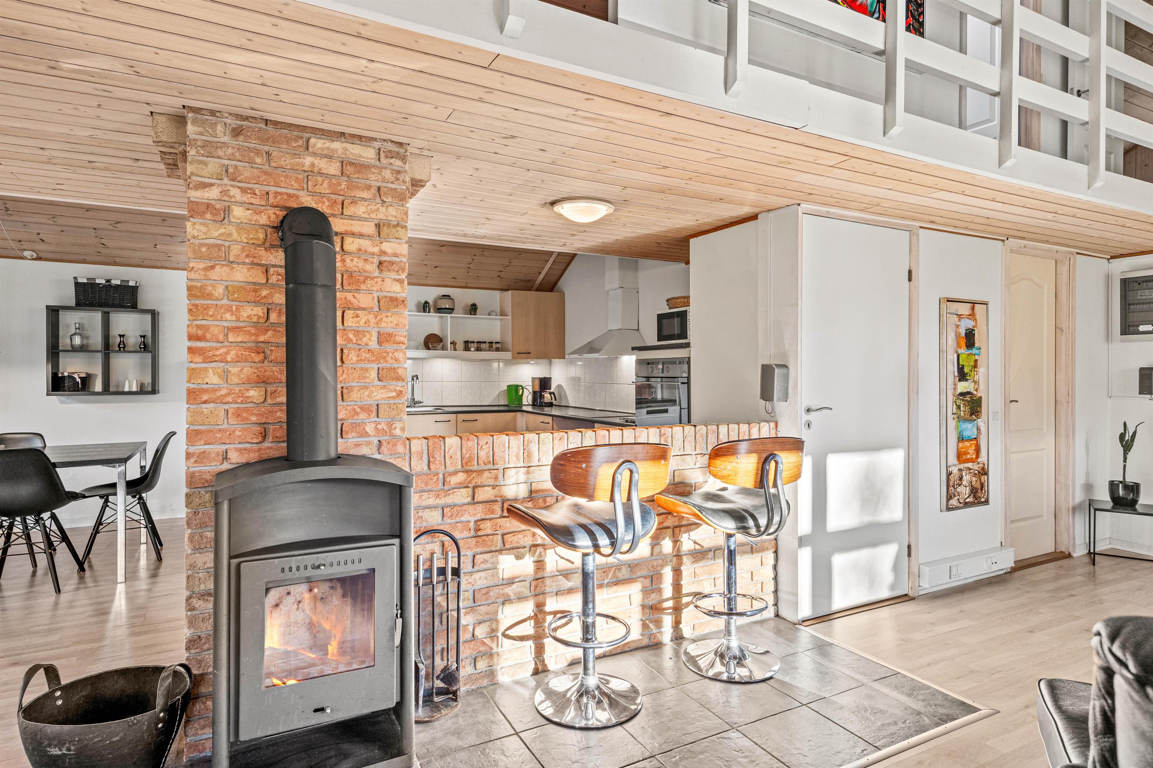 Der er højt til loftet og en trappe fører op til første sal, hvor du finder to af husets fire soveværelser. Det ene værelse har to enkeltsenge og det andet har én enkeltseng og ingen dør, men i stedet et forhæng. I stueetagen er der en dejlig stue med bløde møbler, brændeovn og kunst på væggene. Stuen har forbindelse til køkkenet, som er udstyret med alt det nødvendige, herunder en opvaskemaskine, så du slipper for at vaske op i hånden. Der er også en energibesparende varmepumpe, så du kan få præcis den temperatur i sommerhuset, som du ønsker hele året rundt.