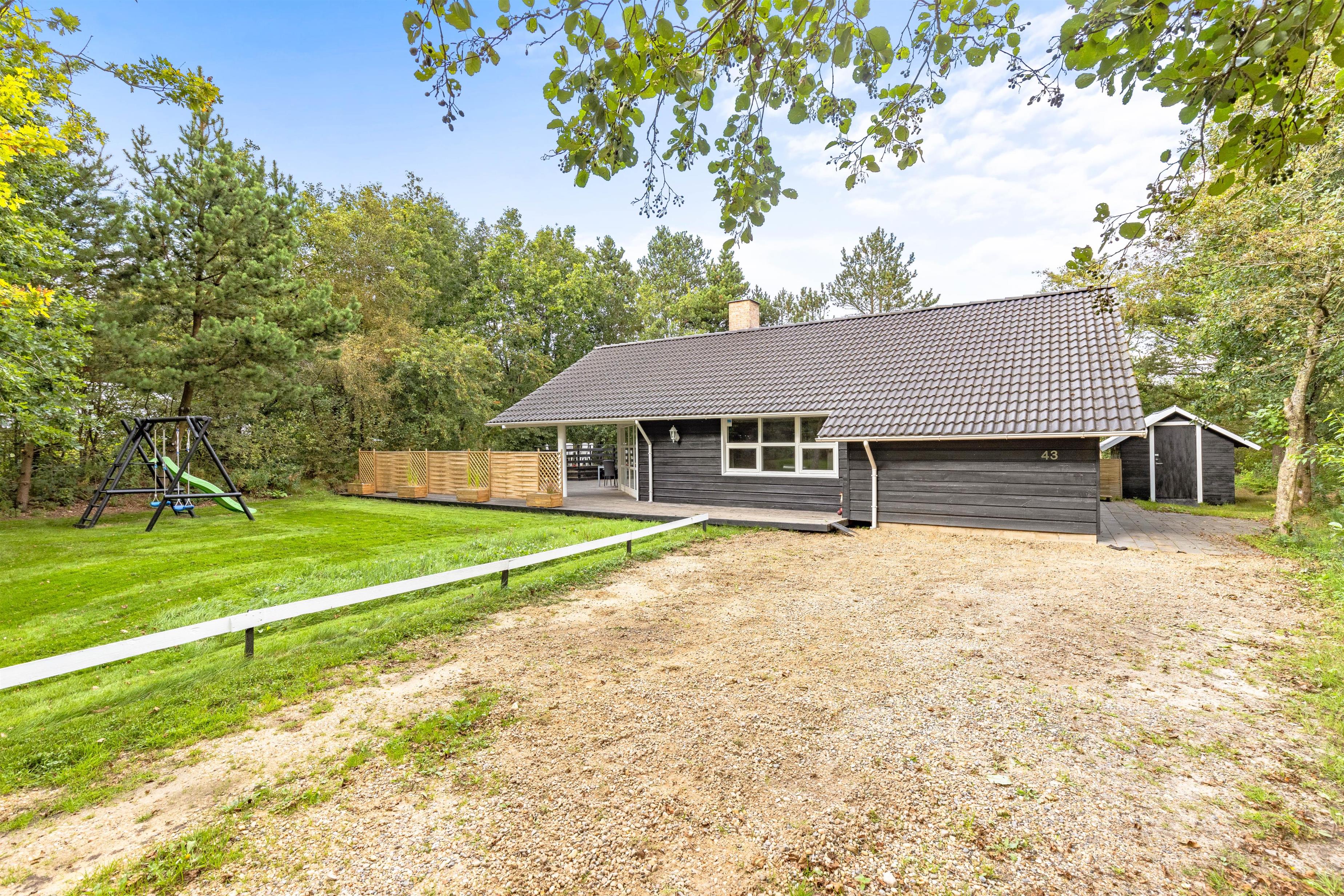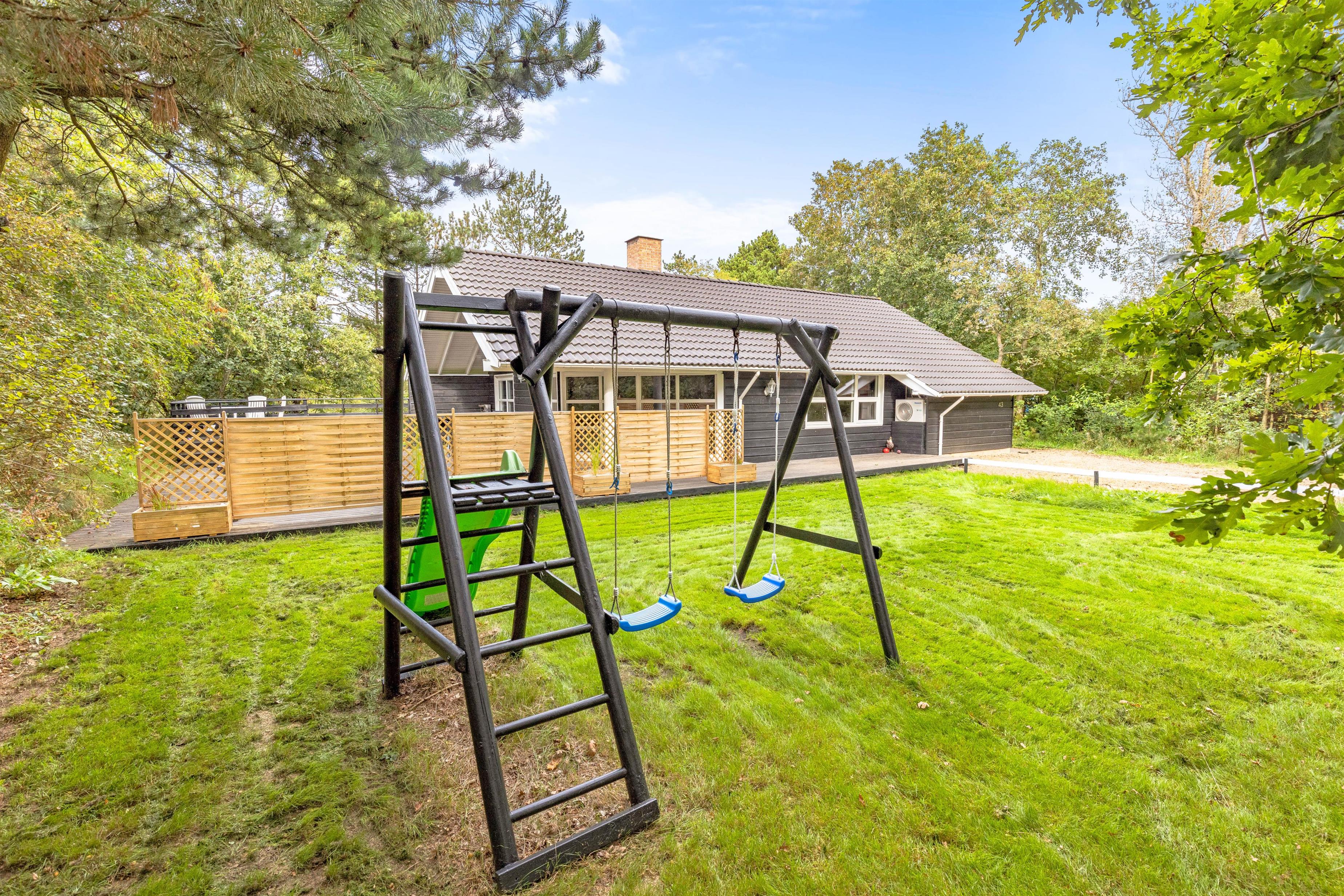 Delvis overdækket terrasse, gynger og sandkasse