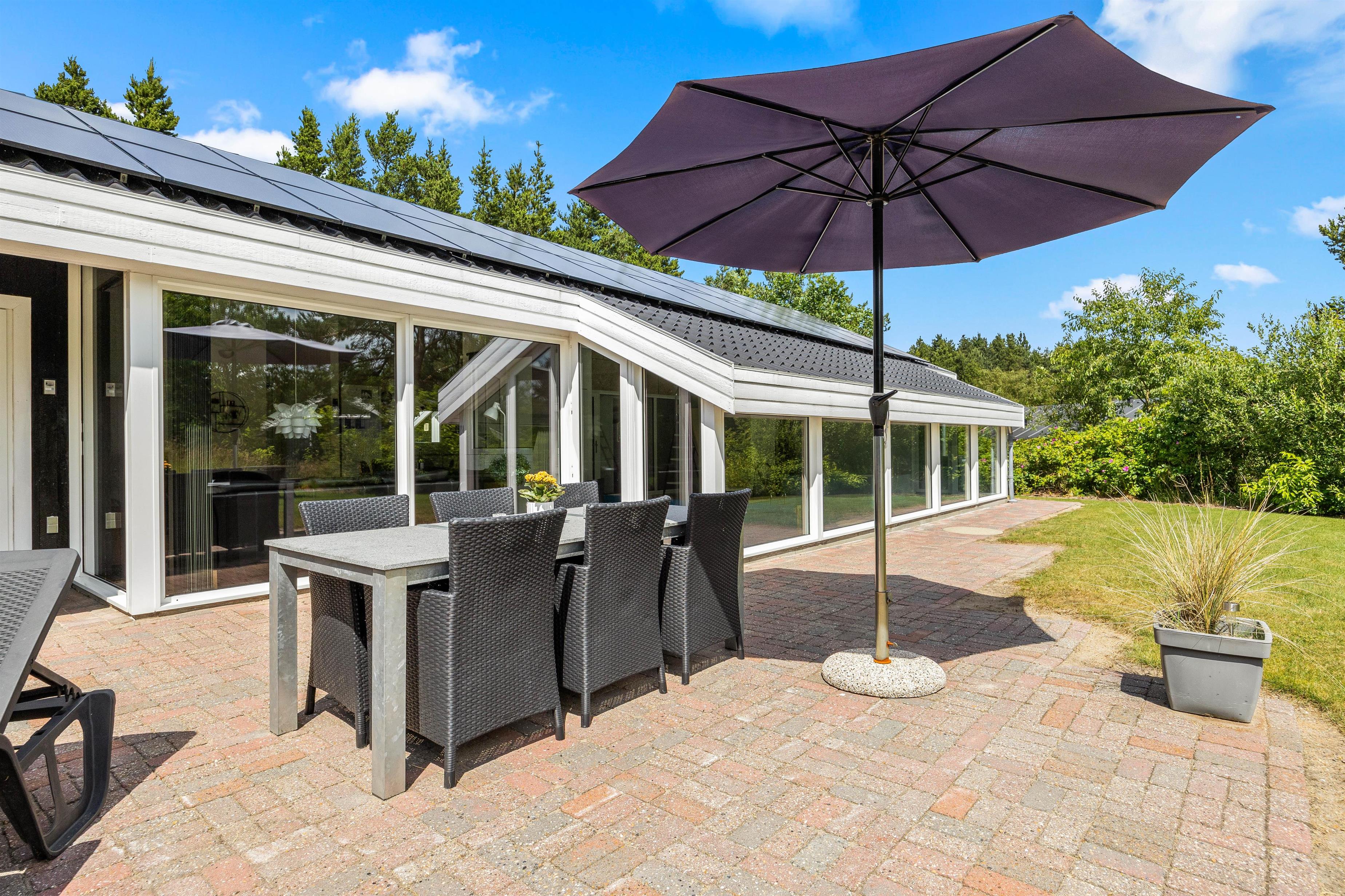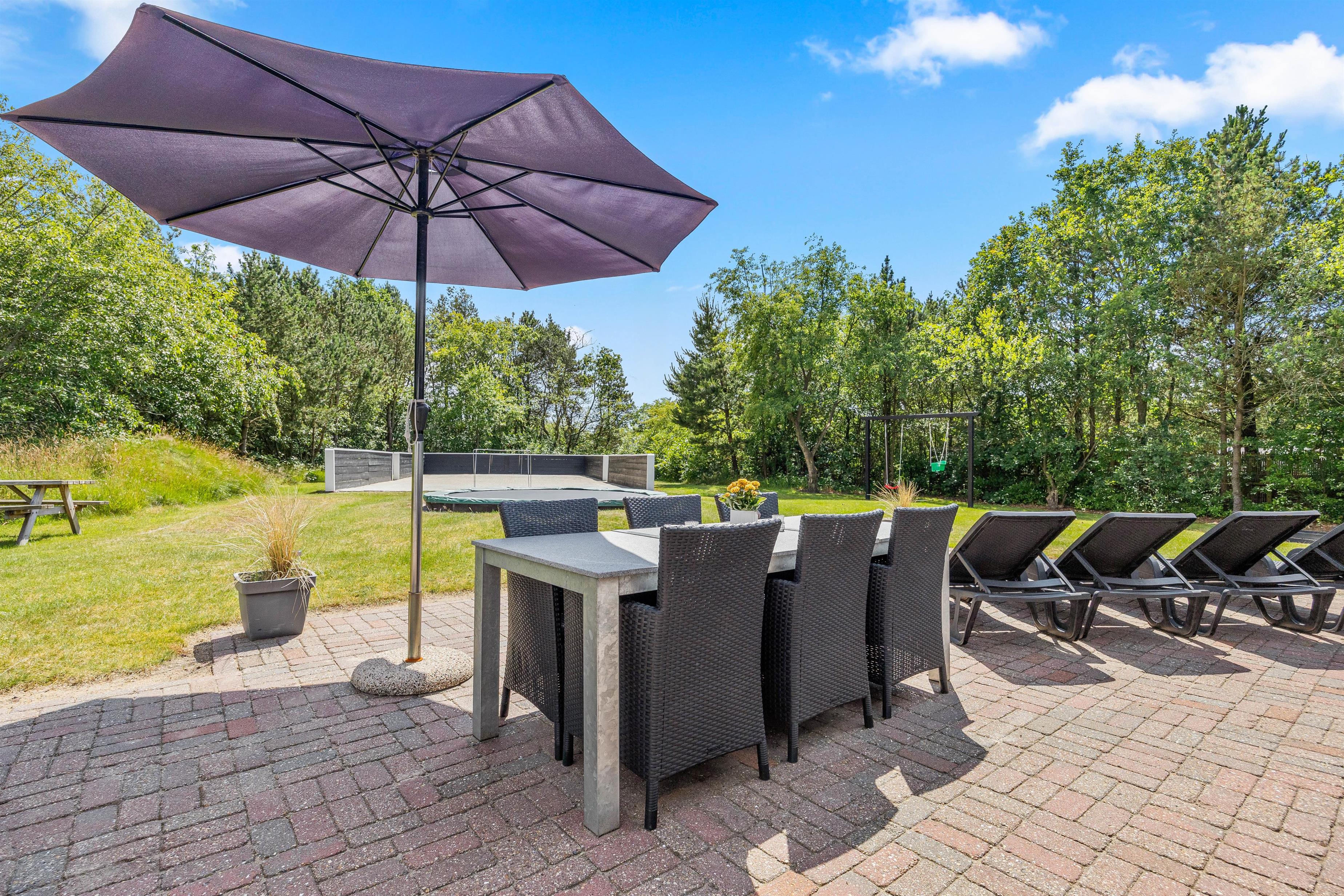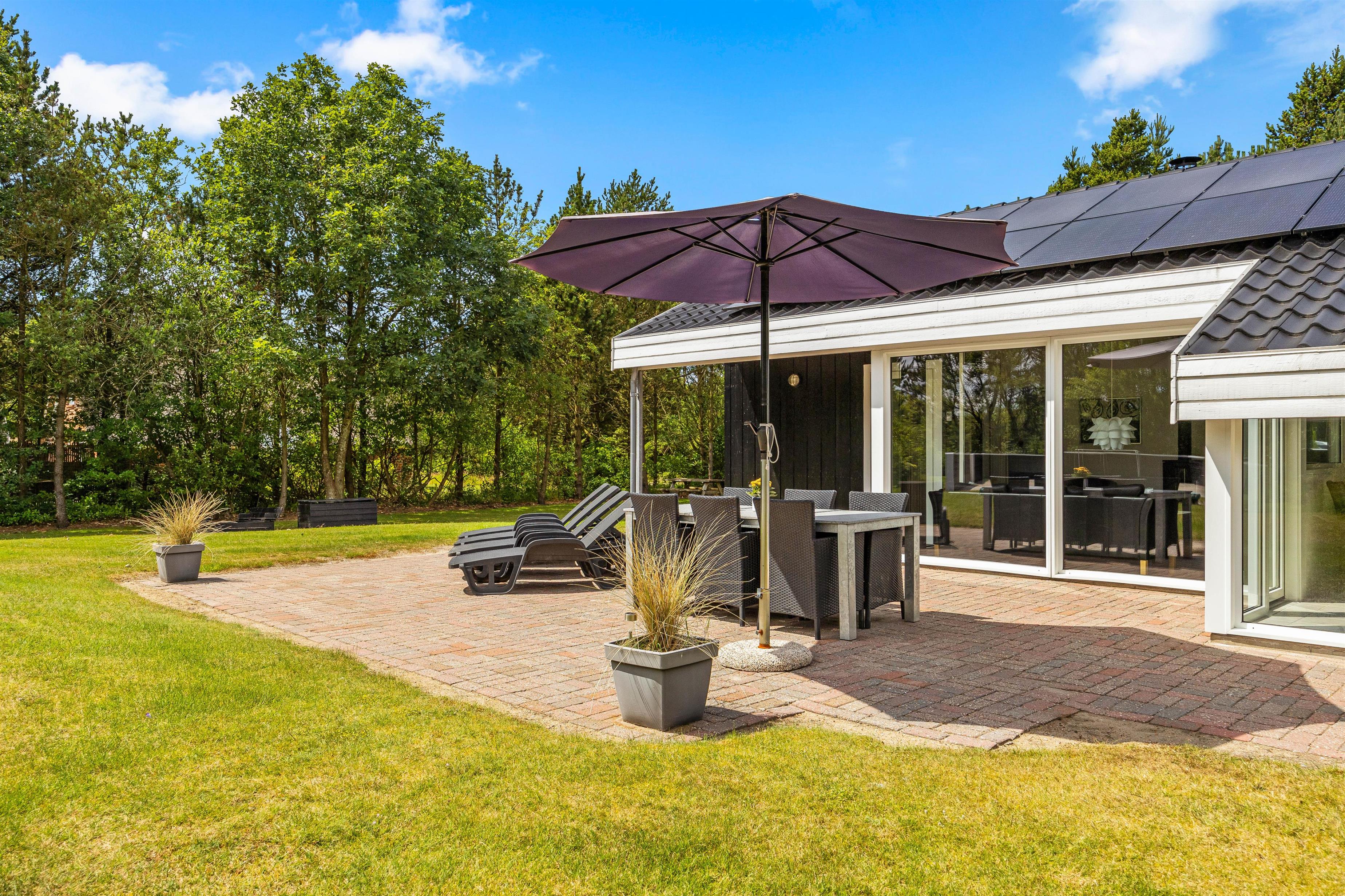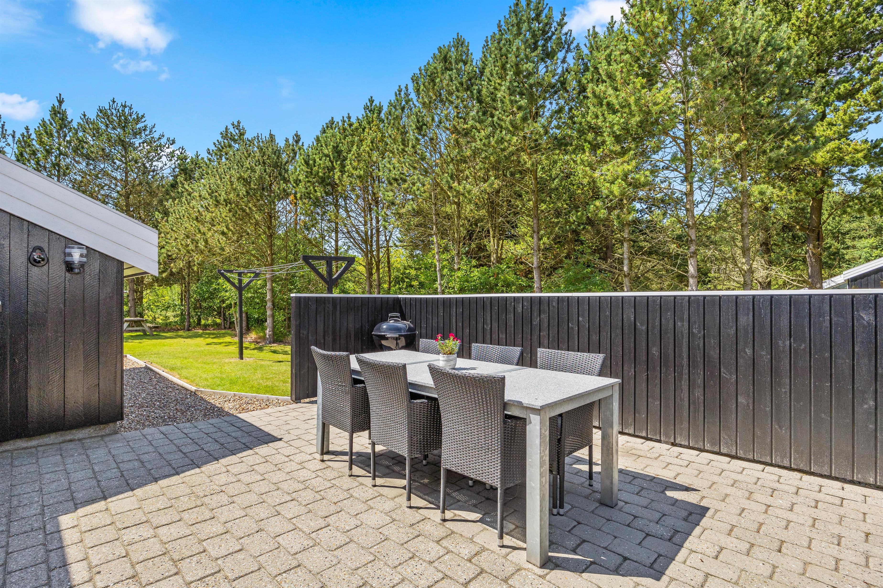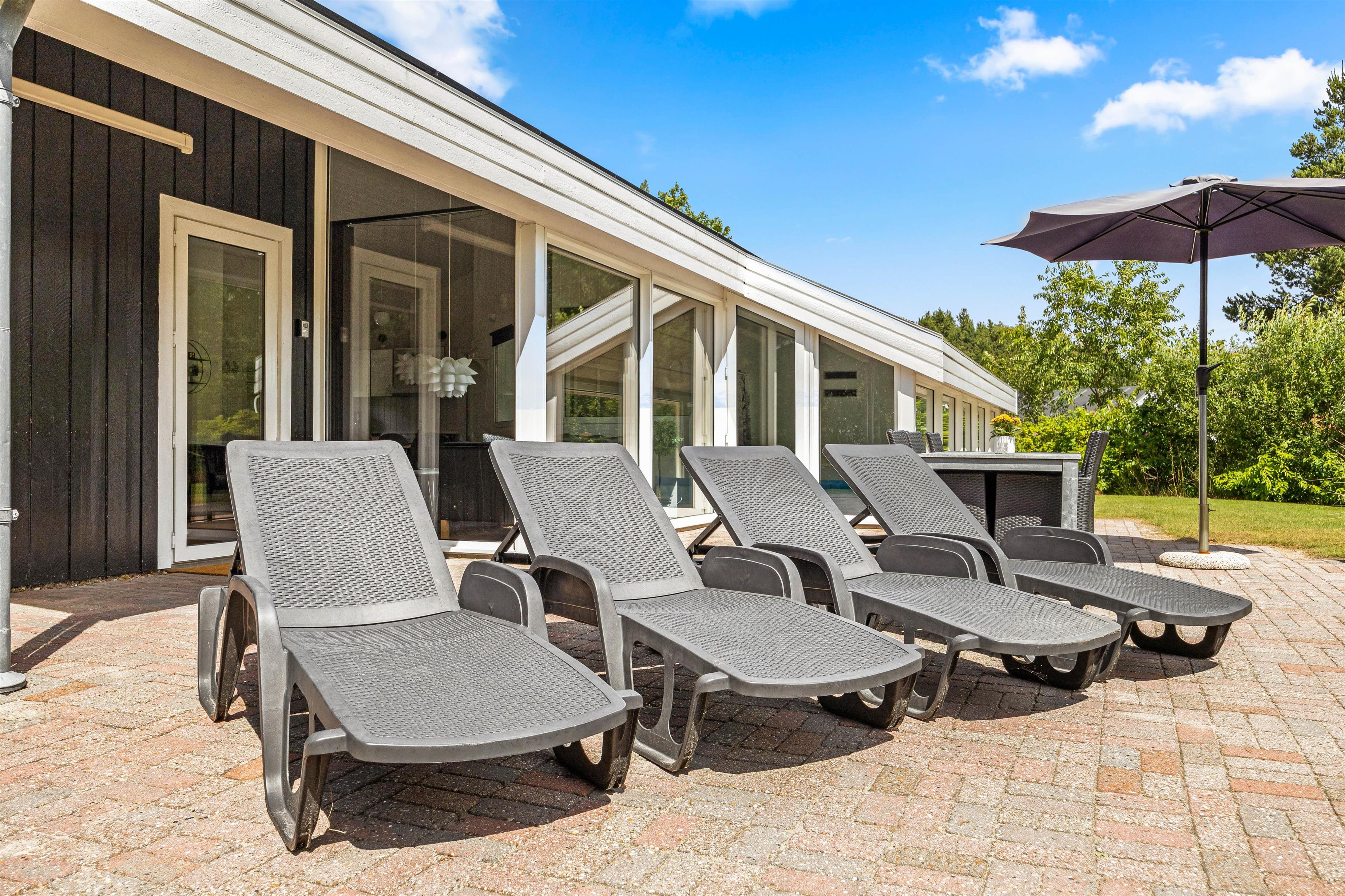 Rundt omkring sommerhuset finder I en delvis overdækket og åben terrasse, der er fuldt udstyret til en behagelig ferieoplevelse. Her er der både grill og havemøbler til en hyggelig grillaften samt parasol og solvogne til de solrige dage.