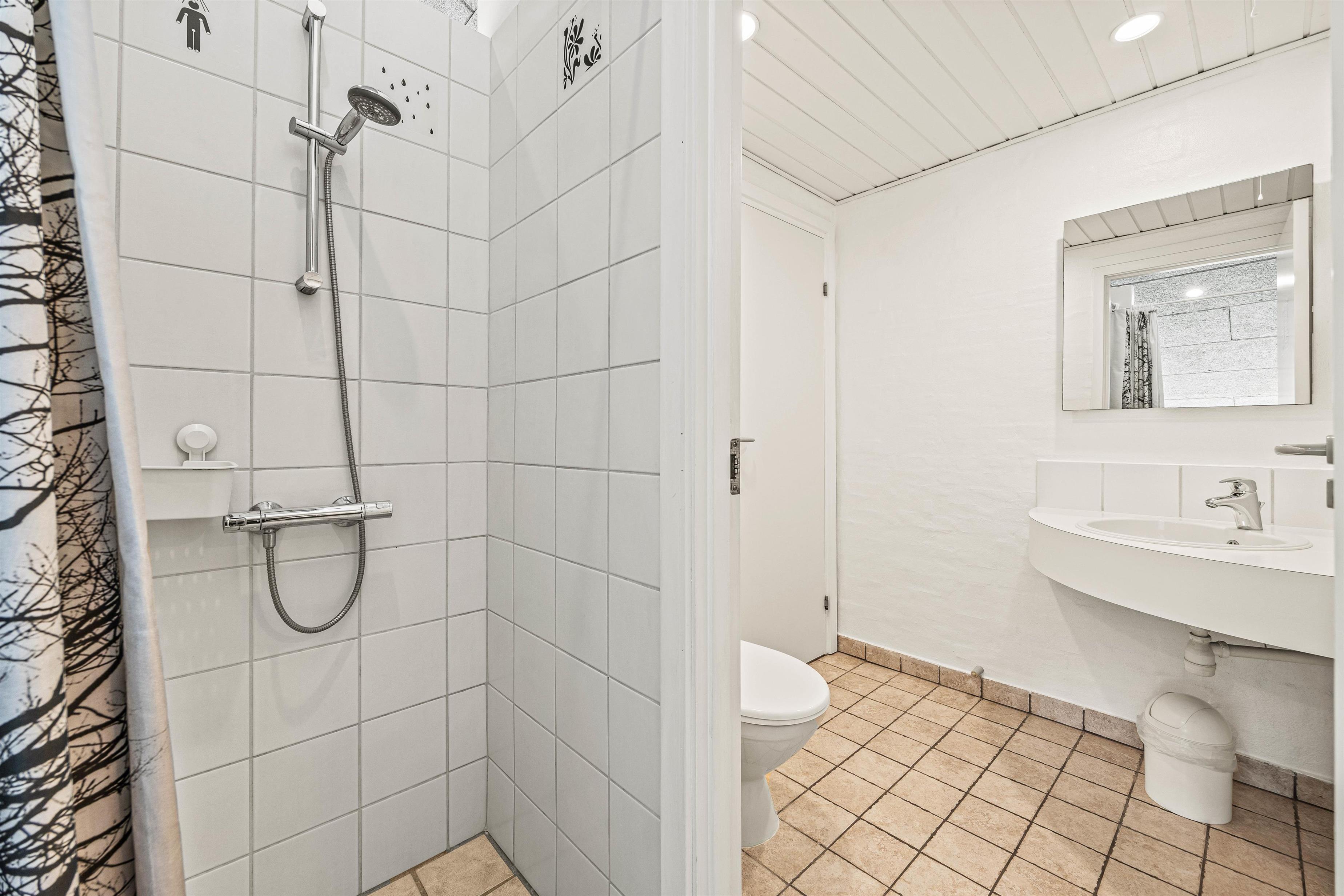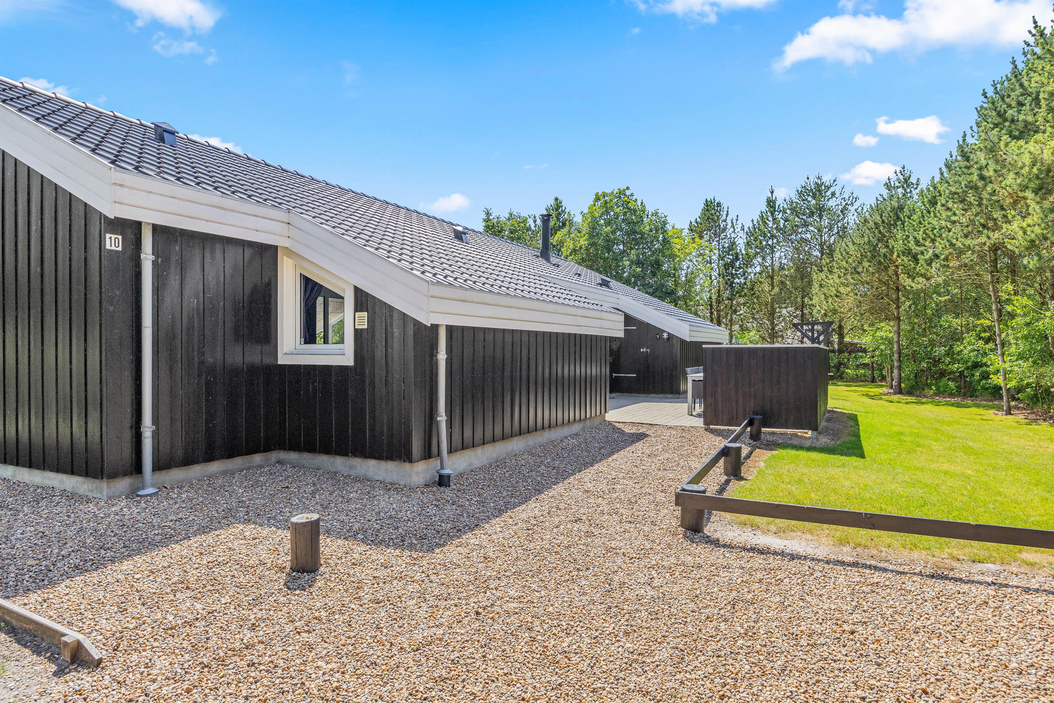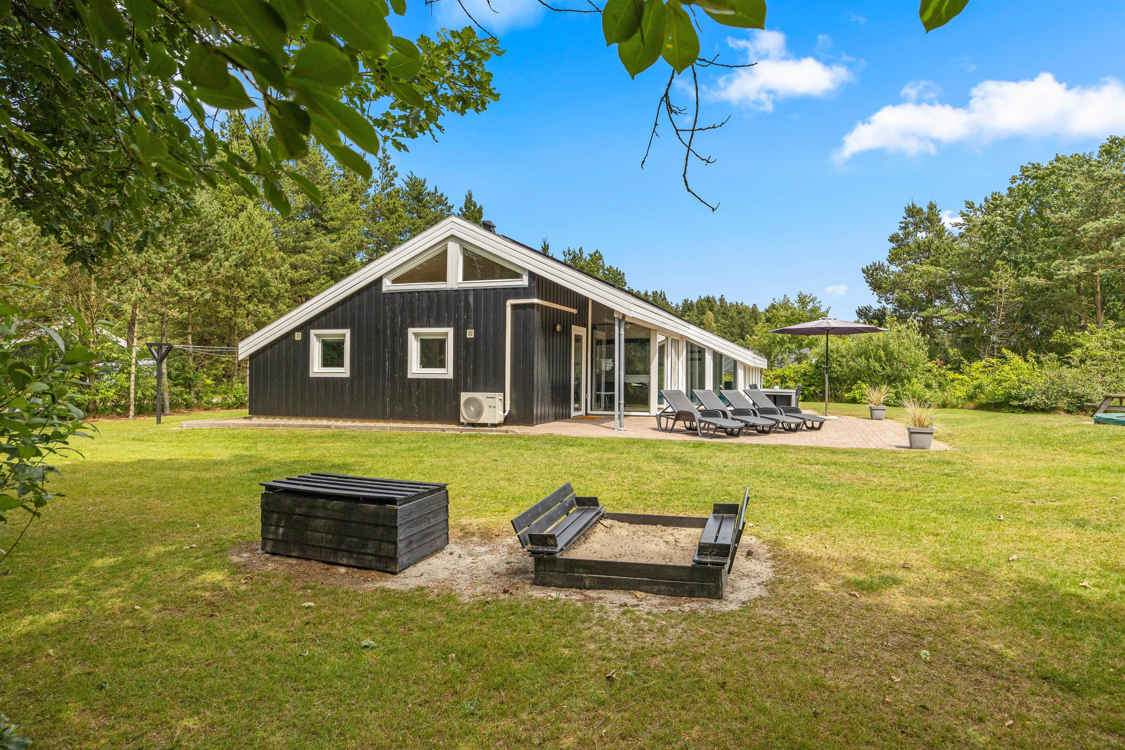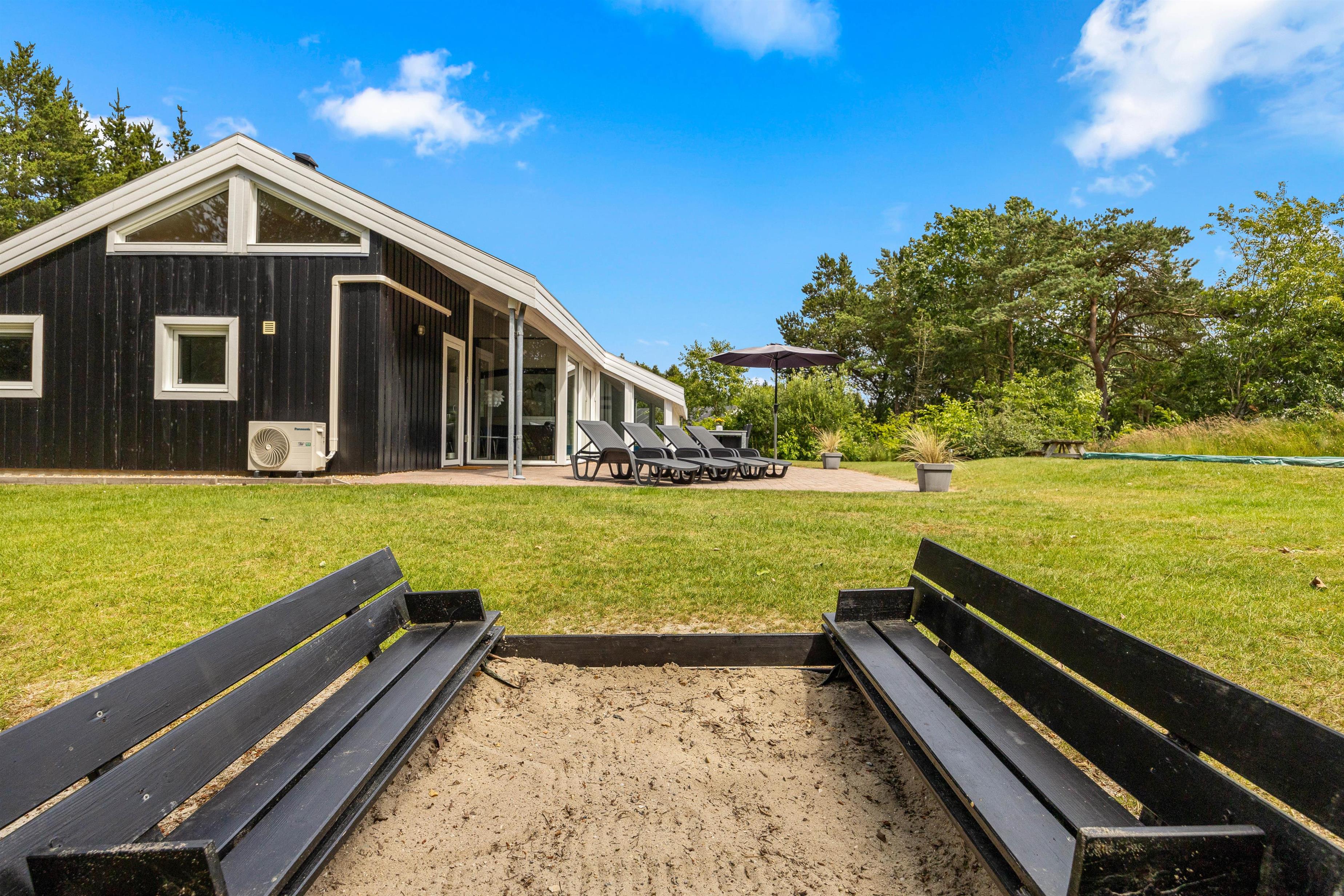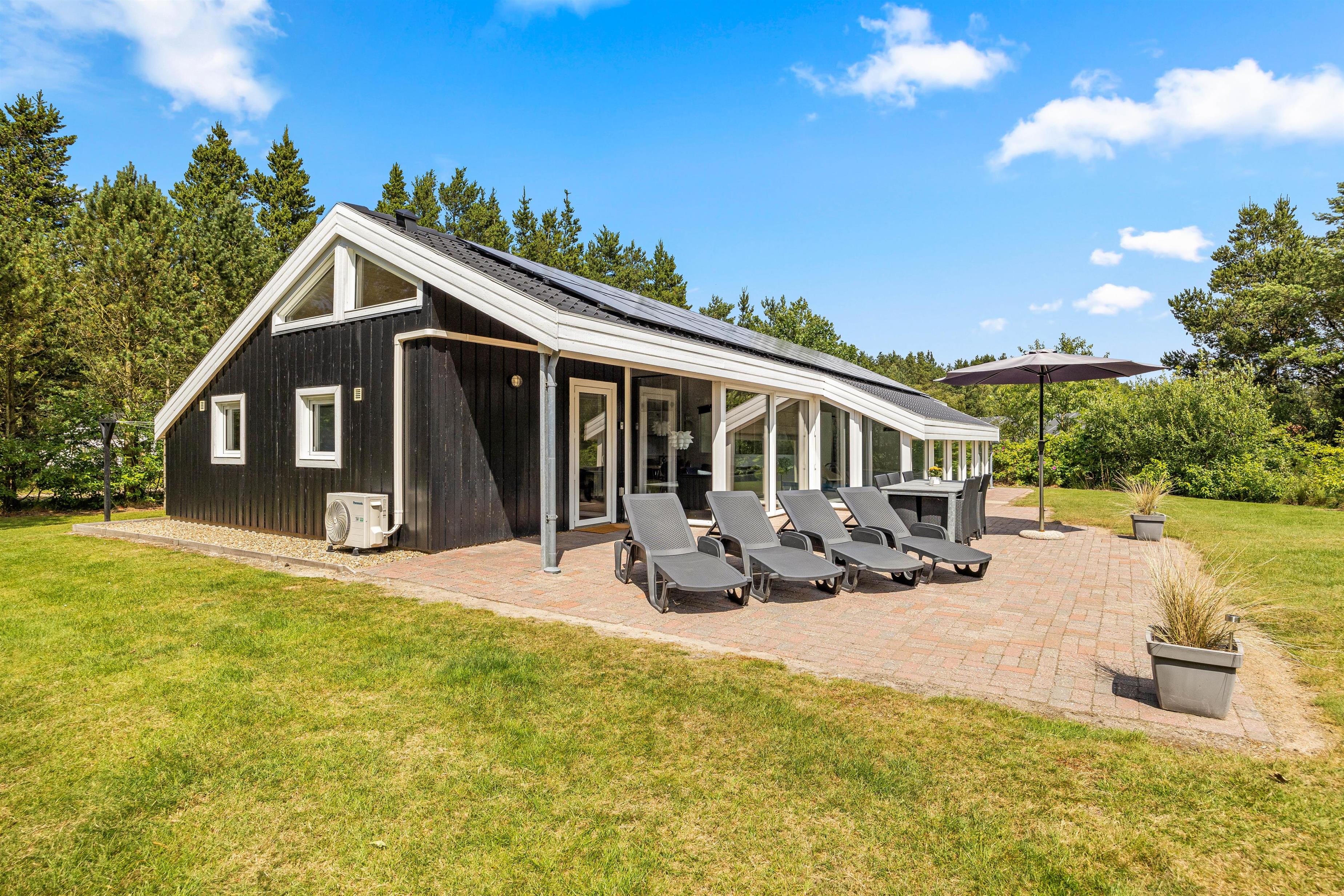 Rundt omkring sommerhuset finder I en delvis overdækket og åben terrasse, der er fuldt udstyret til en behagelig ferieoplevelse. Her er der både grill og havemøbler til en hyggelig grillaften samt parasol og solvogne til de solrige dage.