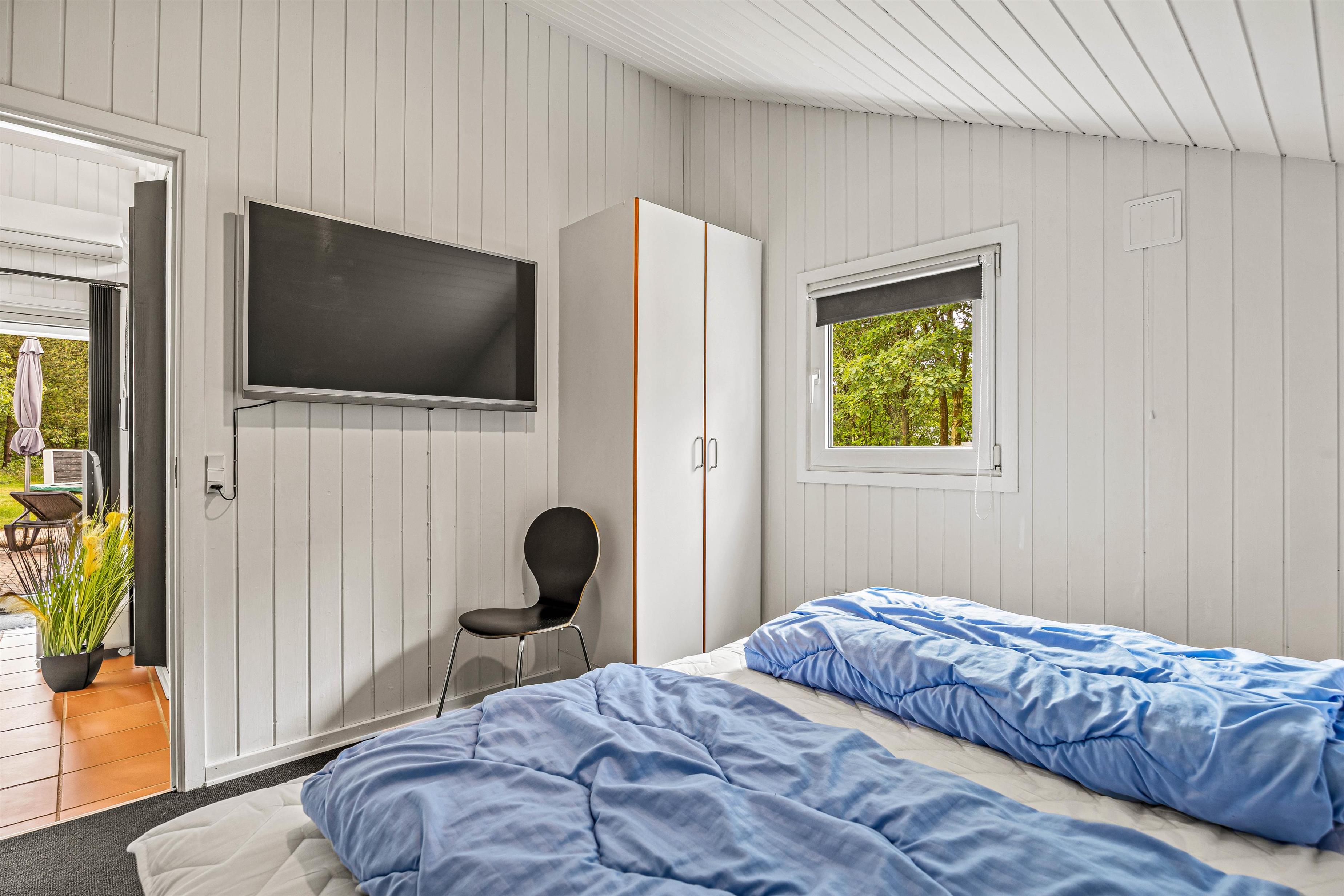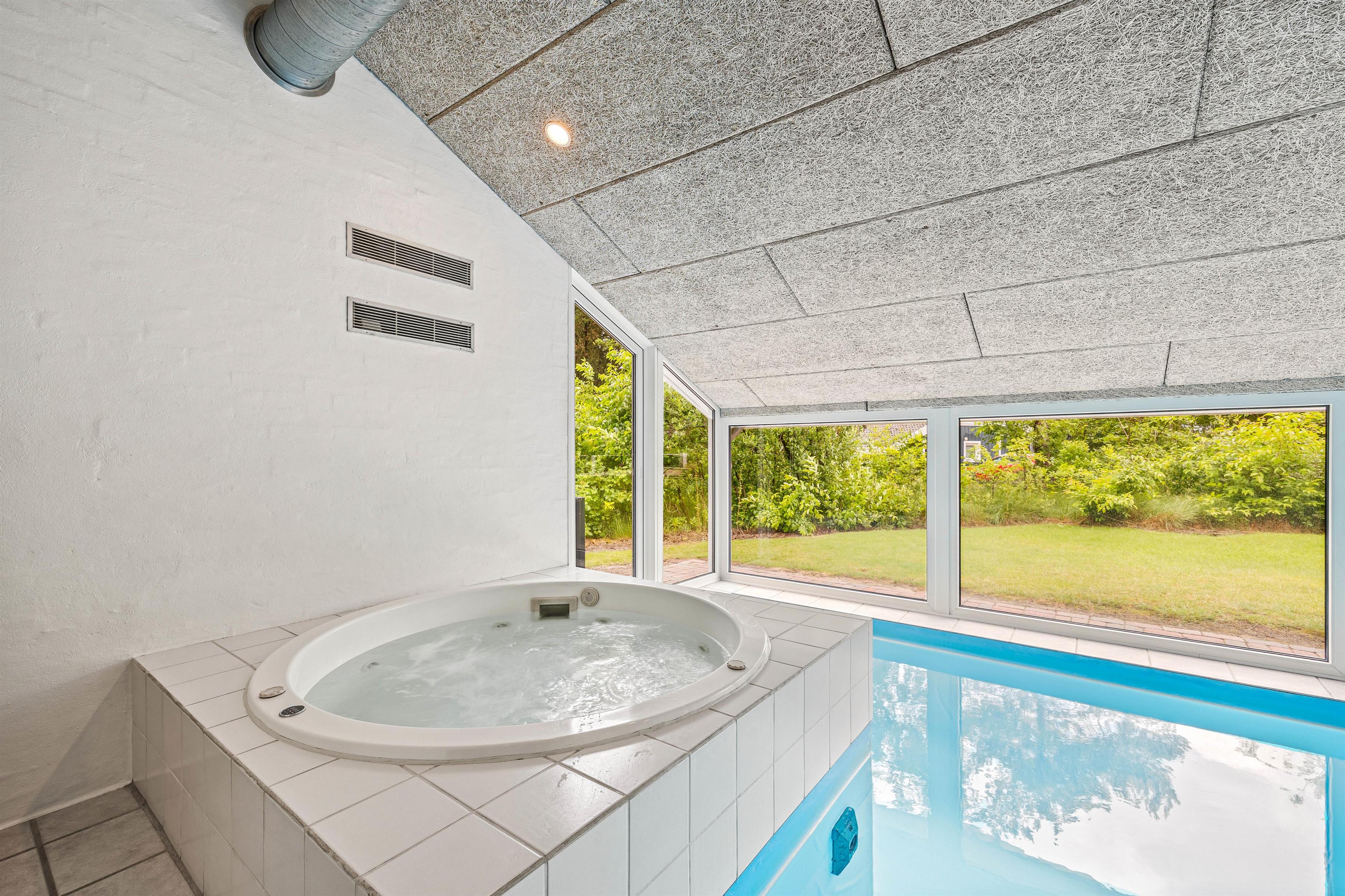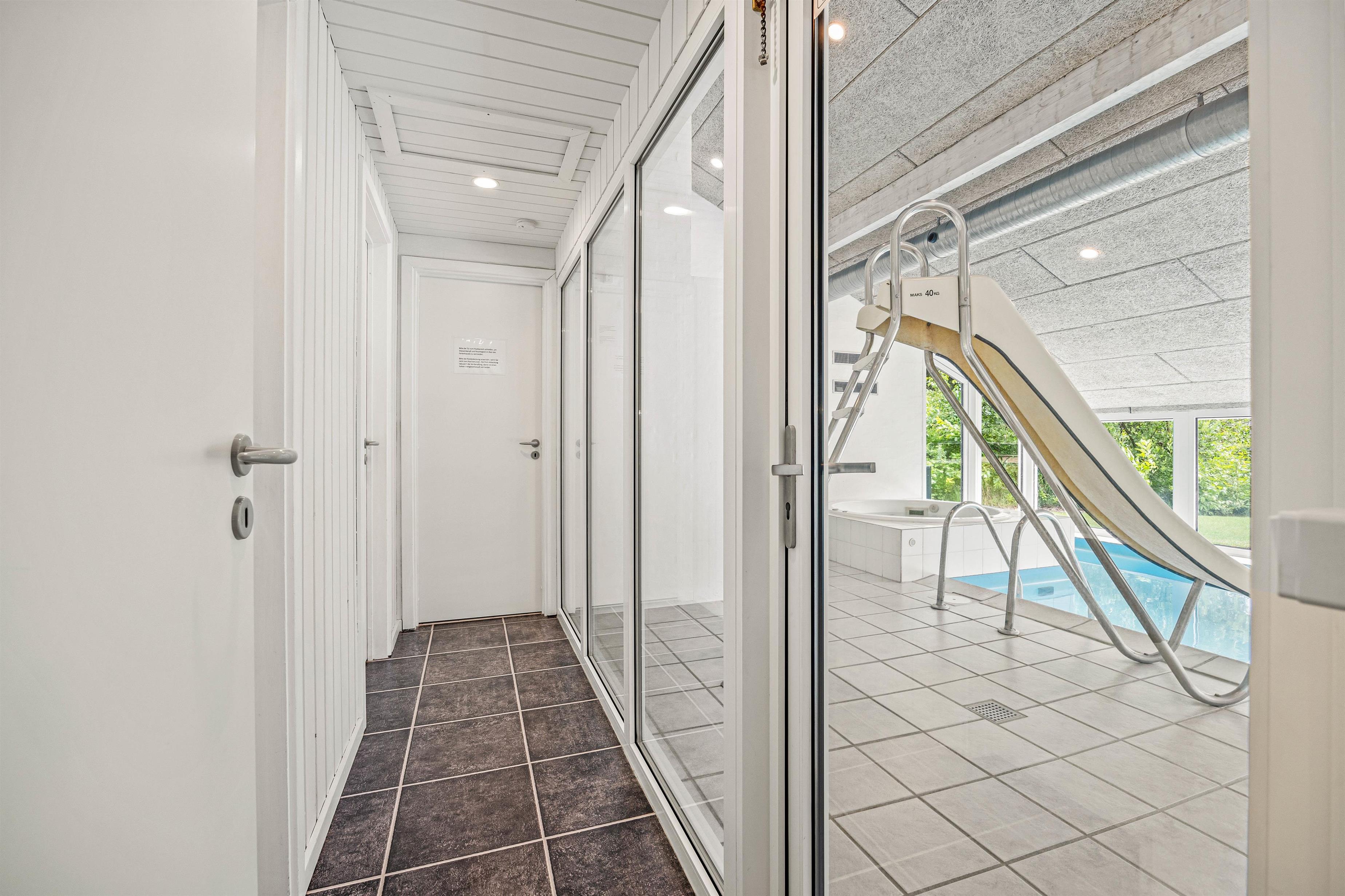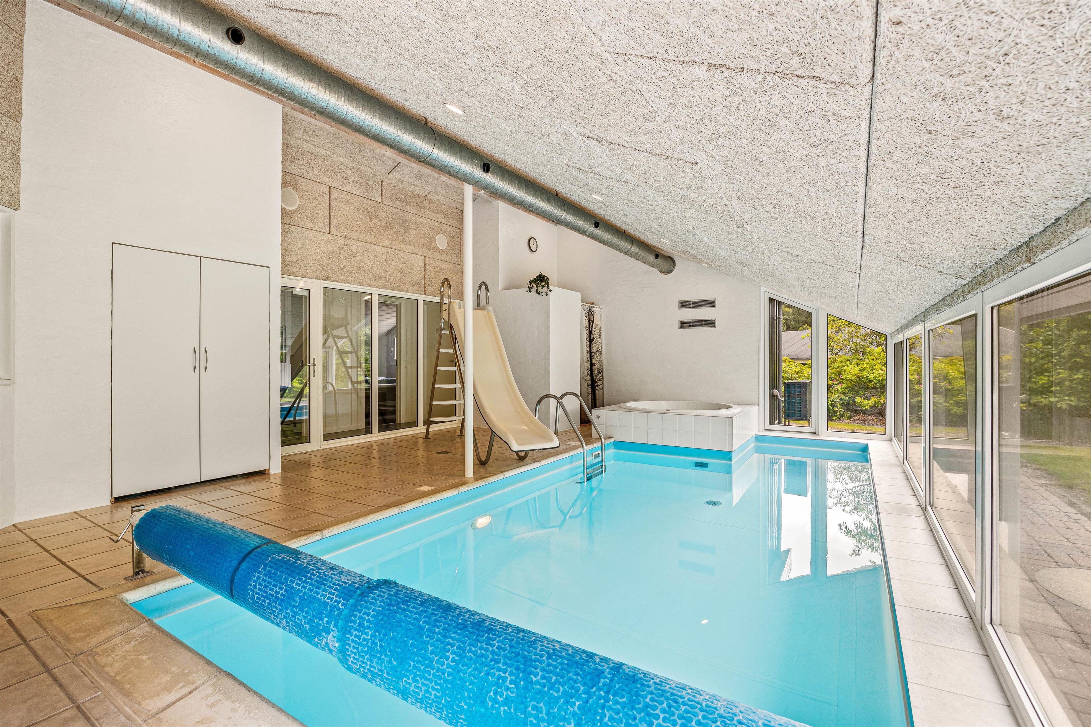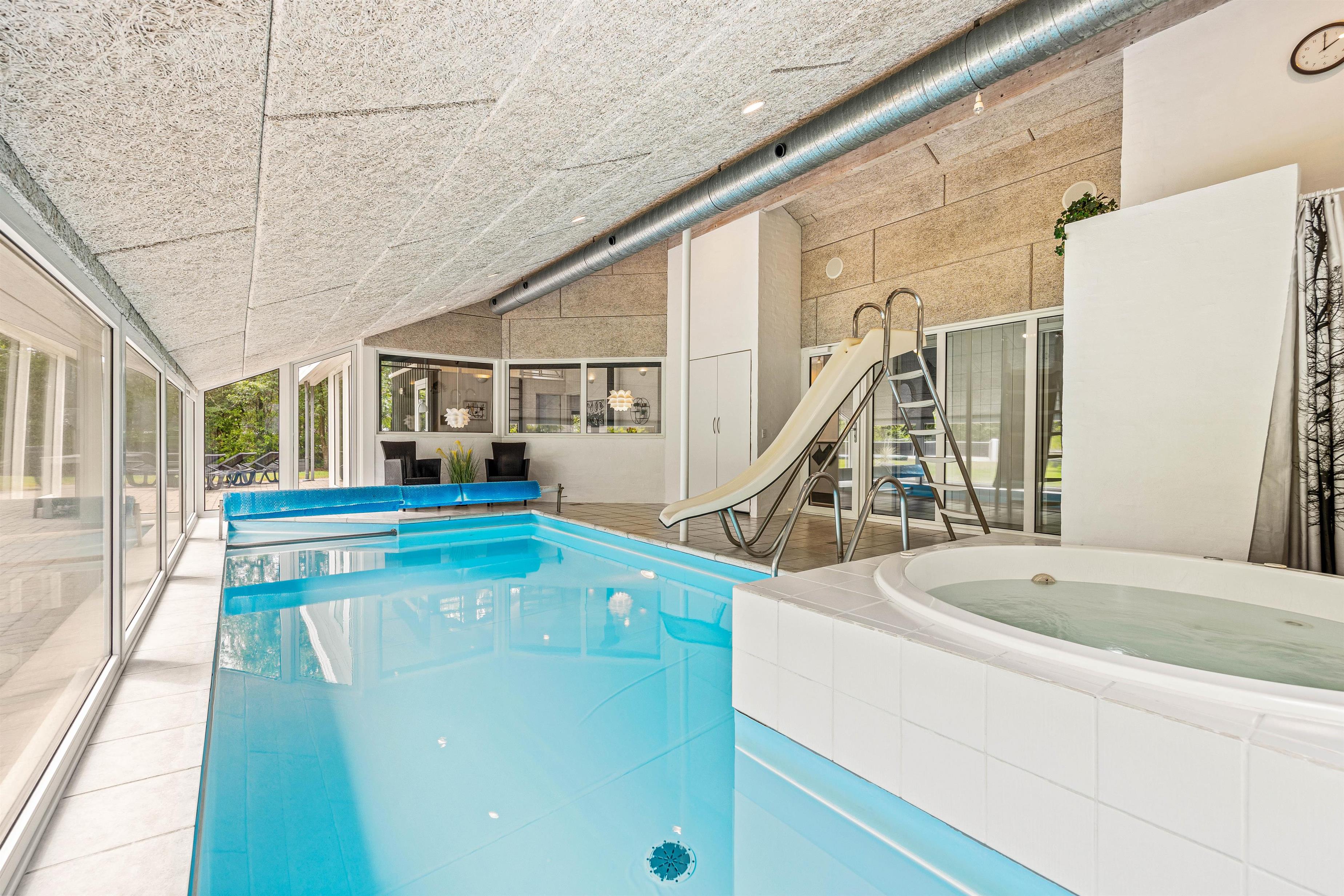 Sommerhuset byder på et imponerende poolområde, der er ideelt til familiehygge og afslapning. Den 18m² store pool er udstyret med en svømmetræner, som gør det muligt at holde sig aktiv, mens man nyder ferien. Poolrummet har en rutsjebane og et Bluetooth-højtalersystem, der sørger for musik og underholdning. Efter en svømmetur kan I slappe af i spaen eller saunaen, som giver en perfekt afslutning på dagen. Derudover er der en hårtørrer tilgængelig på begge badeværelser.
