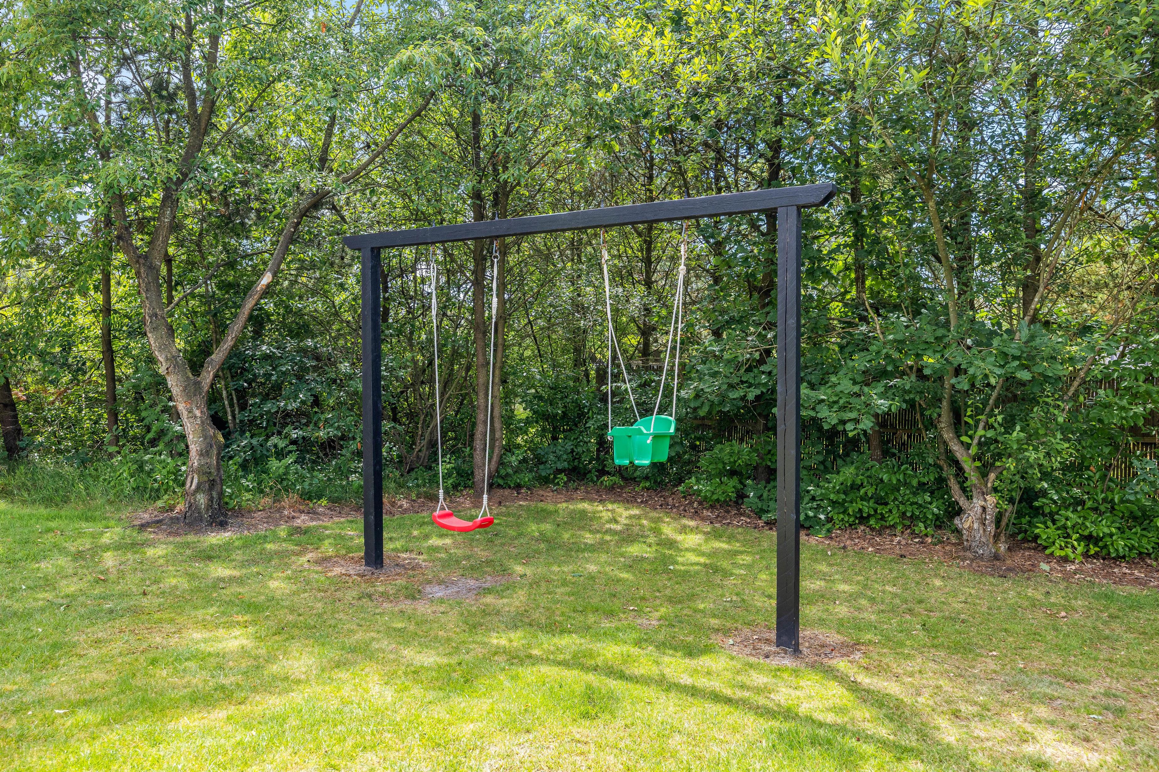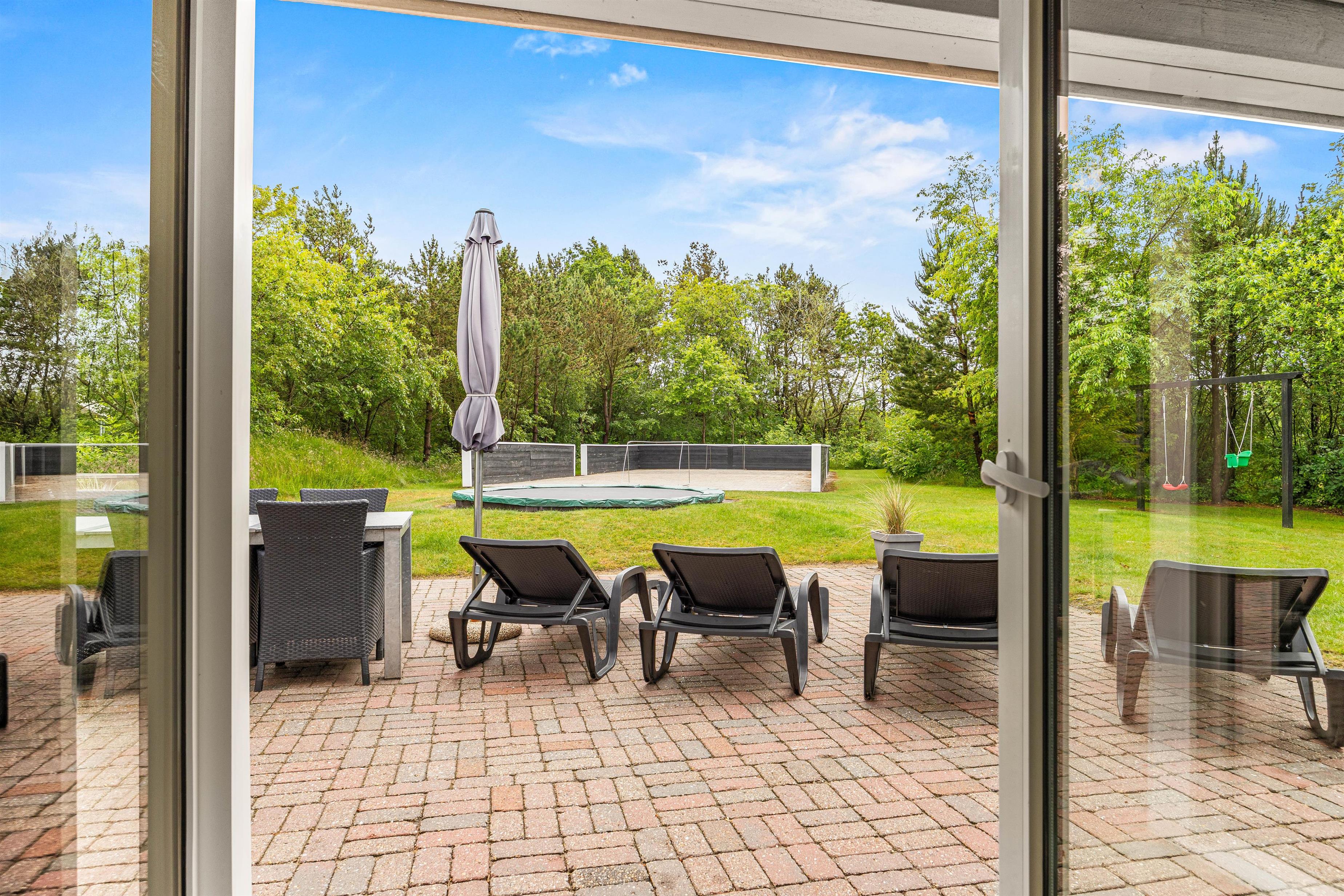 Fra terrassen kan I nyde udsigten over den 2098 kvadratmeter store naturgrund, hvor I også finder en multibane på 140 kvadratmeter, som kan bruges til aktiviteter som fodbold og meget mere. Derudover er der en trampolin, en gynge og en sandkasse, så der er masser af plads til leg og aktivitet.