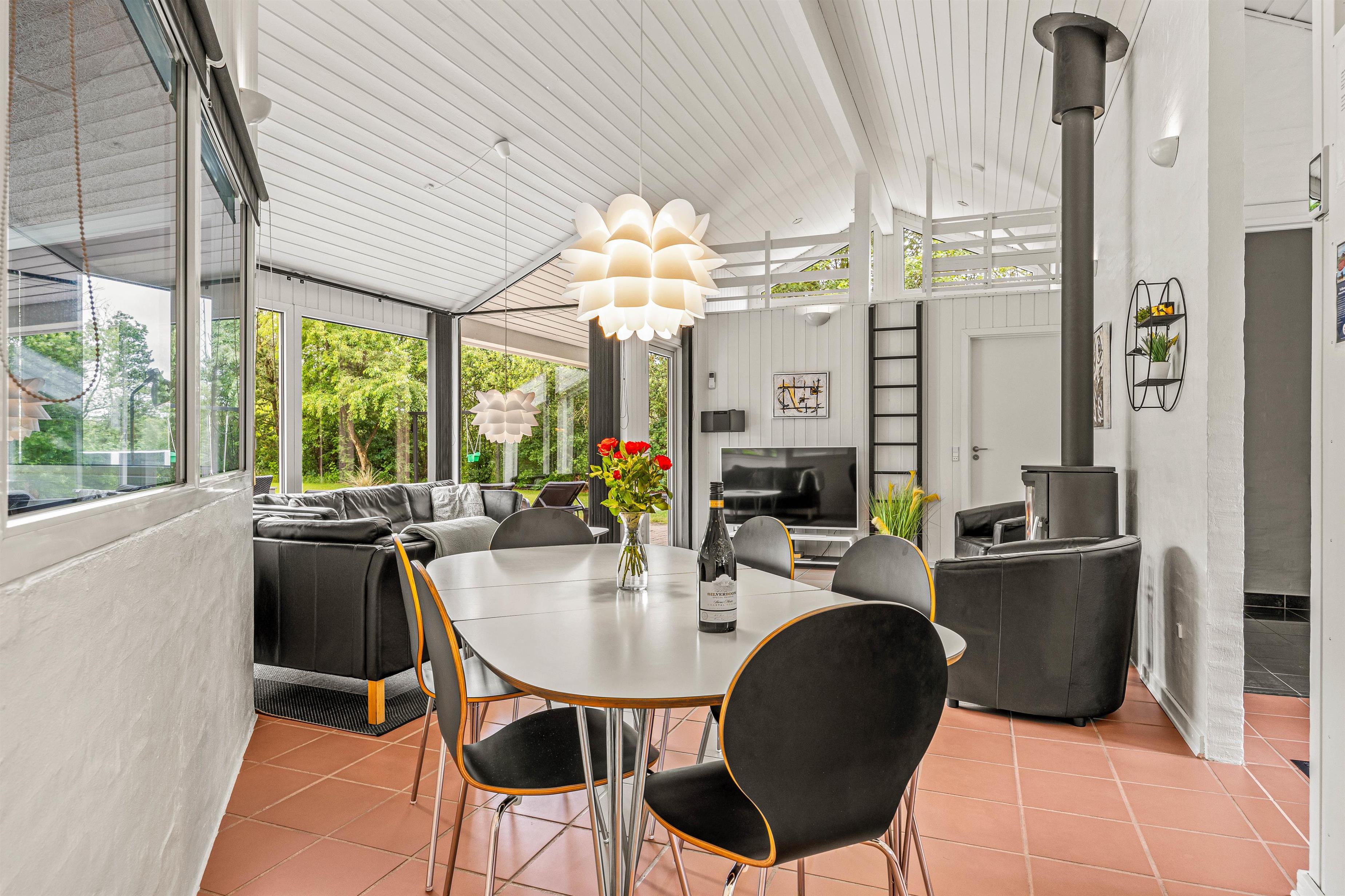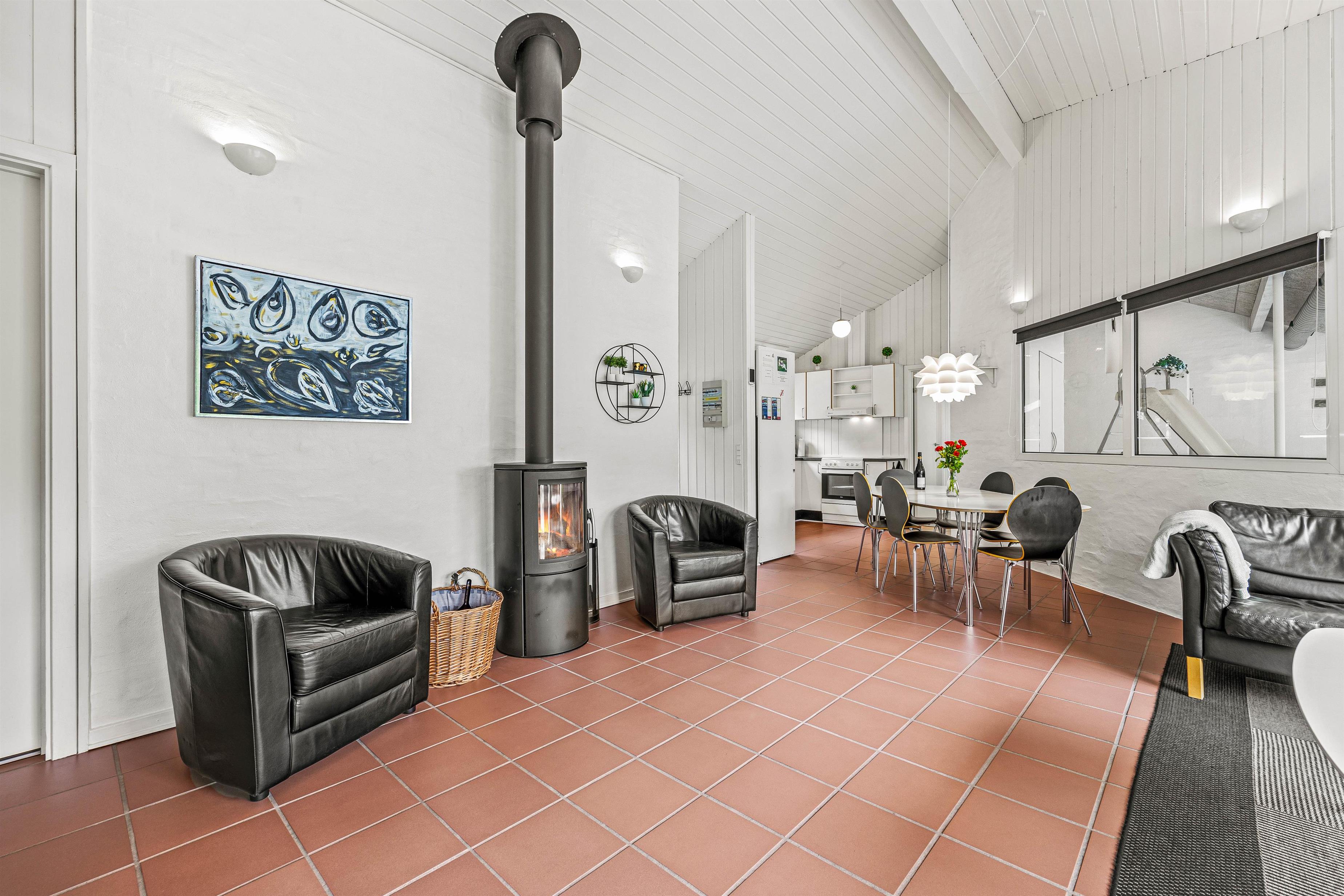 I stuen skaber den hyggelige brændeovn en varm atmosfære, perfekt til at nyde jeres yndlingsserier eller film via sommerhusets Chromecast.