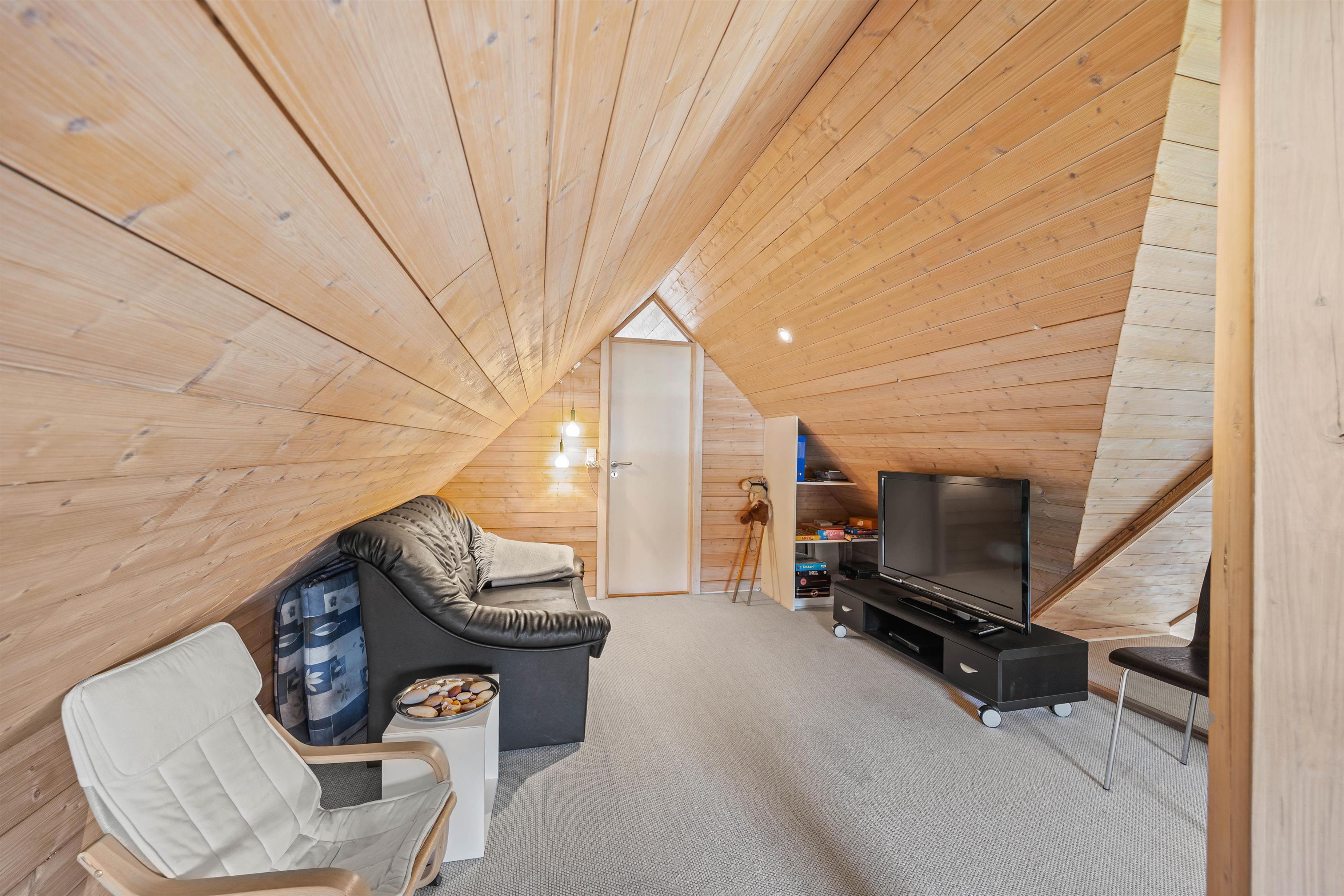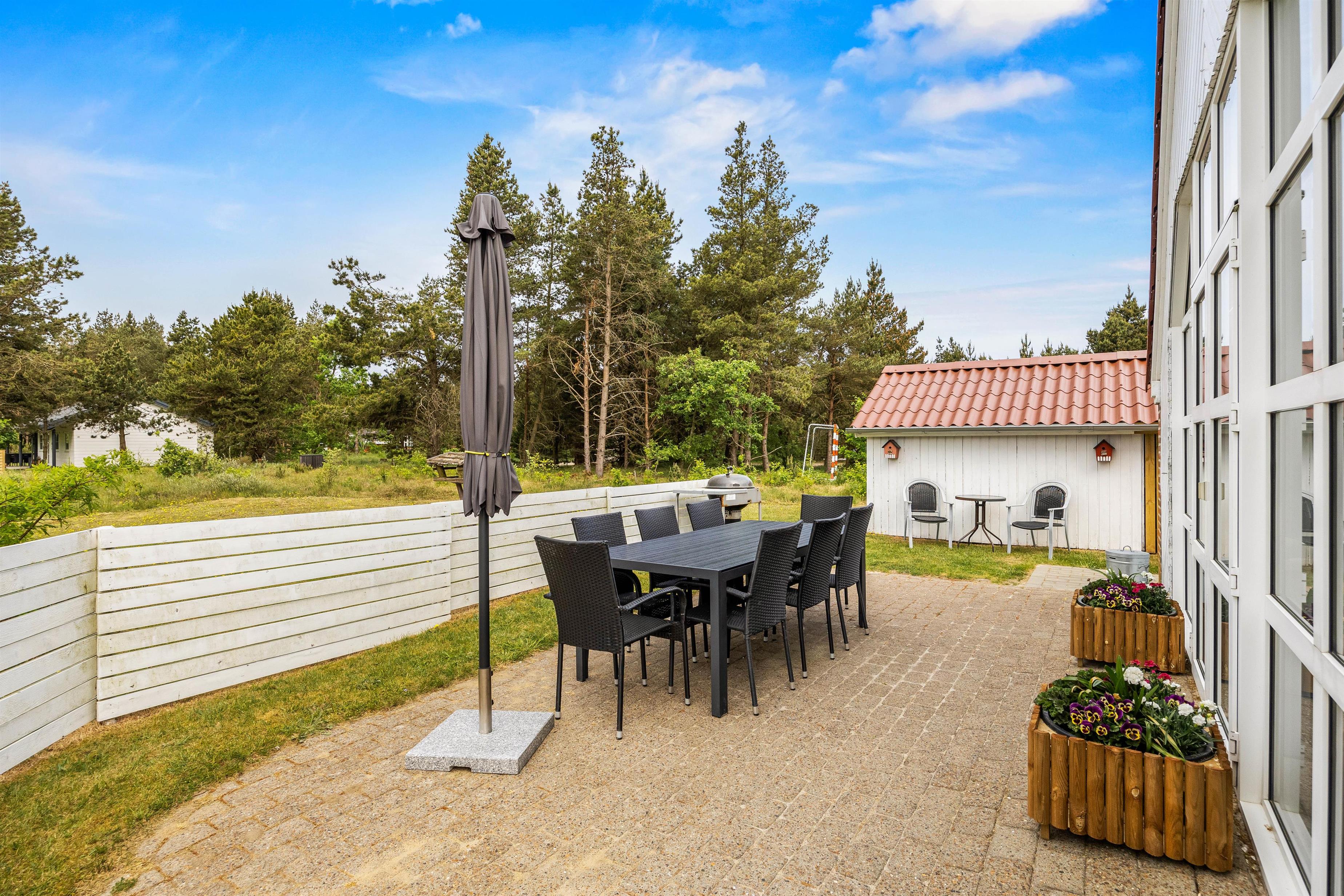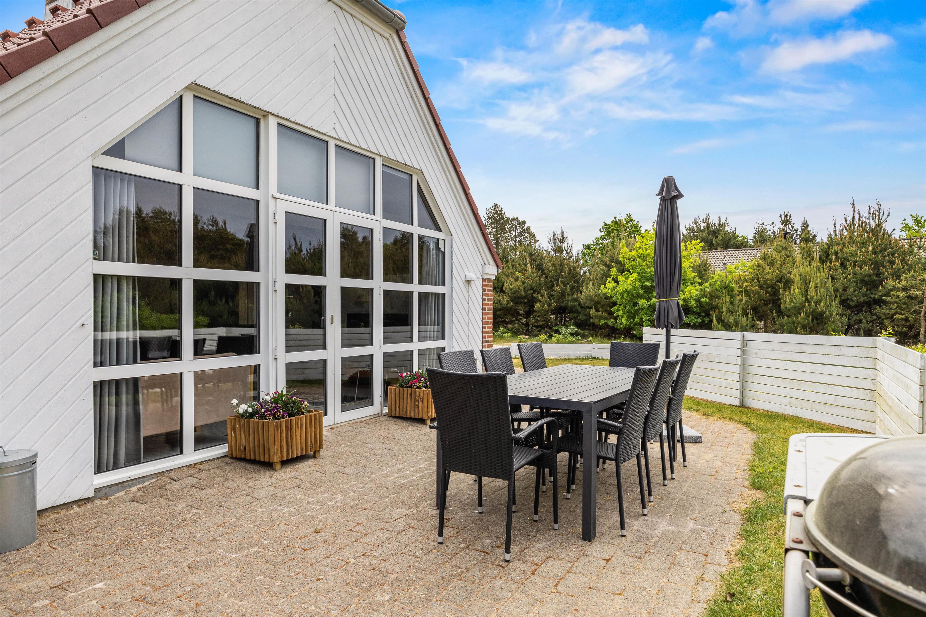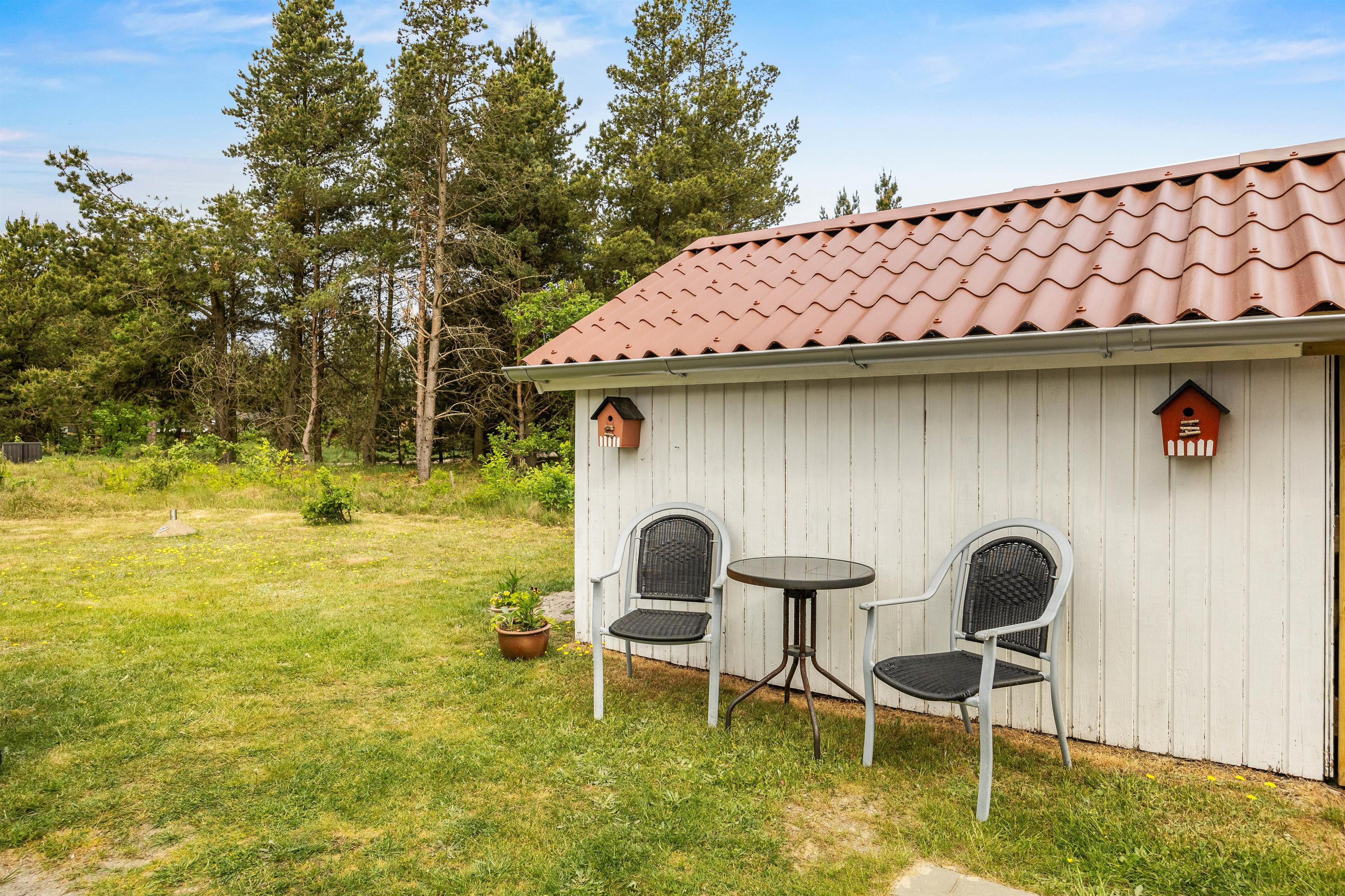 Fra stuen kan I træde ud på den delvist afskærmede terrasse, hvor der findes alt, hvad I behøver til en aften med mad under åben himmel. Her er både grill og komfortable havemøbler, så I kan nyde en dejlig middag i det fri. Omkring huset er der flere hyggelige kroge, så I altid har en plads i solen til morgenkaffen.